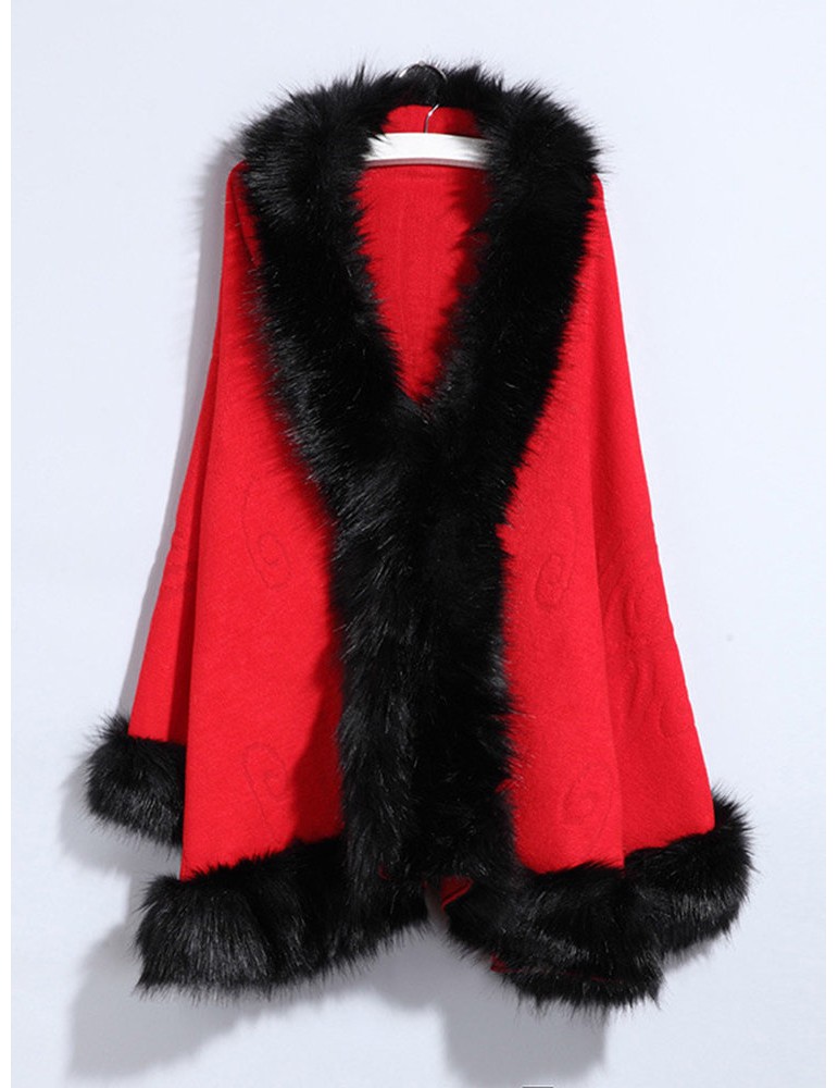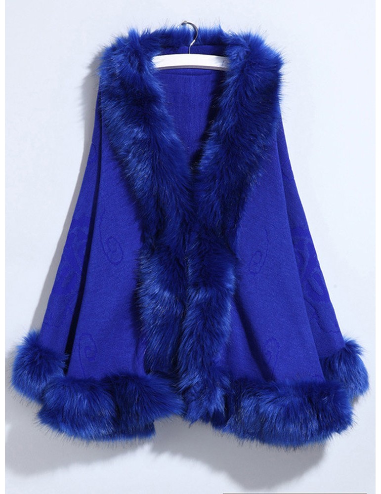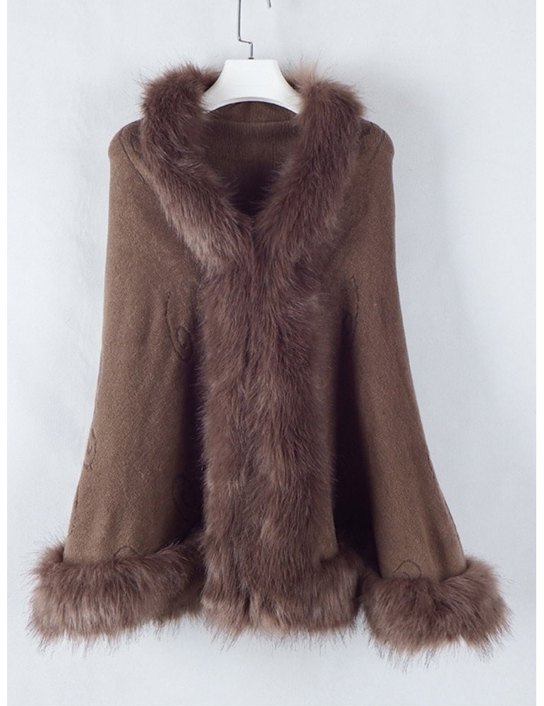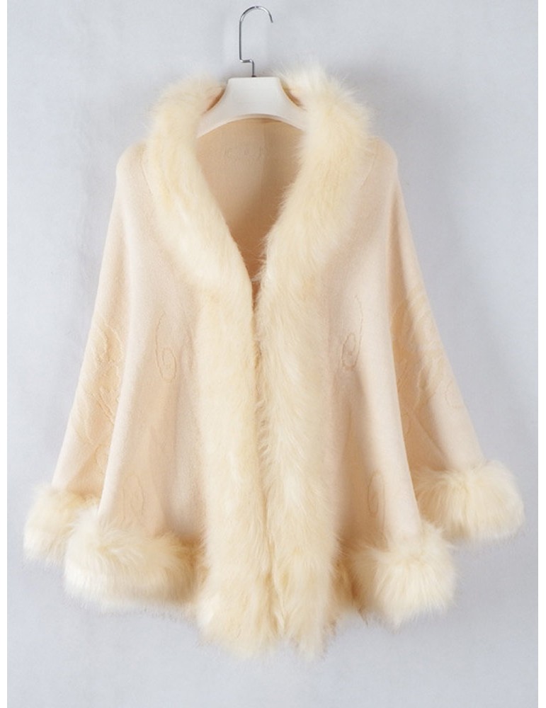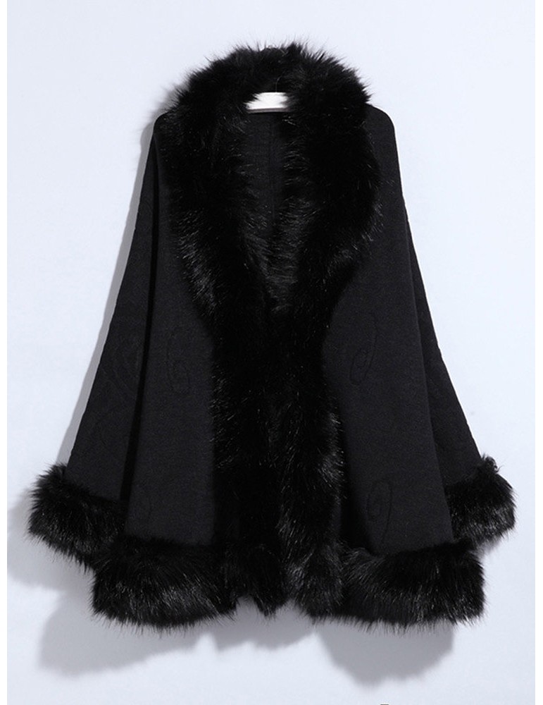 Women Faux Fur Collar Knitted Shawl Cloak Coats