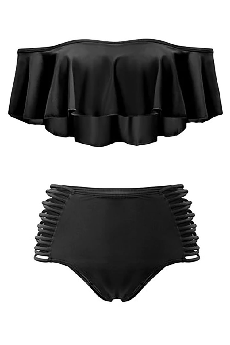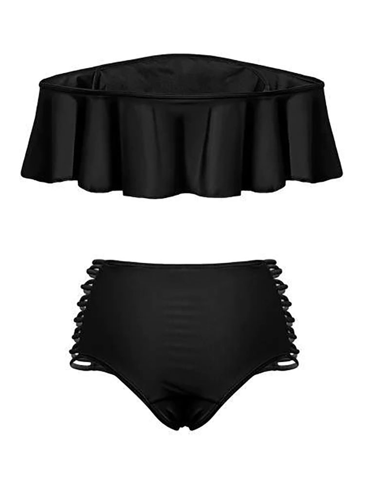 Solid Color Large Lotus Leaf Shoulder Wireless Tankini Swimwear For Women