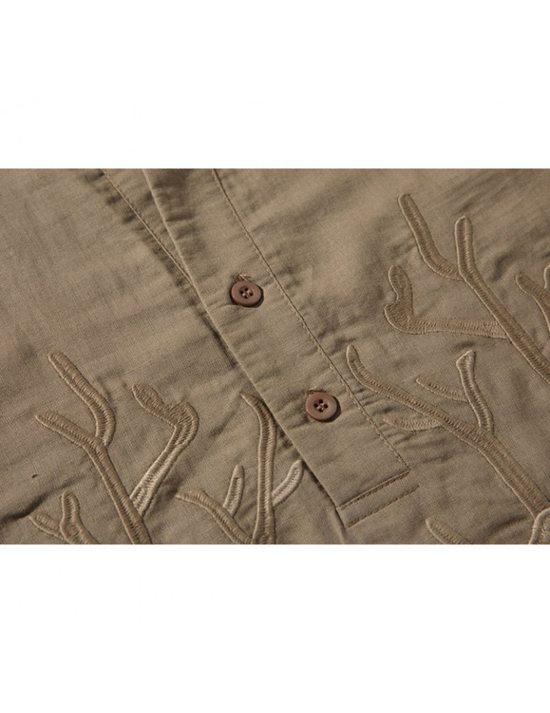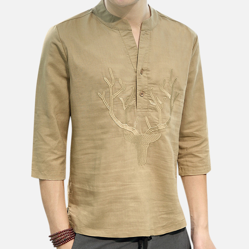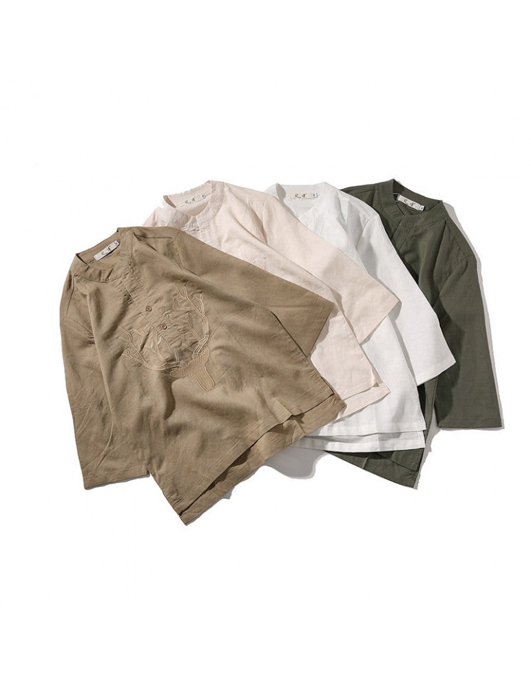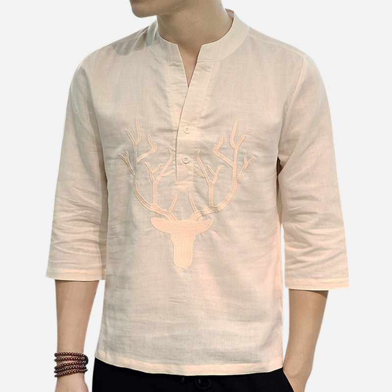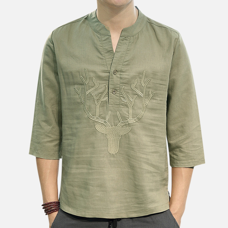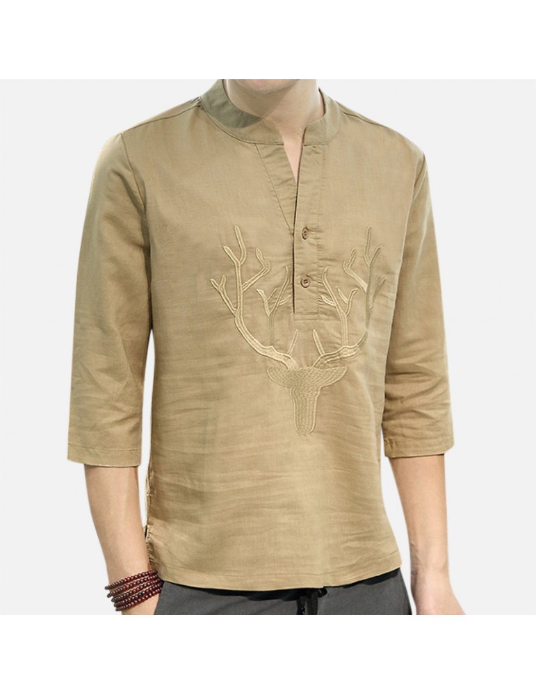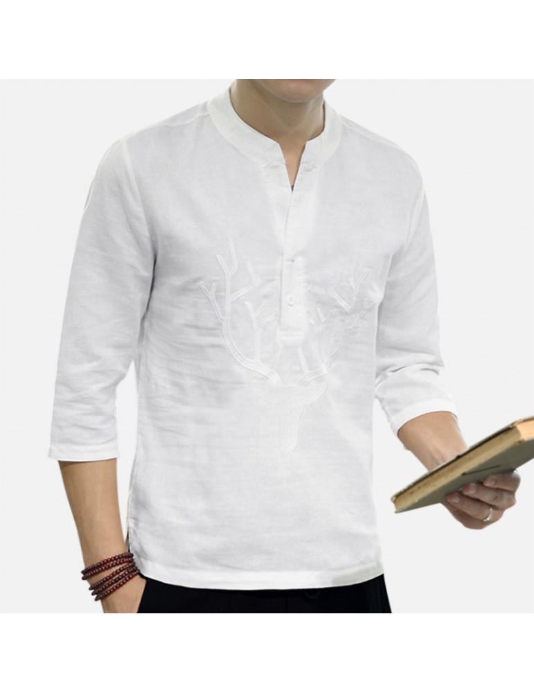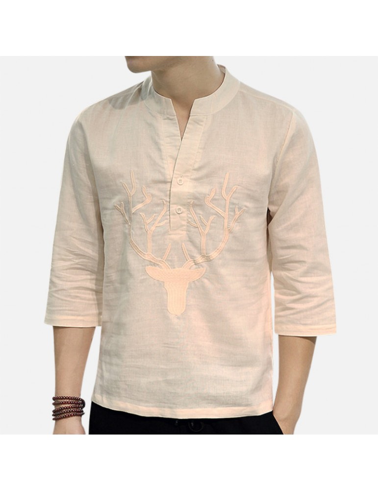 Men's Chinese Style T-shirt Summer Half-Sleeves V-neck Collar Embroidery Tops