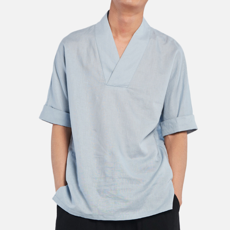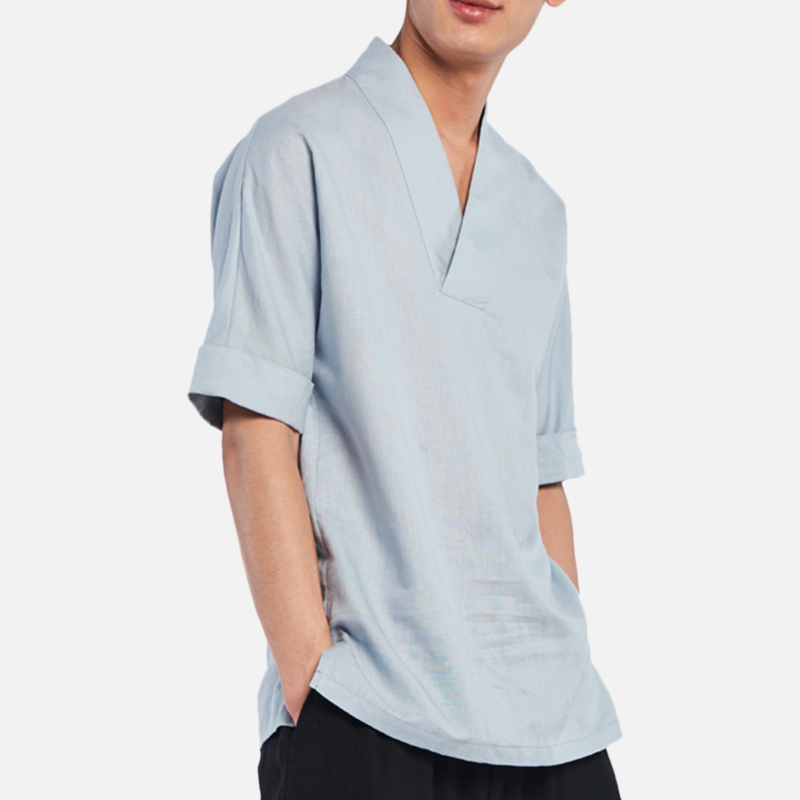 Men's Chinese Style Vintage Cotton Linen T-shirts V-neck Seven-point Sleeve Tops