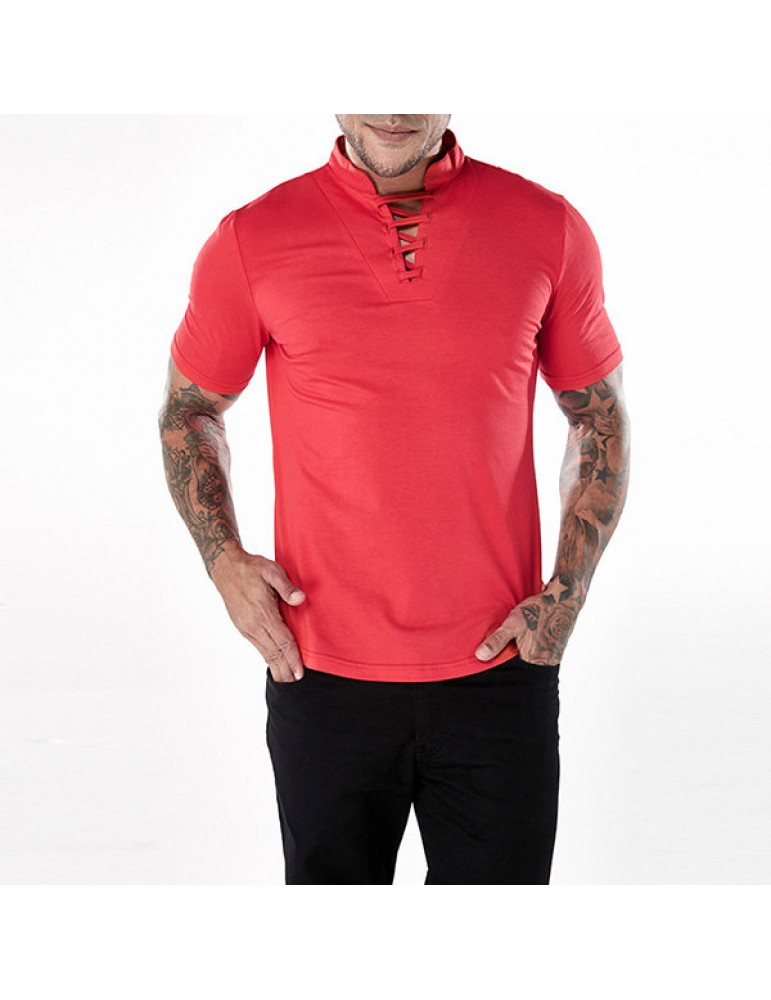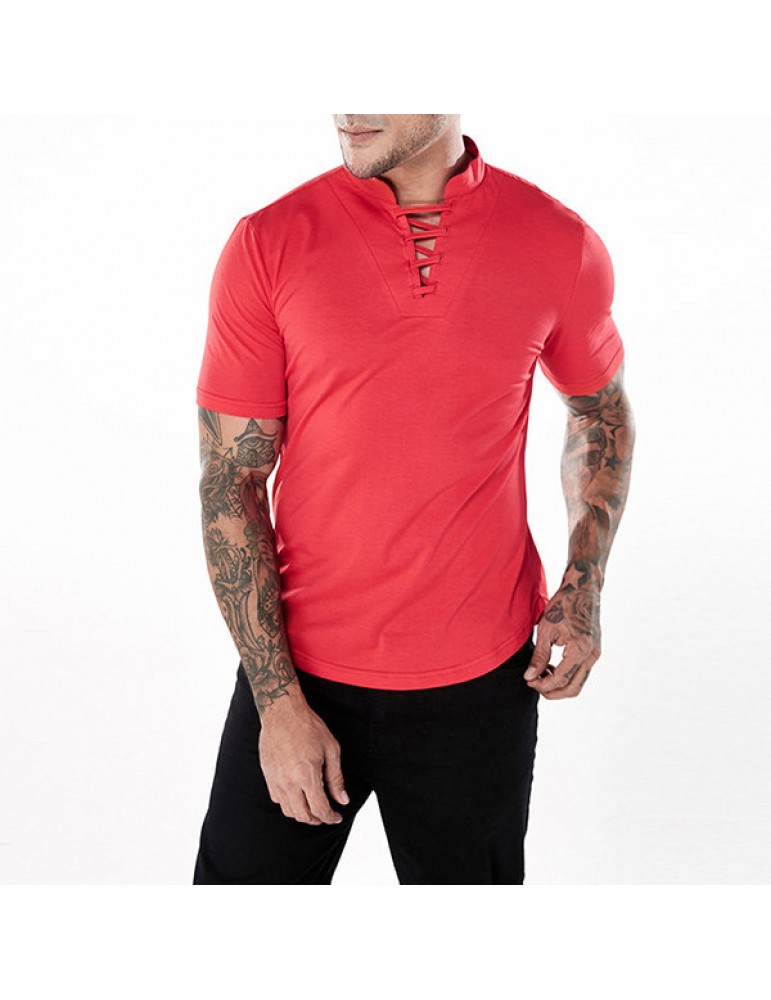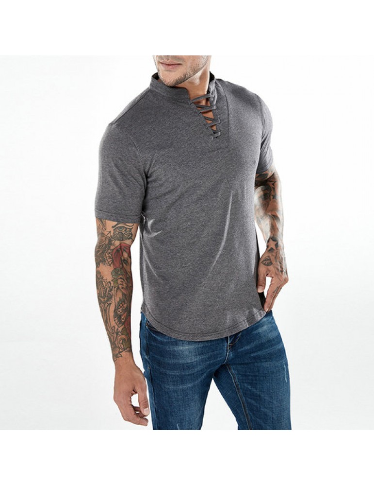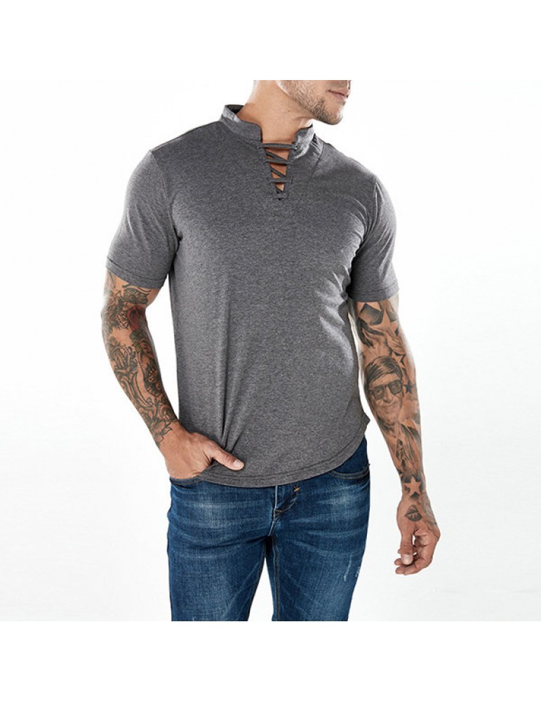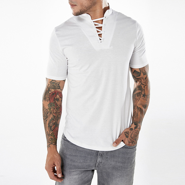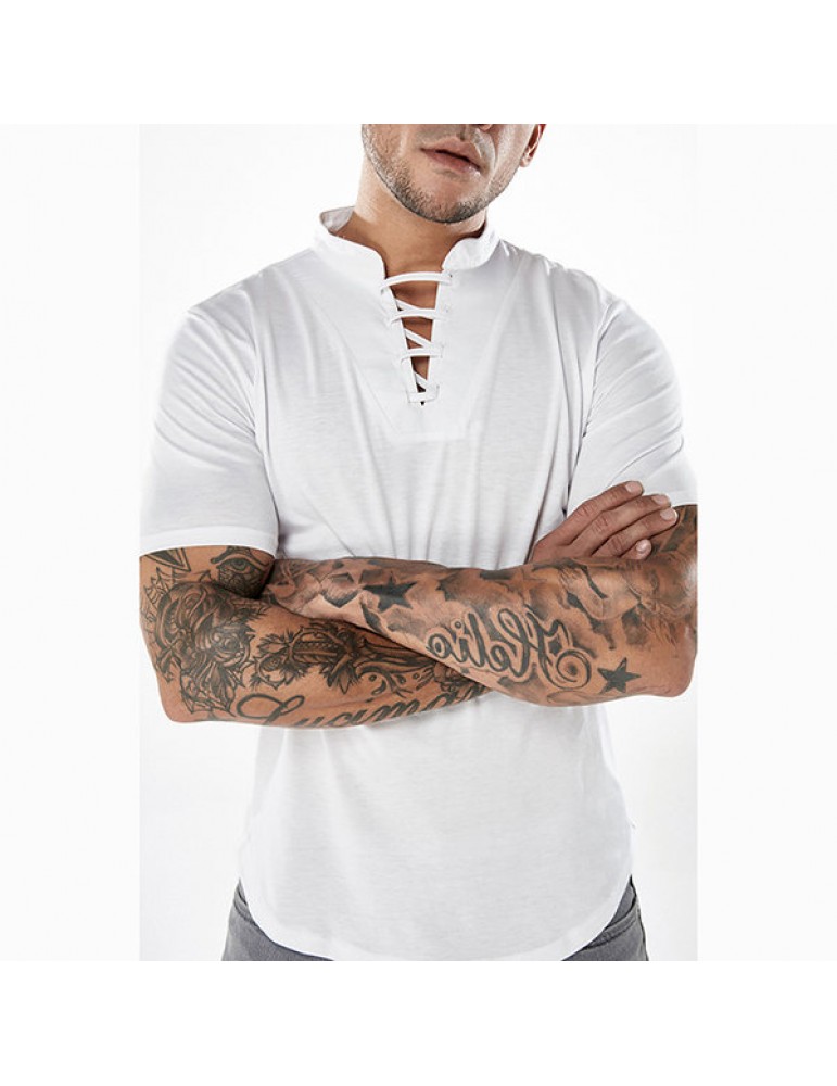 Mens Fashion Bust Bandages Tees V-neck Short Sleeve Regular Fit Casual Cotton T Shirts