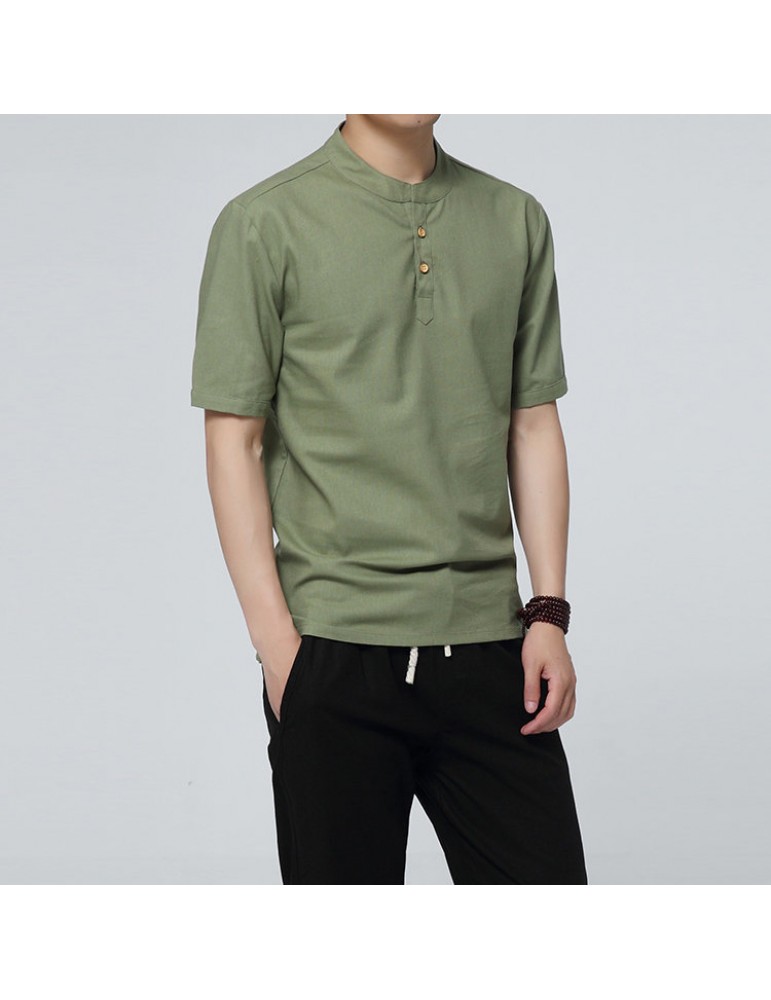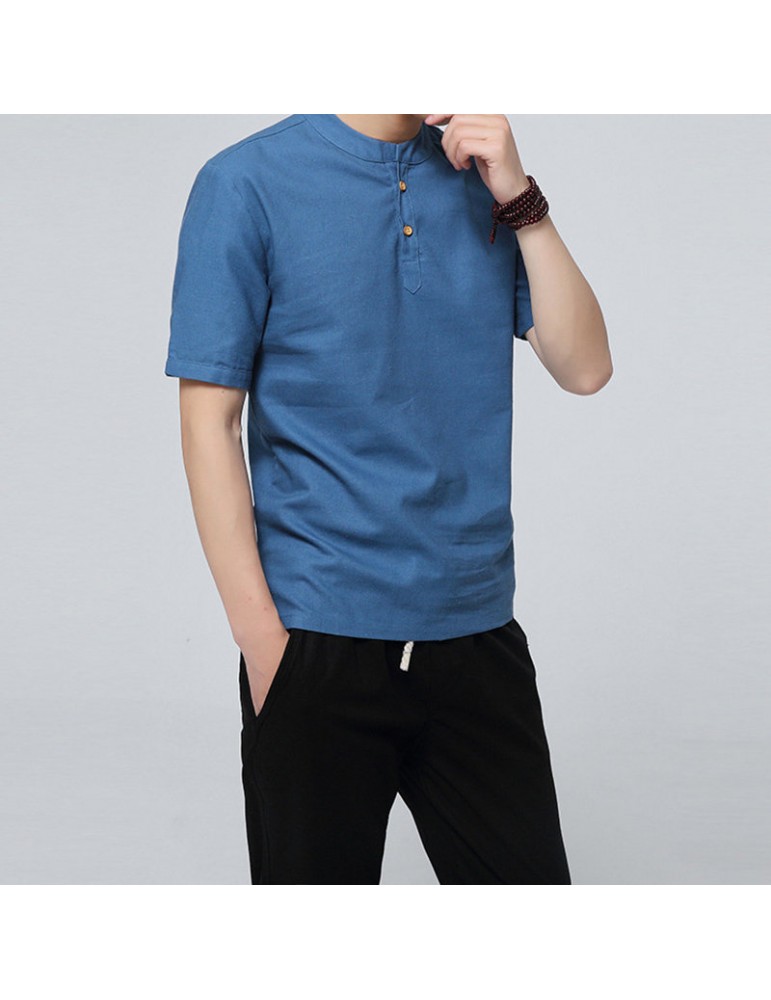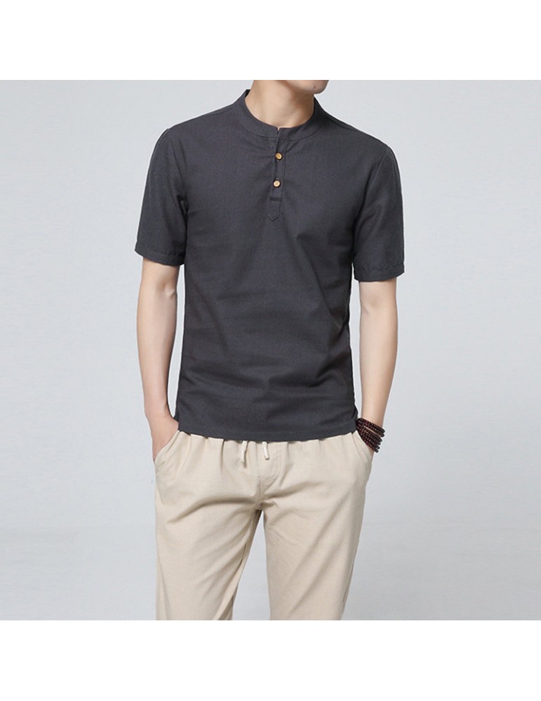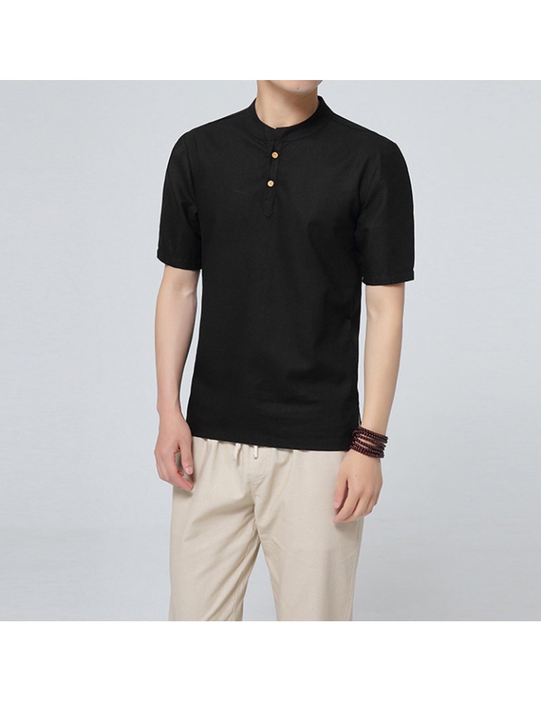 Mens Cotton Linen Chinese Style Retro Solid Color Stand Collar Summer Casual T Shirts