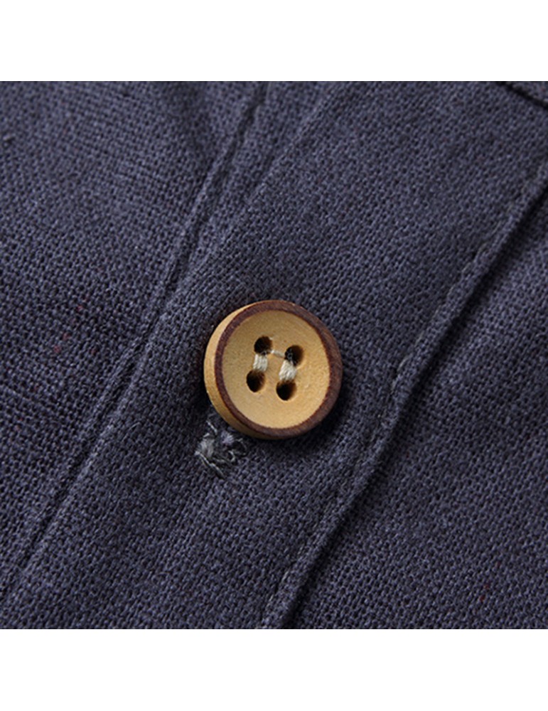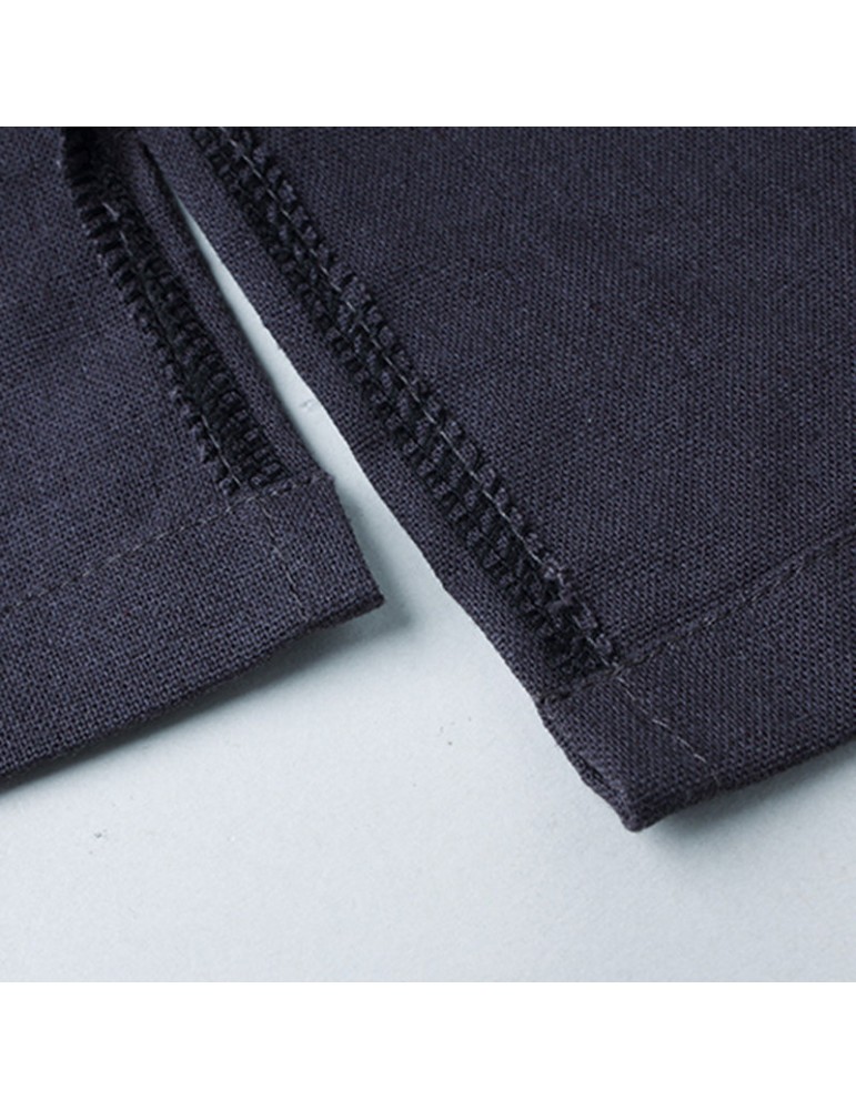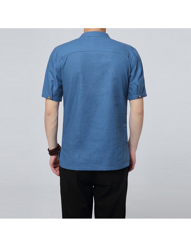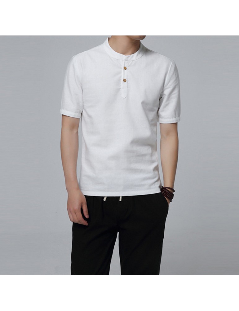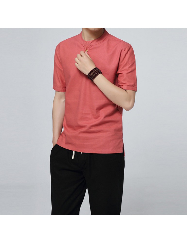 Mens Cotton Linen Chinese Style Retro Solid Color Stand Collar Summer Casual T Shirts