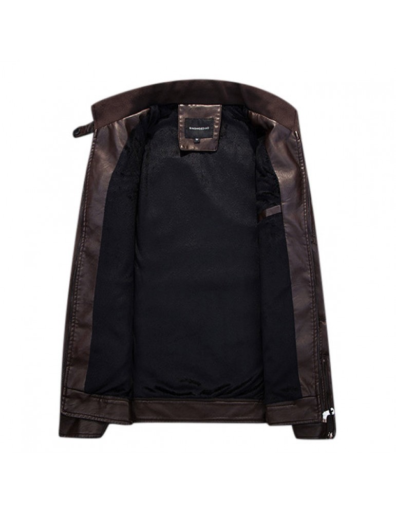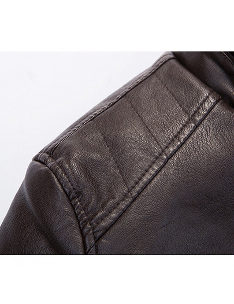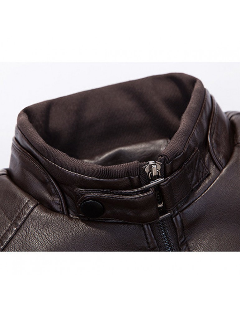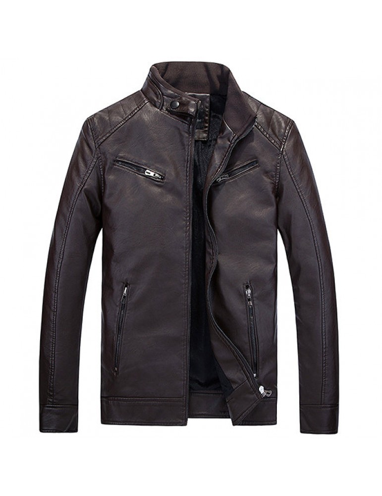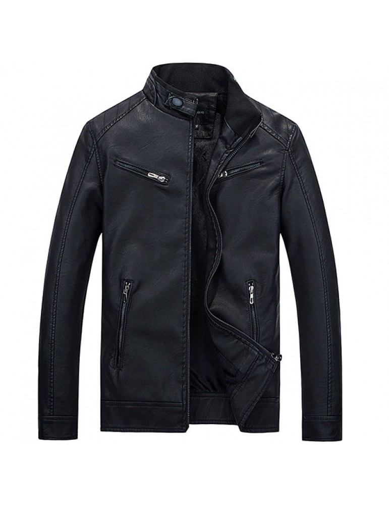 Thick Fleece Motorcycle PU Leather Double Chest Pockets Buckle Stand Collar Jacket For Men