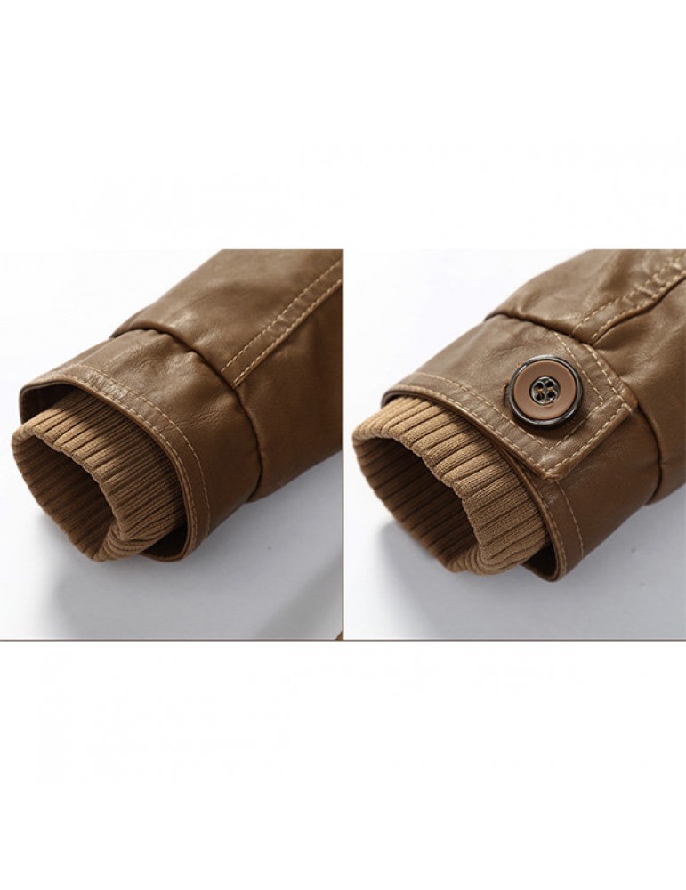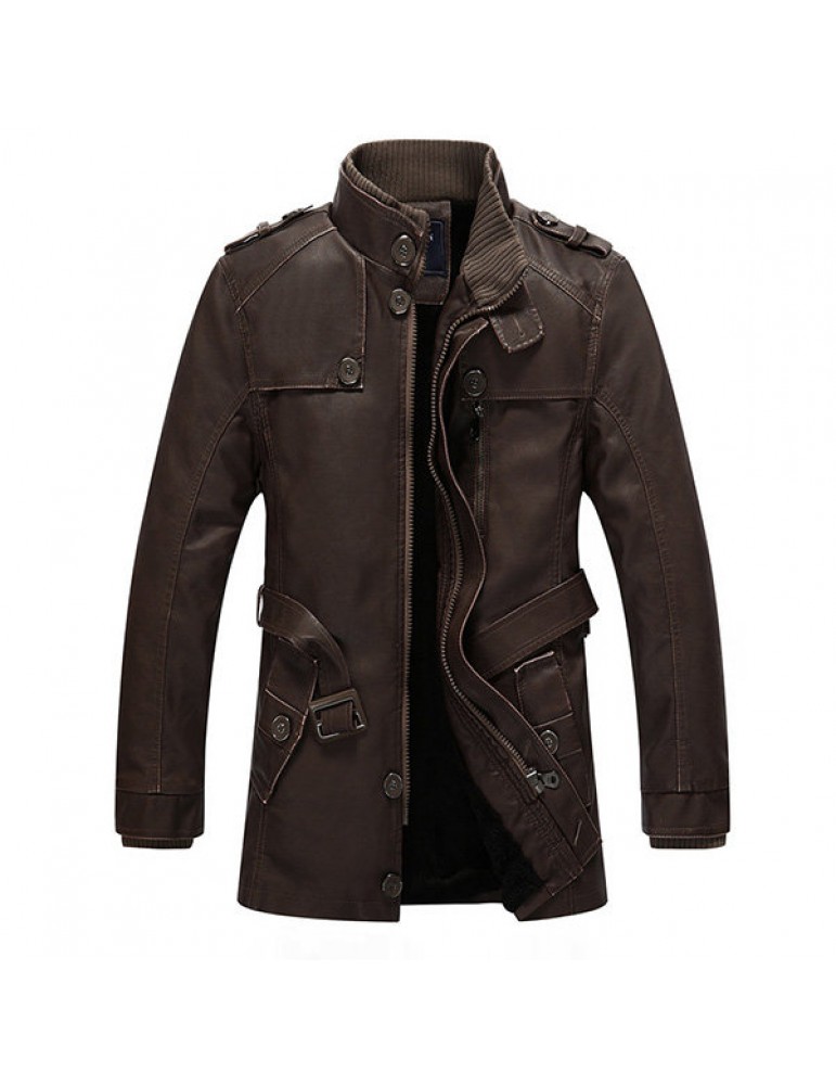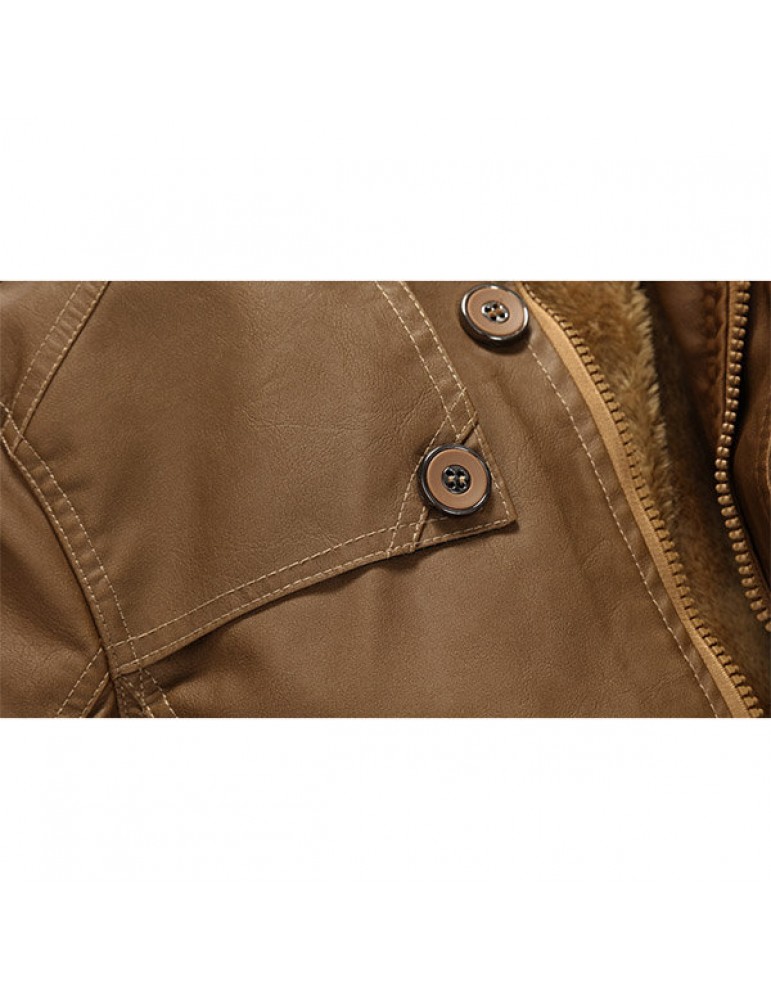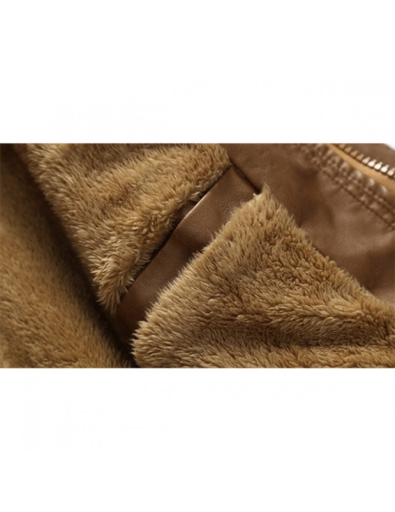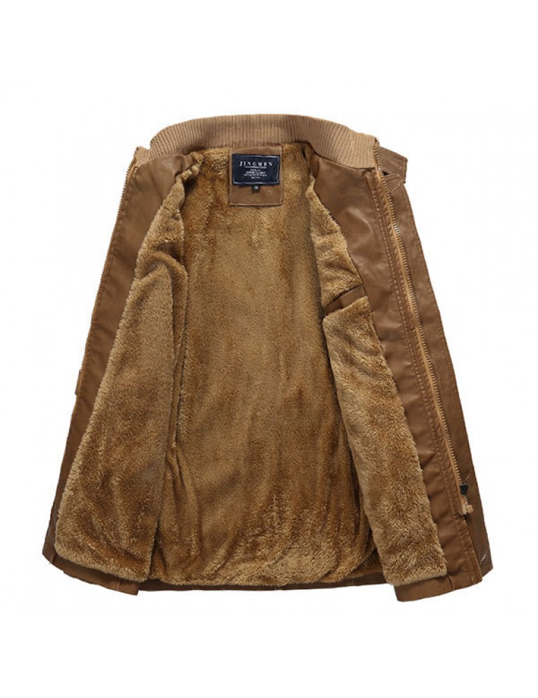 Mens Fashion Stand Collar Jacket PU Leather Fluffy Lined Warm Slim Fit Coat