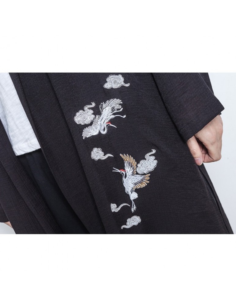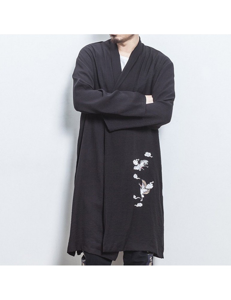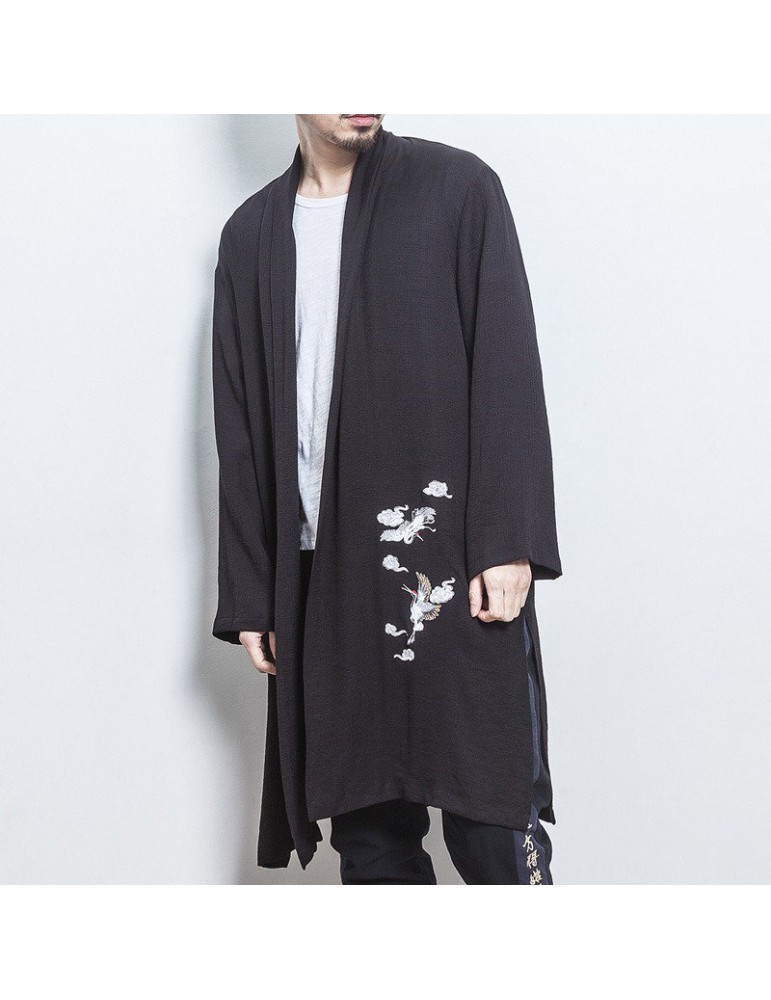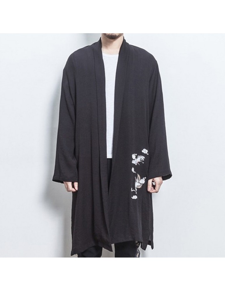 Mens Mid-long Crane Embroidered National Style Long Sleeve Open Up Black Casual Jacket