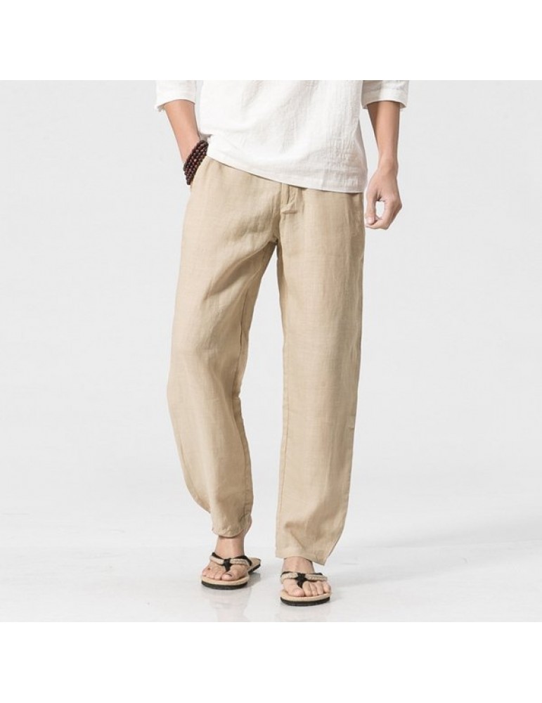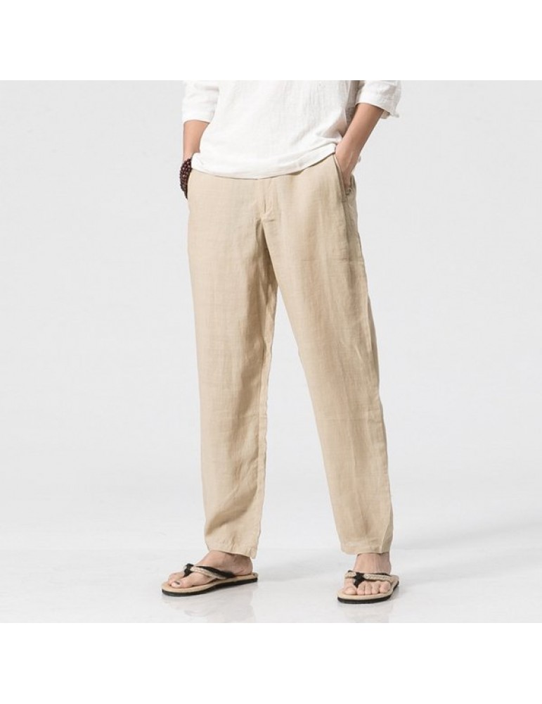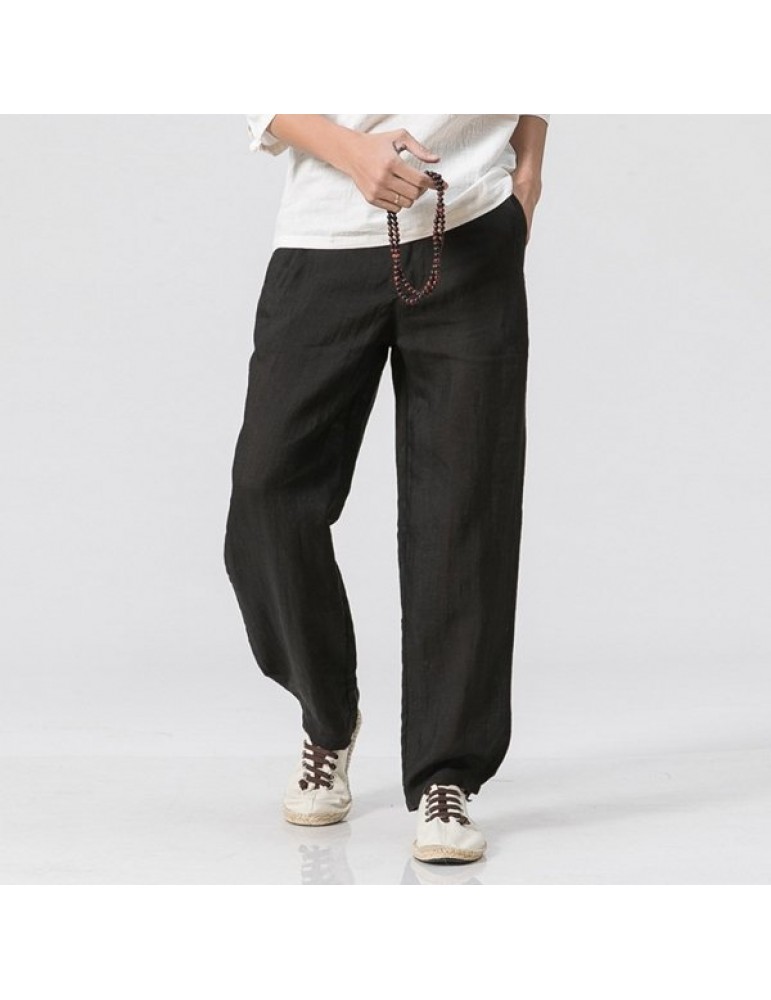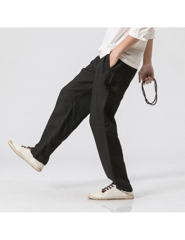 Mens Cotton Linen Breathable Loose Pants Zip Fly Elastic Waist Solid Color Casual Pants