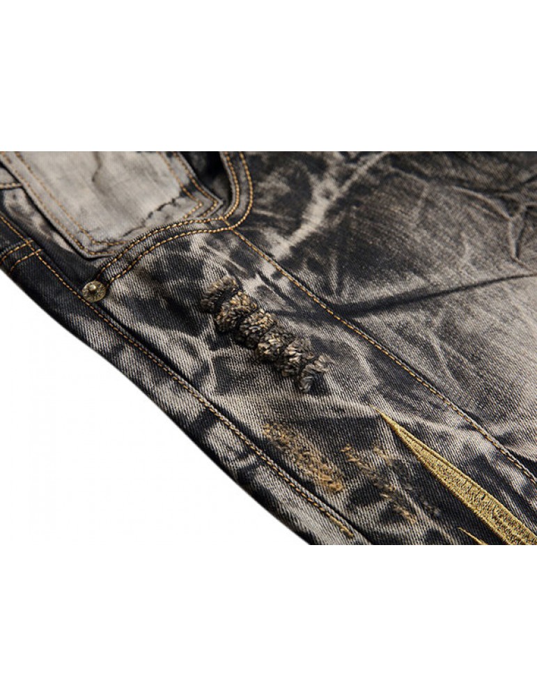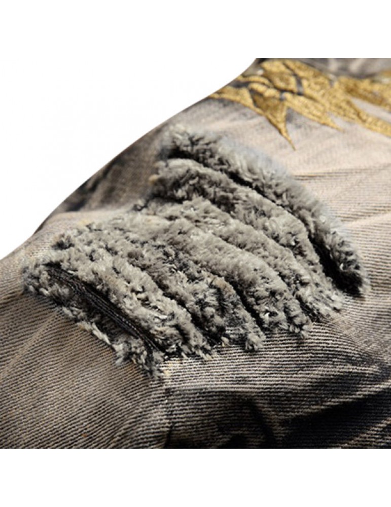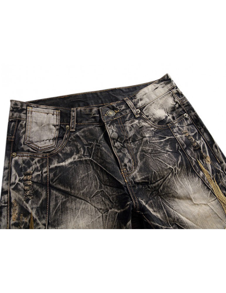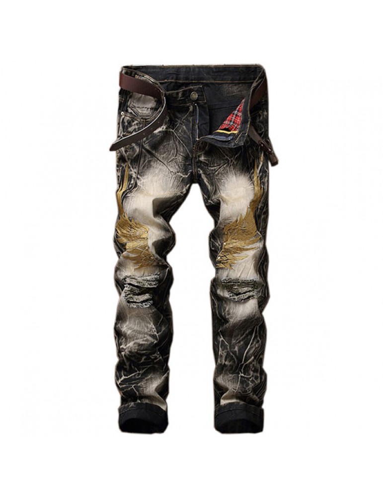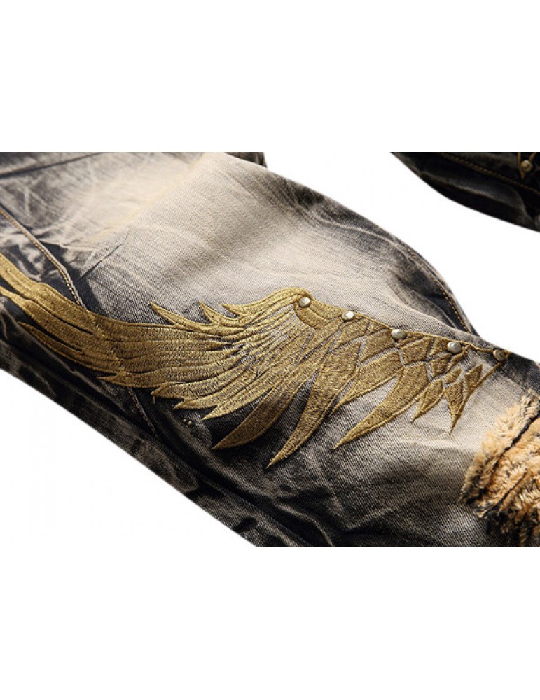 Casual Vintage Holes Embroidered Wings Stone Washed Jeans for Men