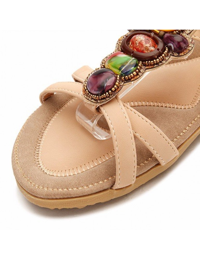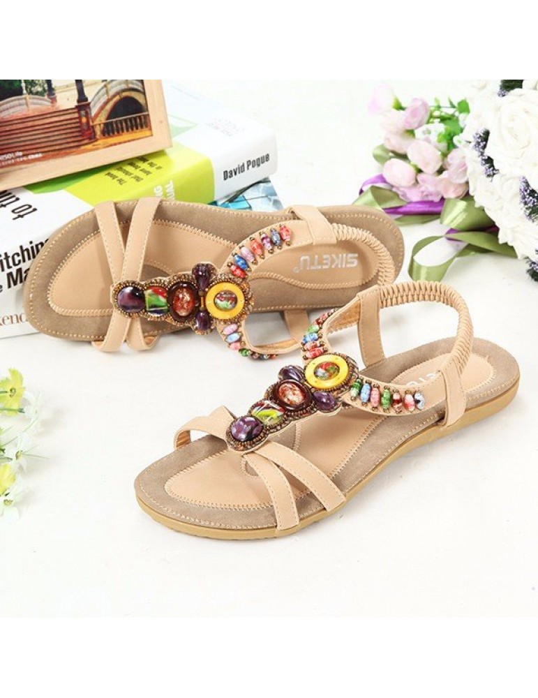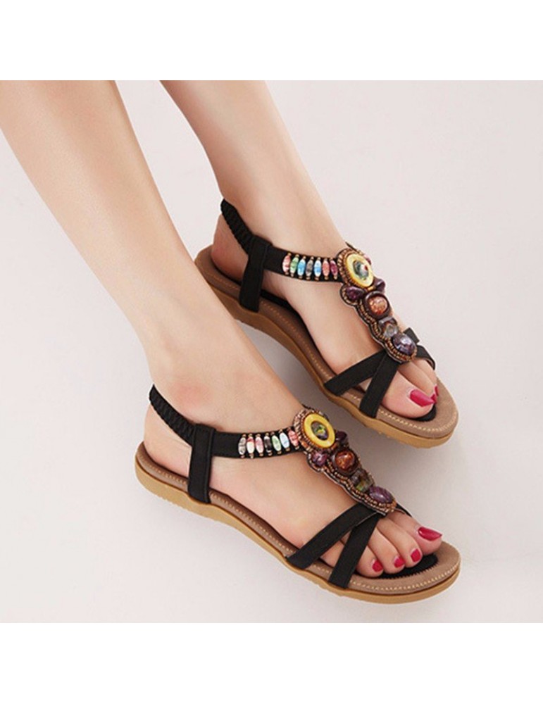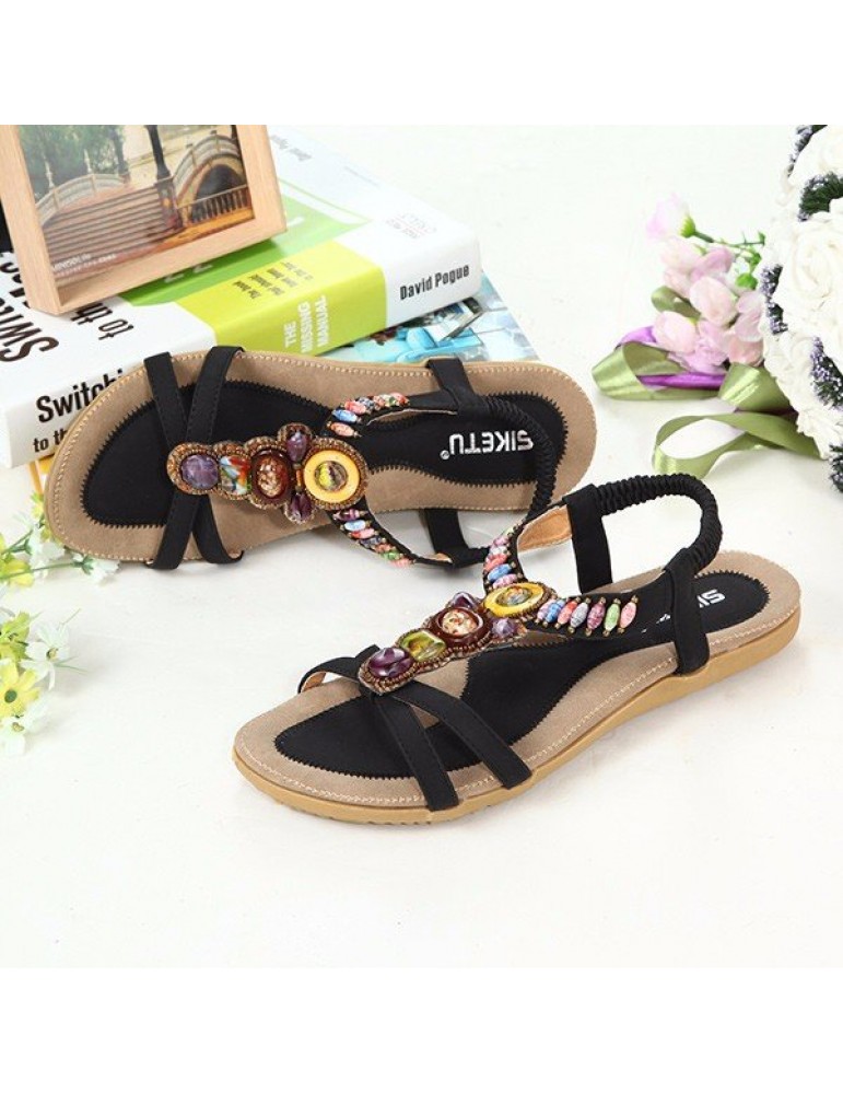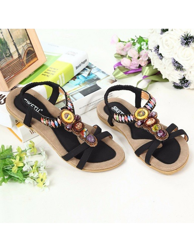 Big Size Bohemia Beaded Rhinestone Peep Toe Fish Mouth Flat Sandals