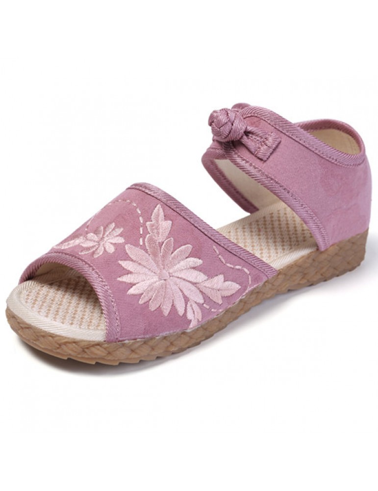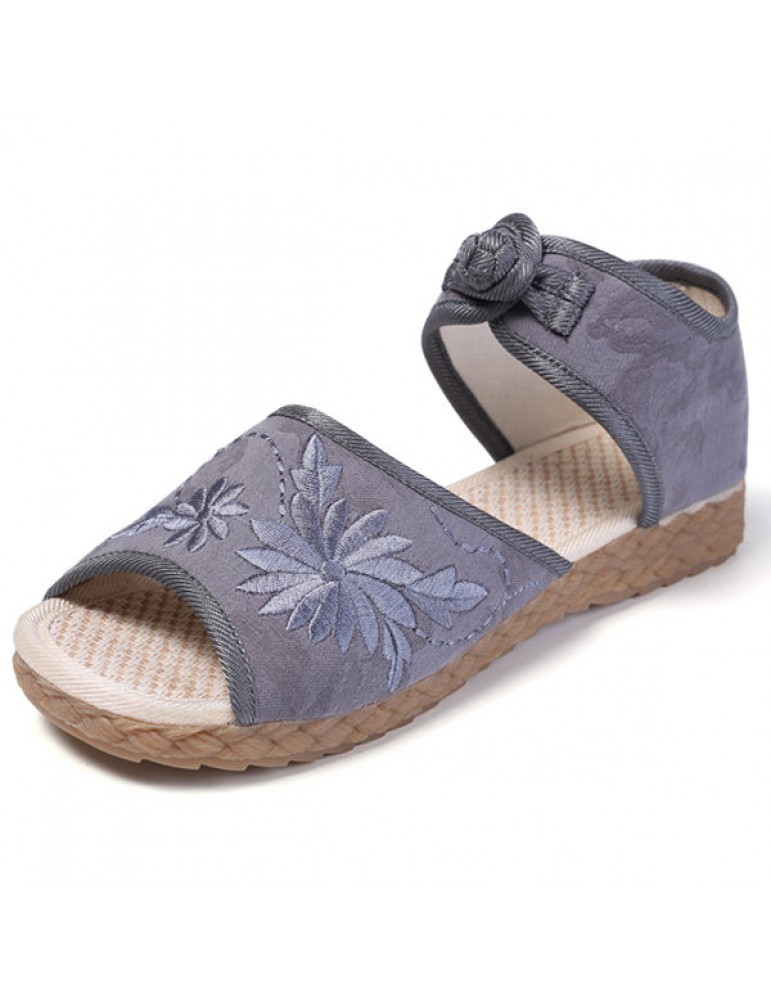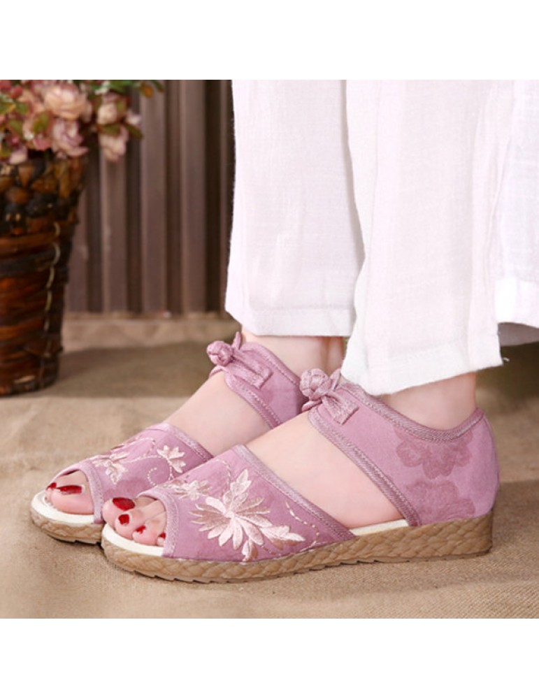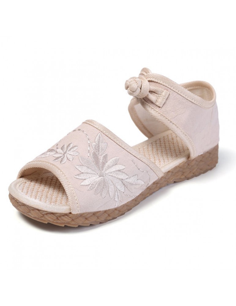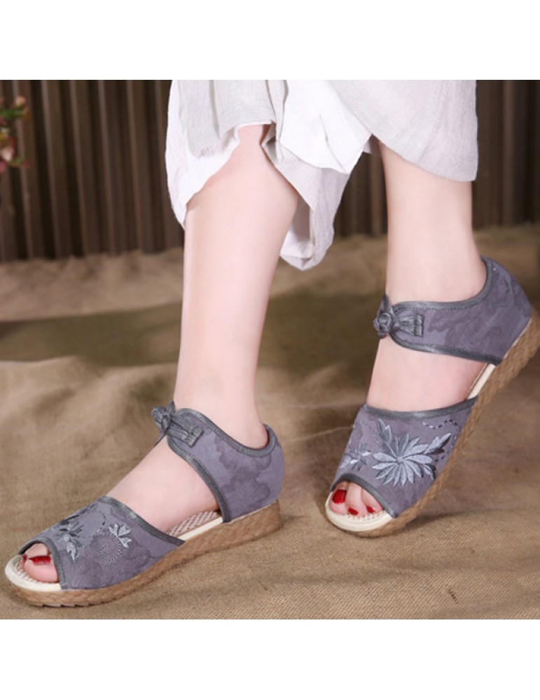 Women Folkways Casual Cotton Flowers Embroidered Peep Toe Buckle Flats