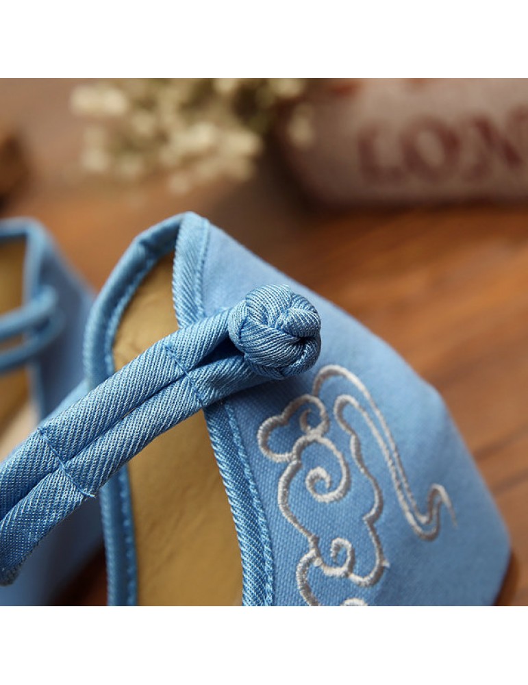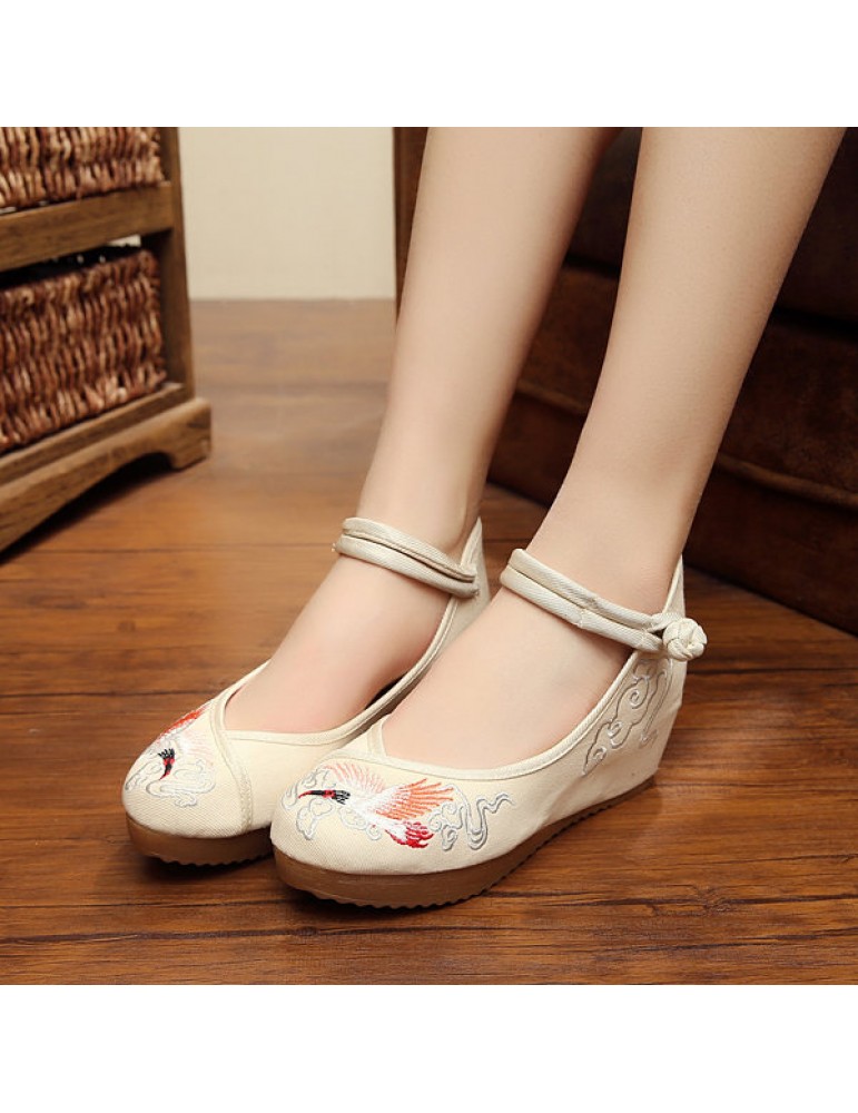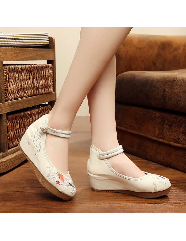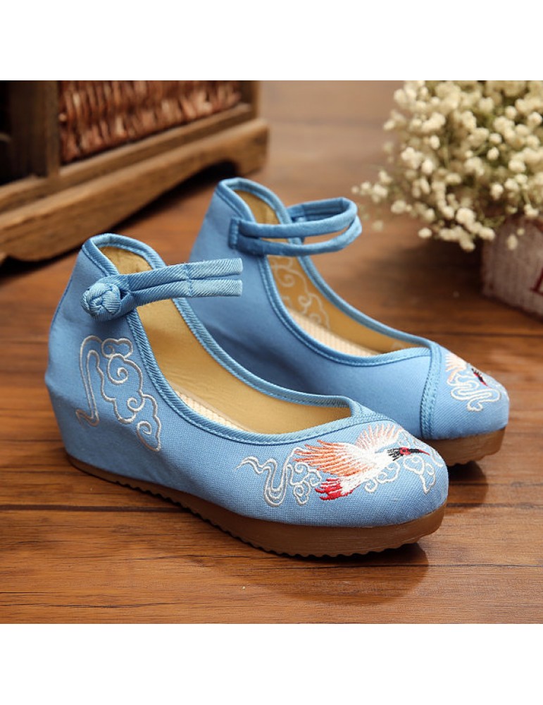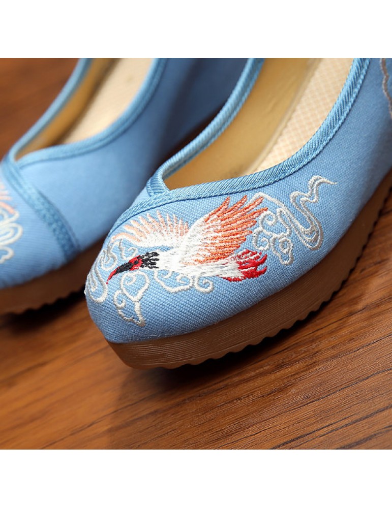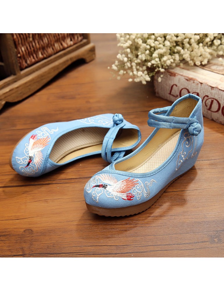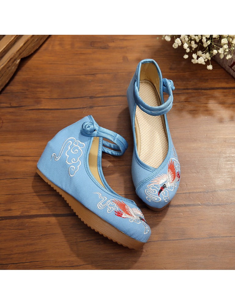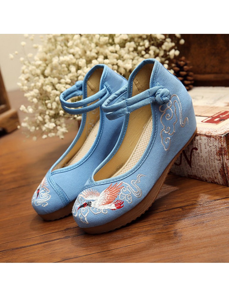 Crane Cloud Embroidery Chinese Knot National Wind Lace Up Wedge Heel Shoes