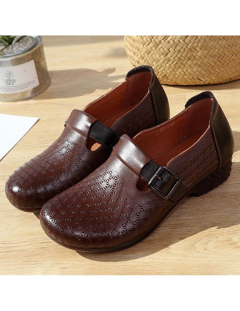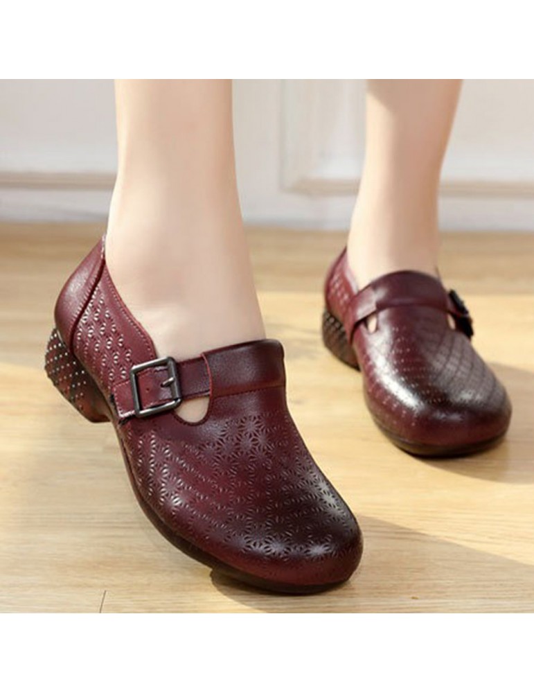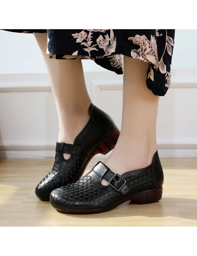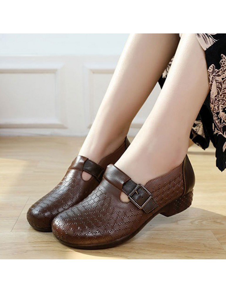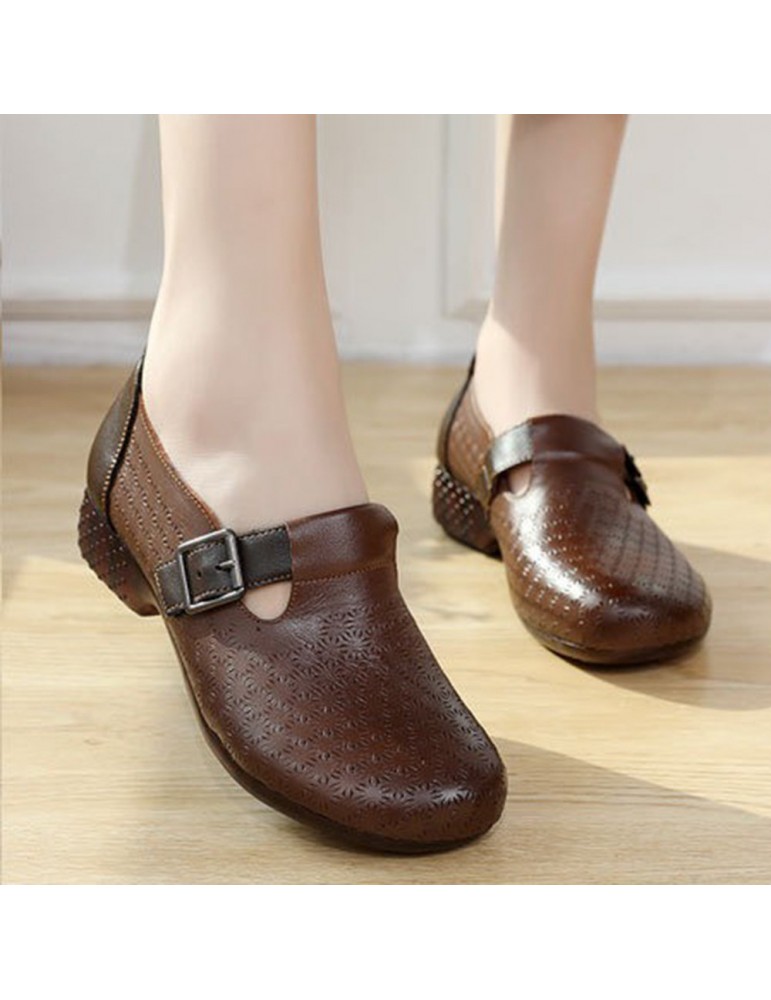 Women Casual Soft Breathable Hollow Buckle Genuine Leather Shoes