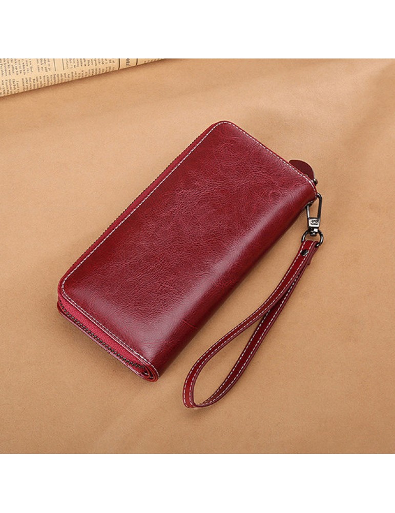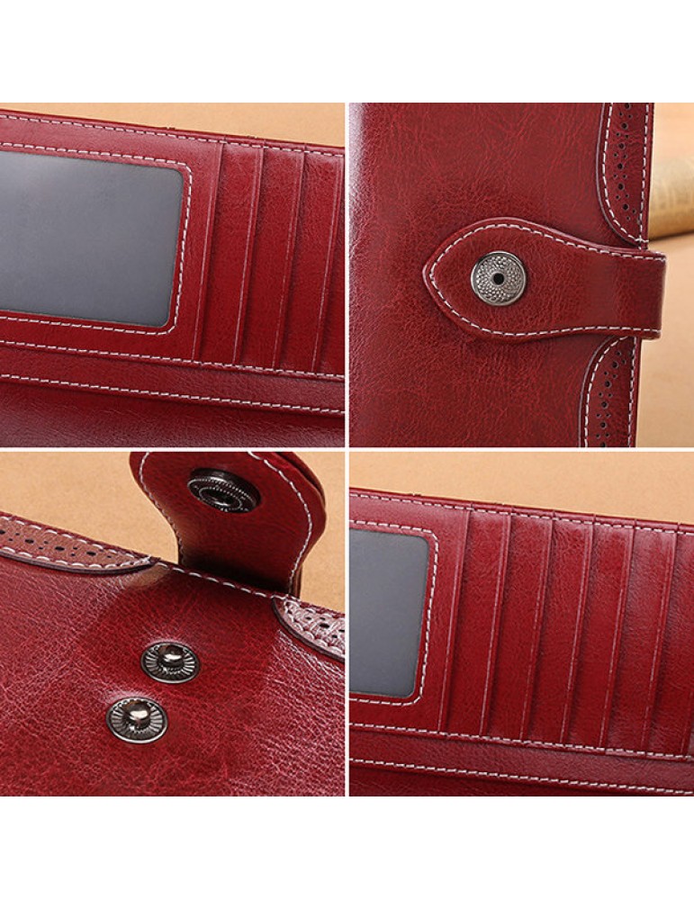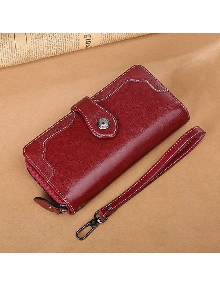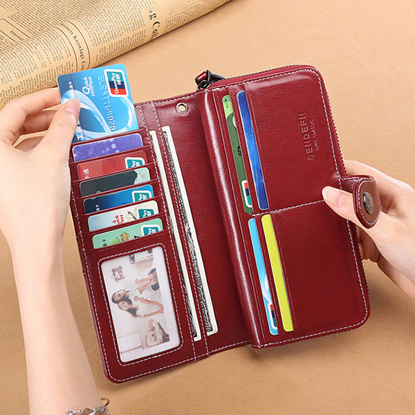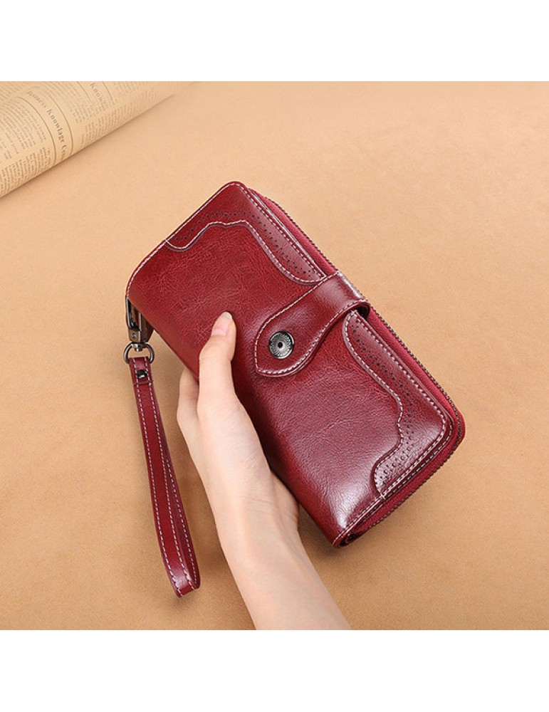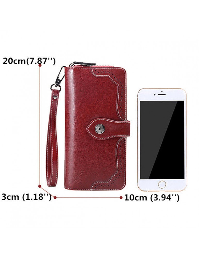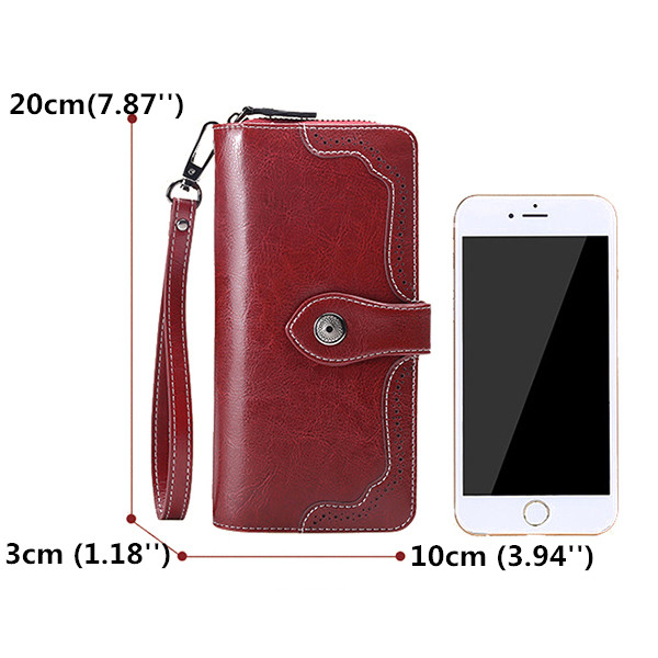 Women Bifold Oil Wax Genuine Leather Long Wallet 10 Card Slot Phone Purse Vintage Coin Bag