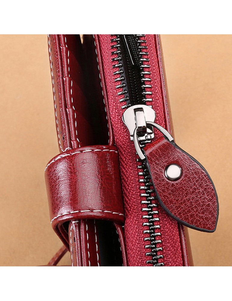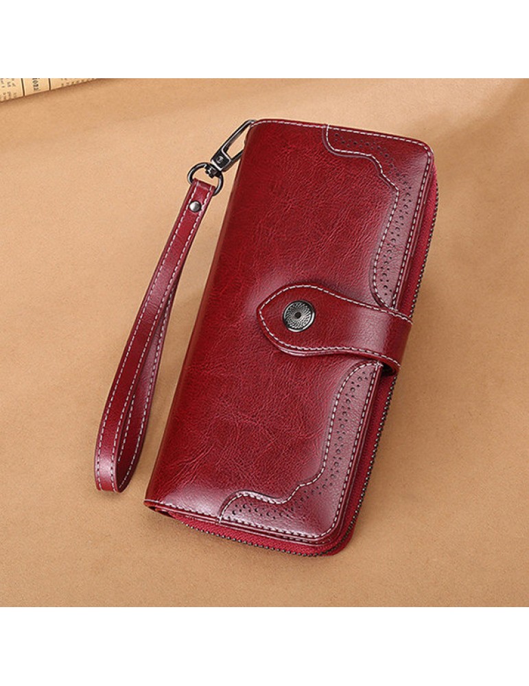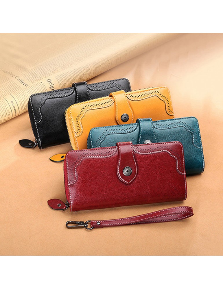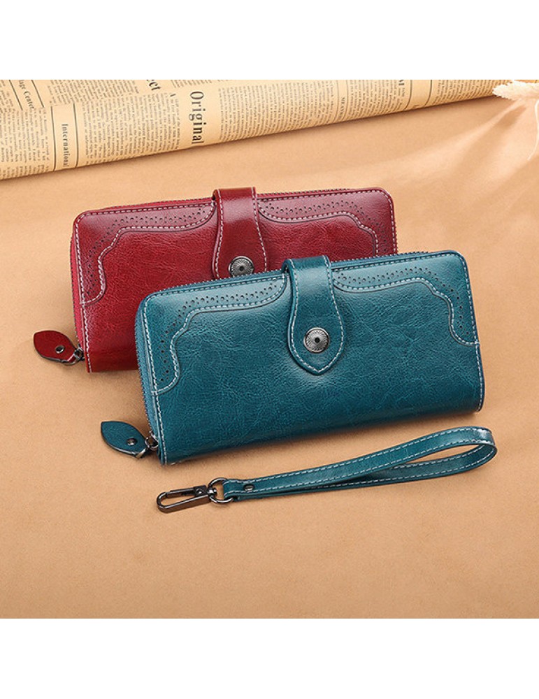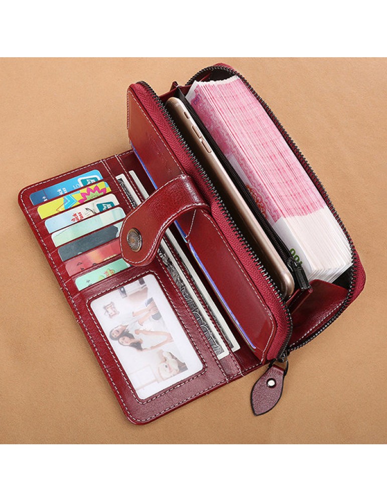 Women Bifold Oil Wax Genuine Leather Long Wallet 10 Card Slot Phone Purse Vintage Coin Bag