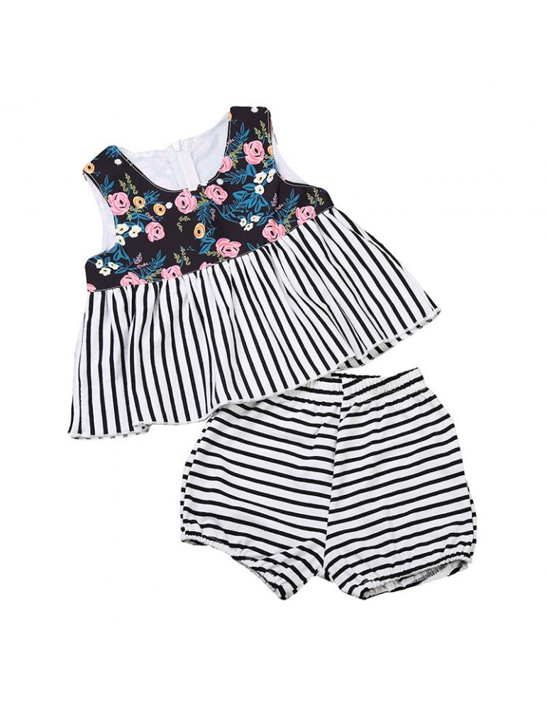 2pcs Flower Striped Printed Girls Summer Short Clothing Set For 6-48M