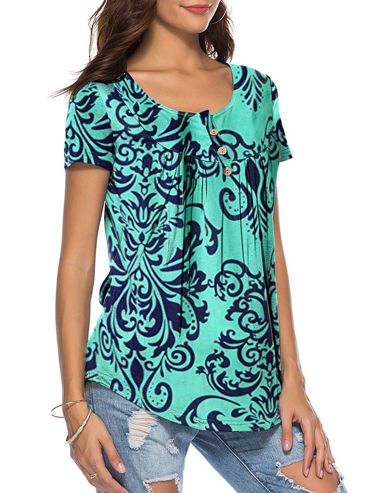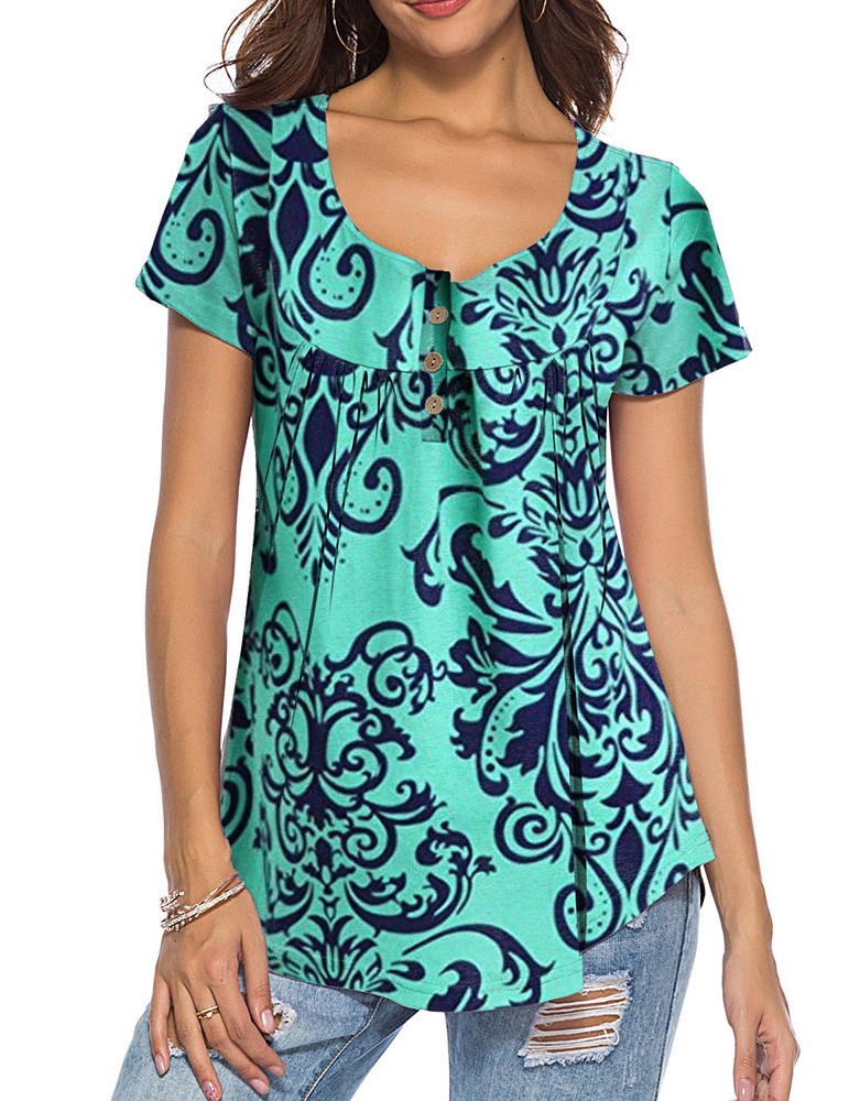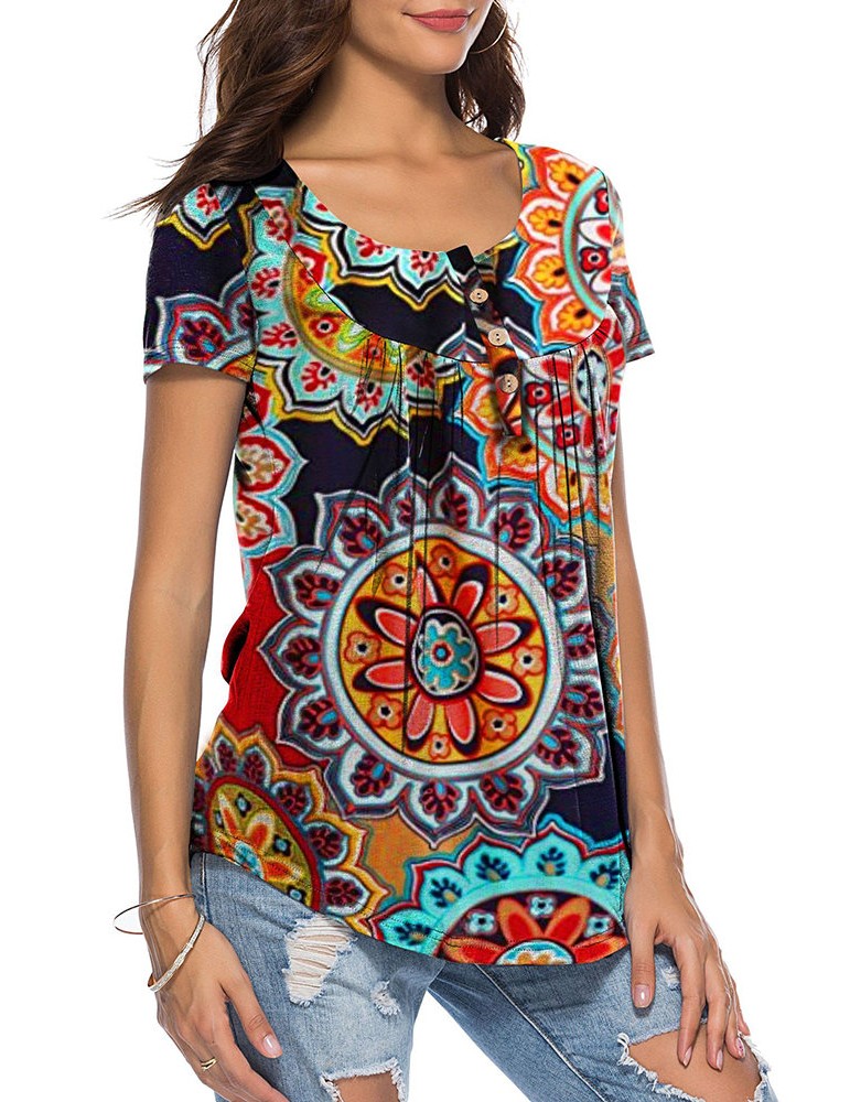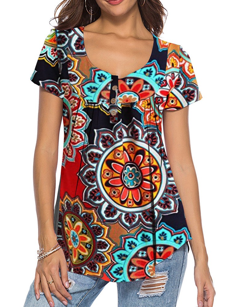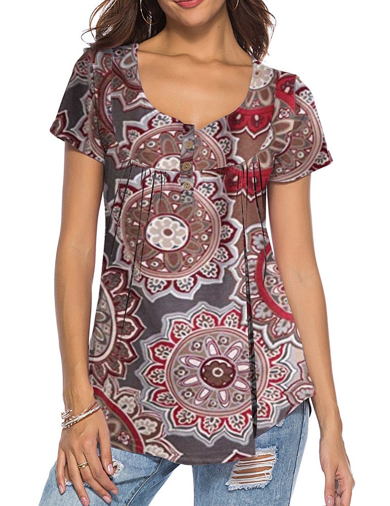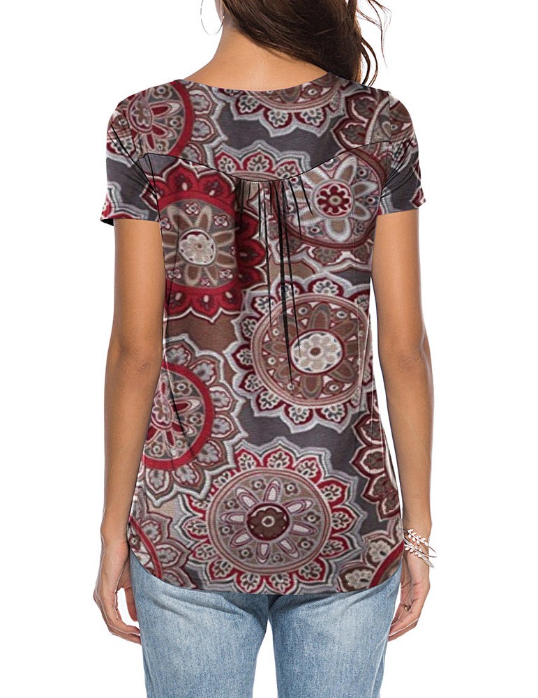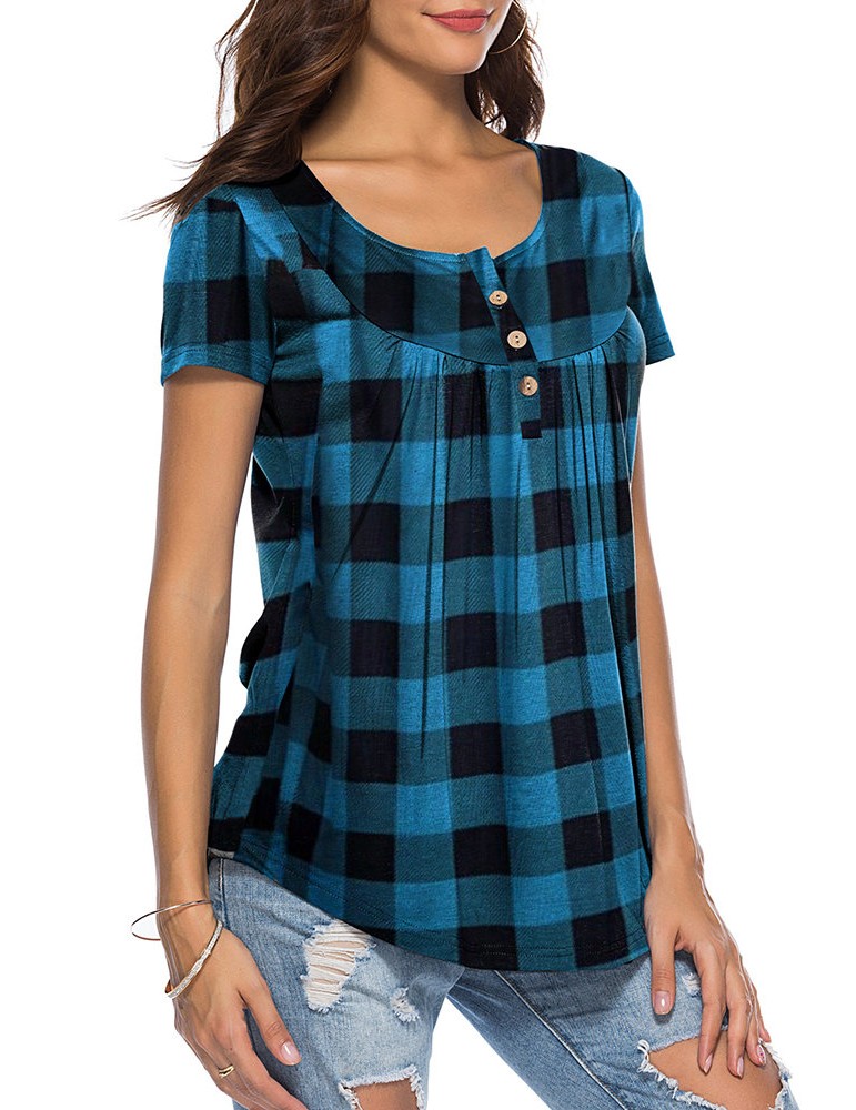 Ethnic Plaid Print Irregular Short Sleeve Casual Blouse