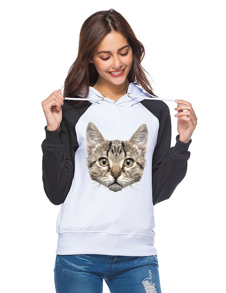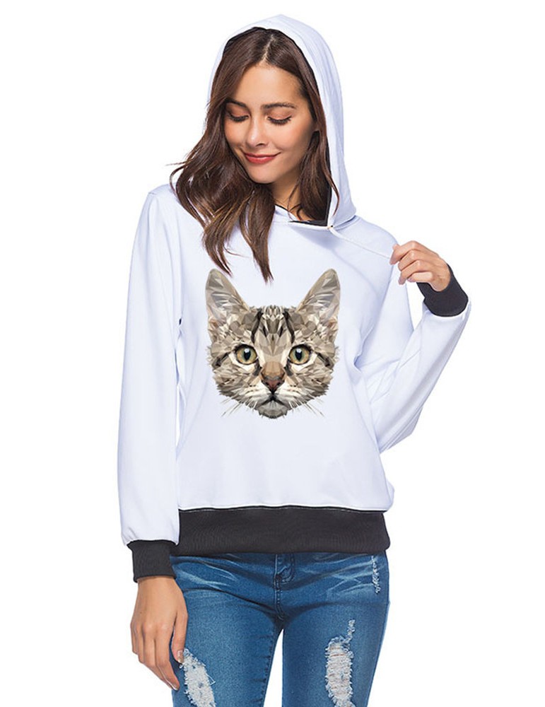 Casual Cartoon Cat Print Hoodies for Women