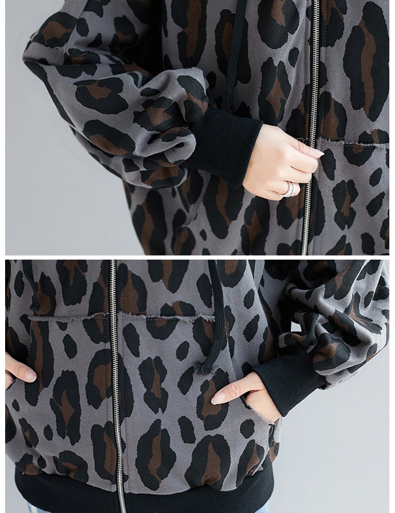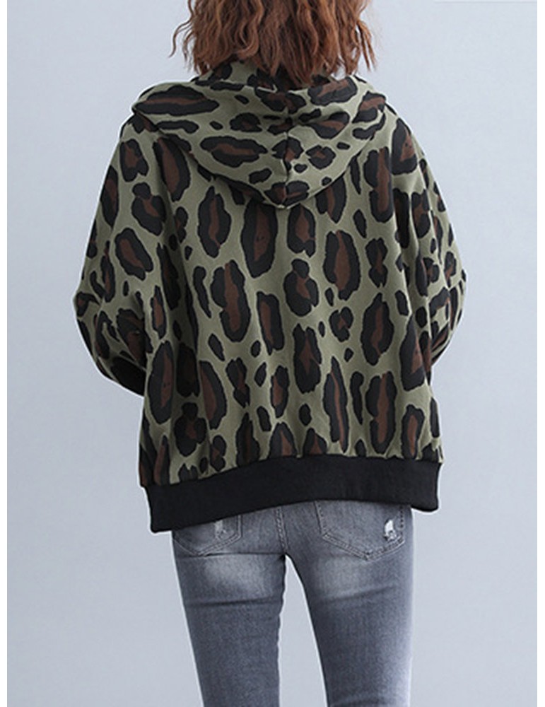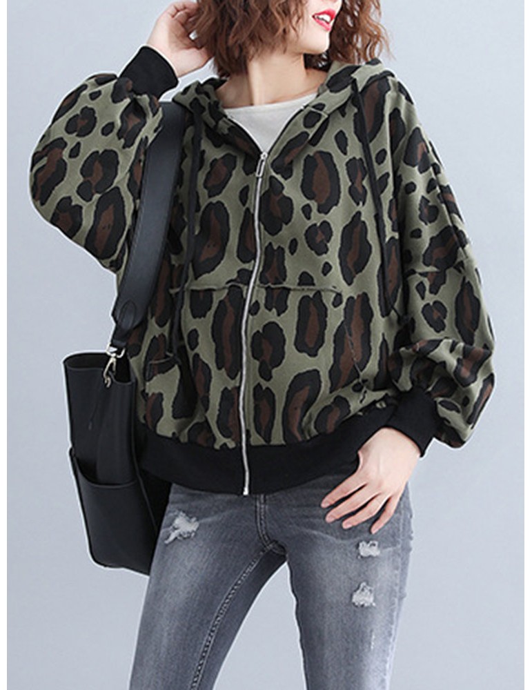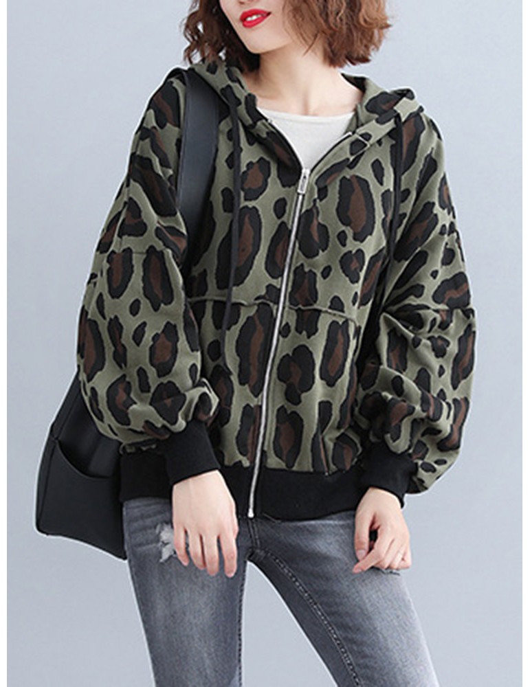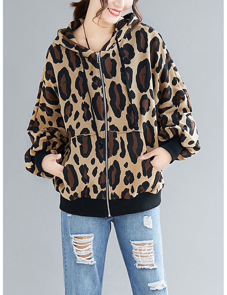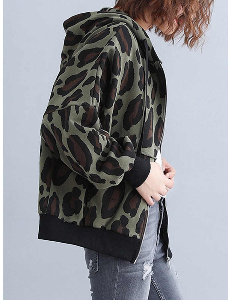 Casual Leopard Print Zipper Hooded Jacket for Women