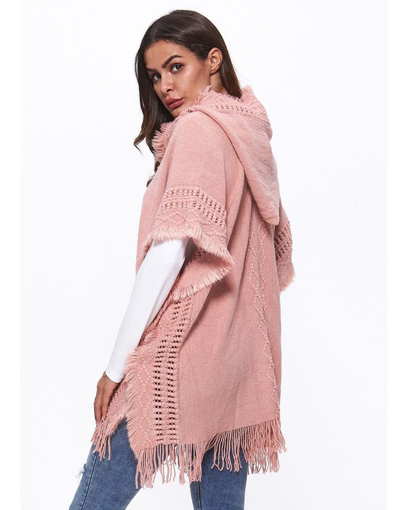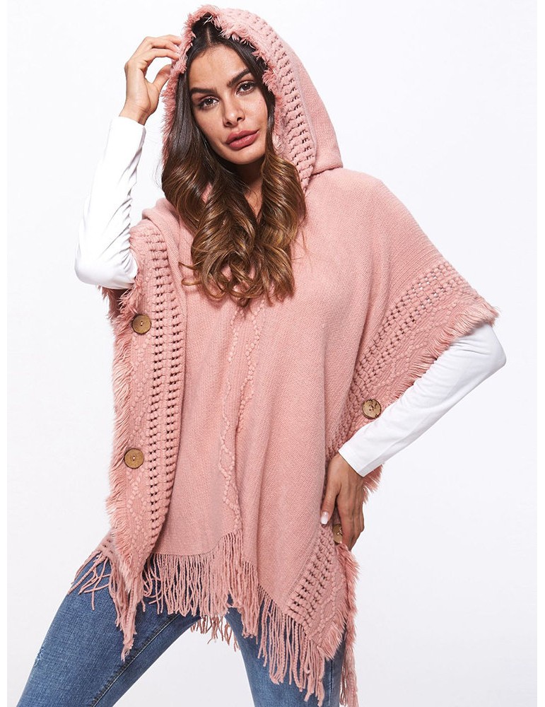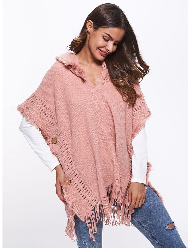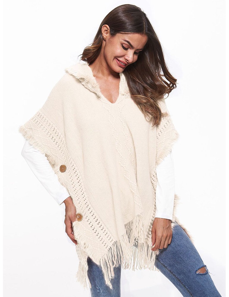 Solid Color Button Tassel Hooded Irregular Cardigan