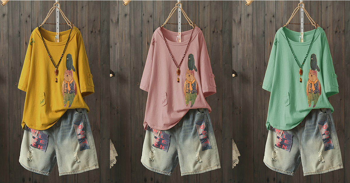 Casual Cartoon Print Patch Short Sleeve Plus Size T-Shirt