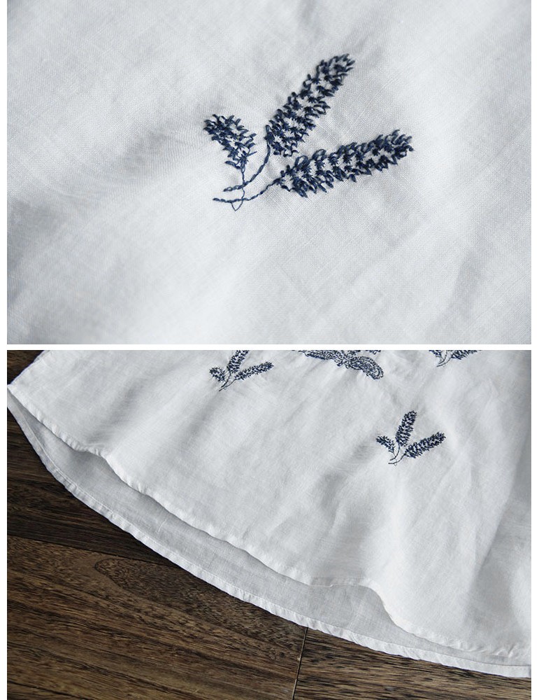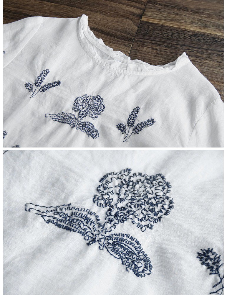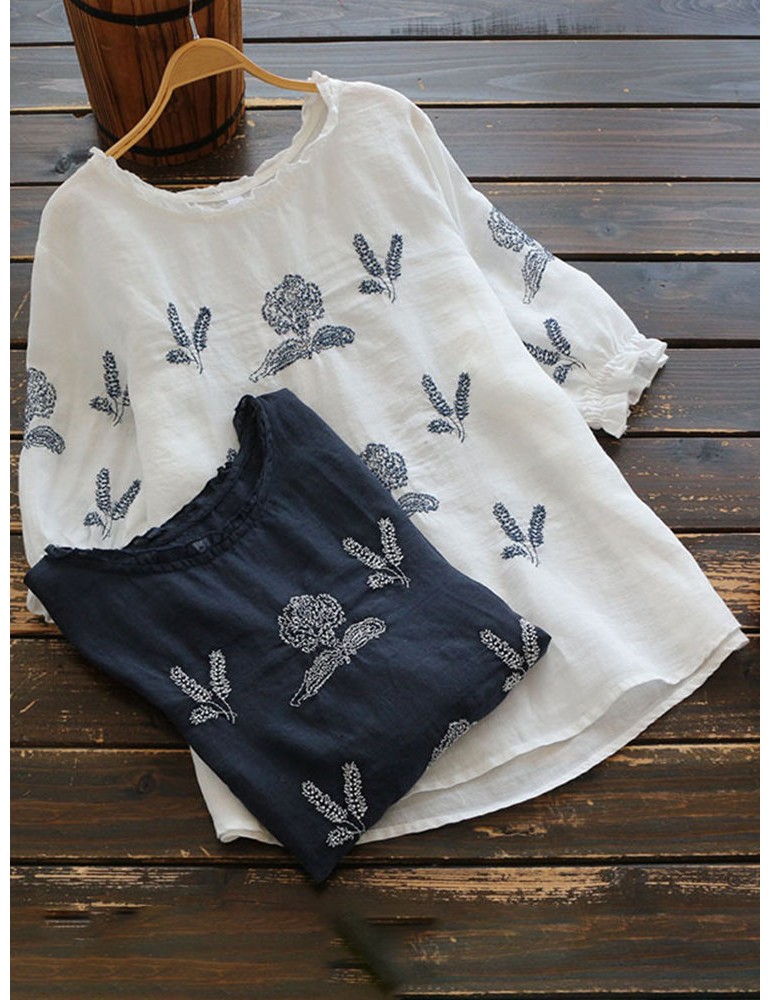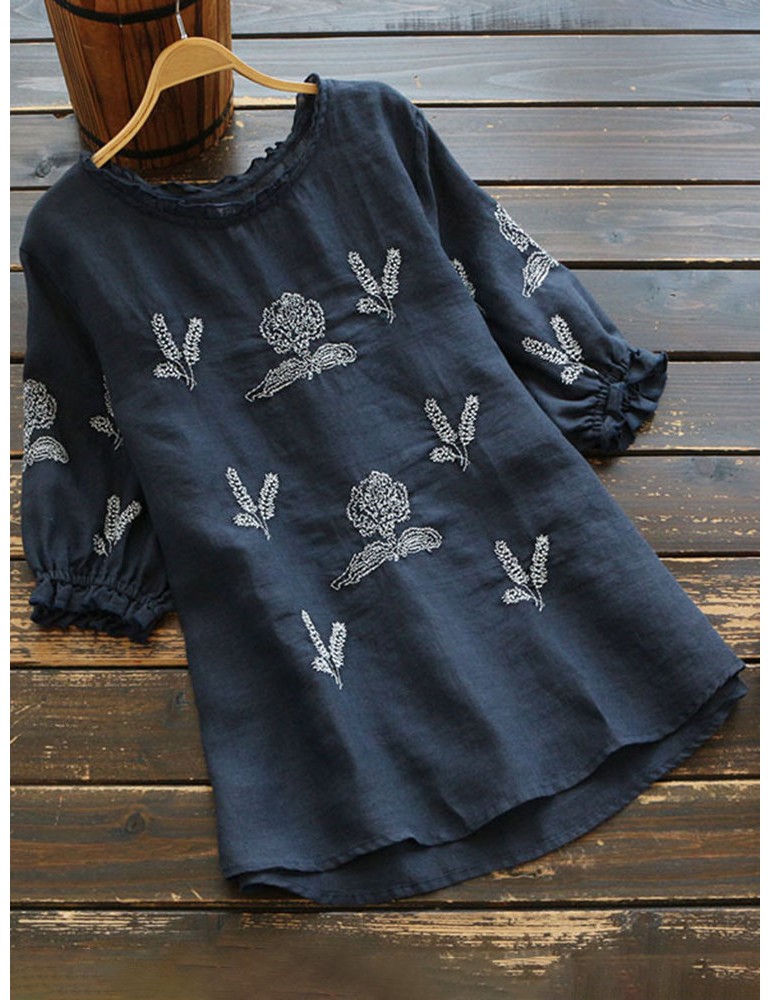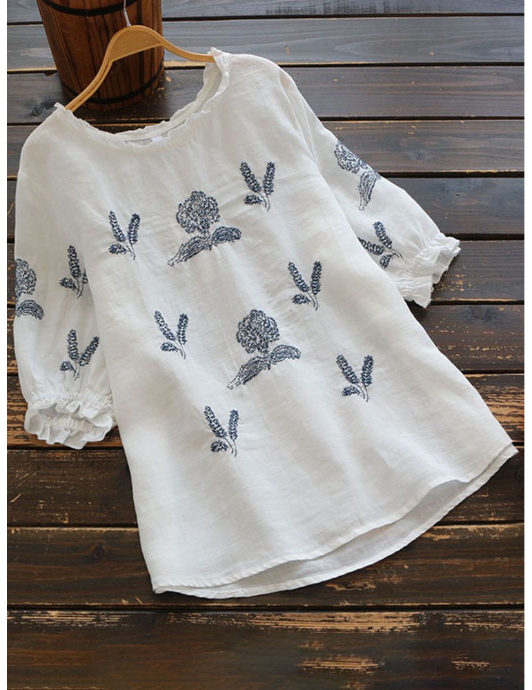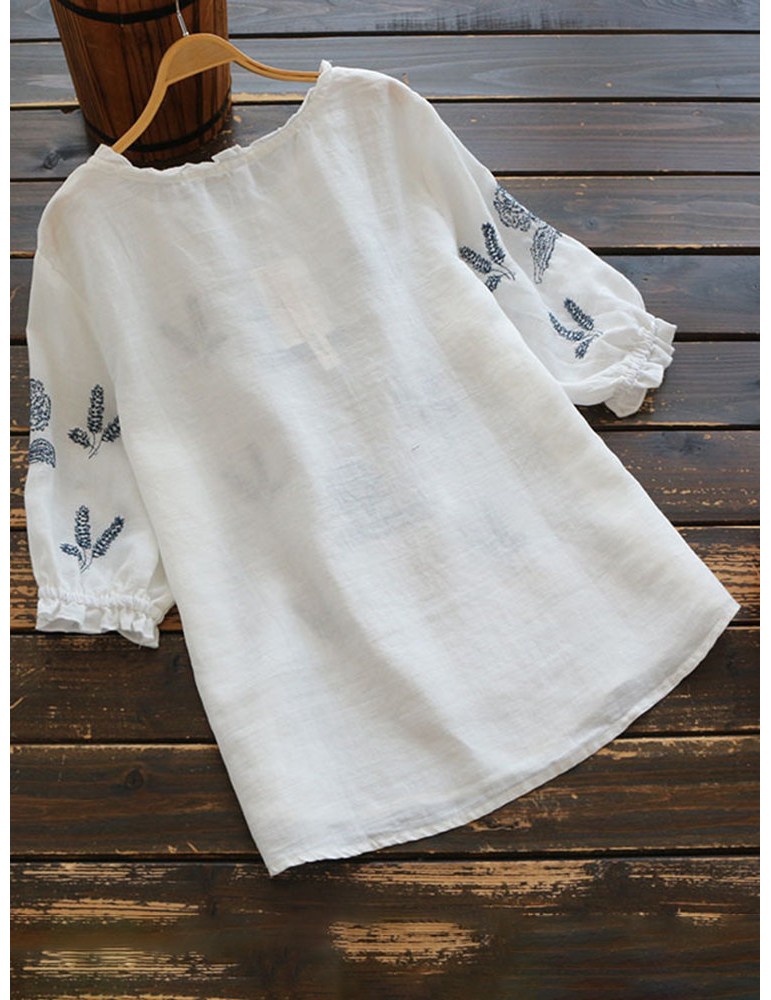 Embroidery Ruffle Crew Neck Bubble Sleeve Blouse