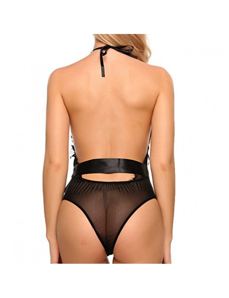 Sexy Deep Plunge Lace Eyelashes Bowknot Backless Lingerie Teddies