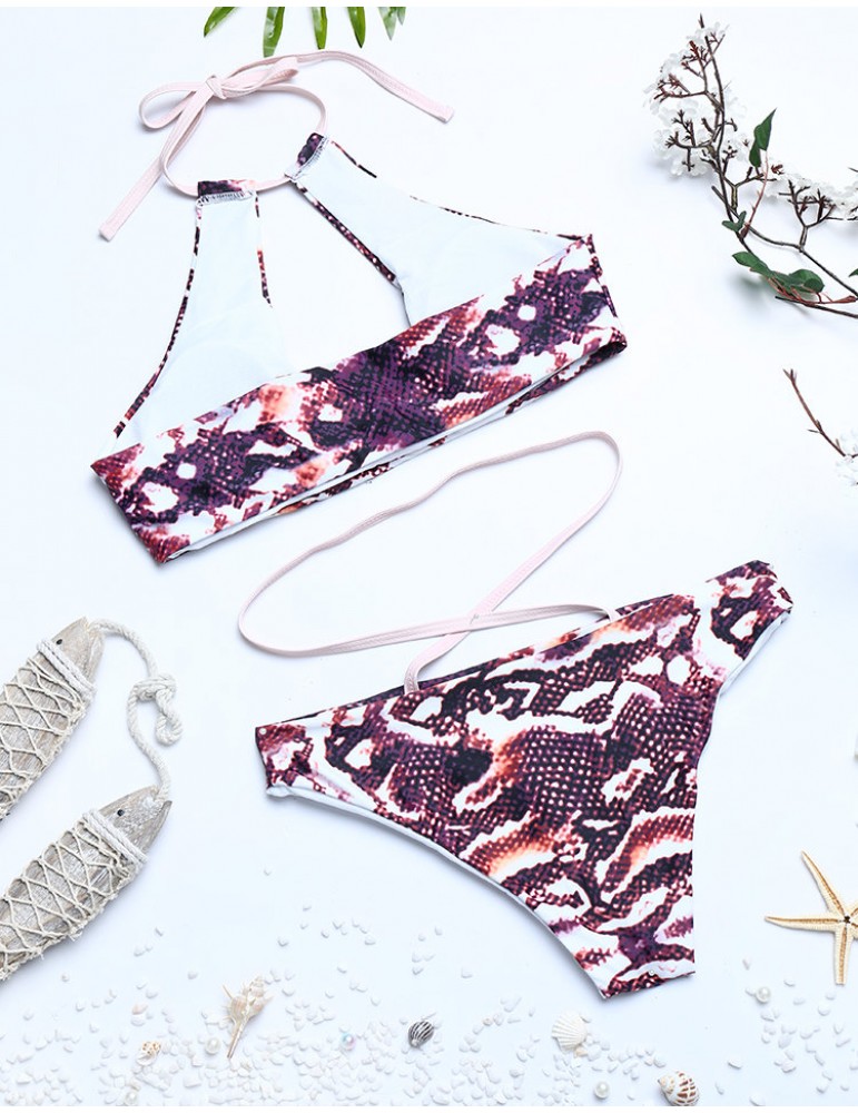 Sexy Halter Hollow Out Front Criss-Cross Snake Pattern Tankini Bathing Suit