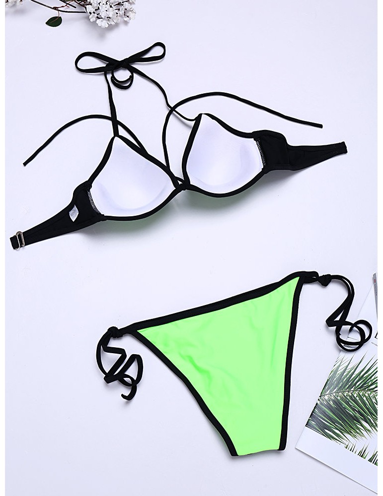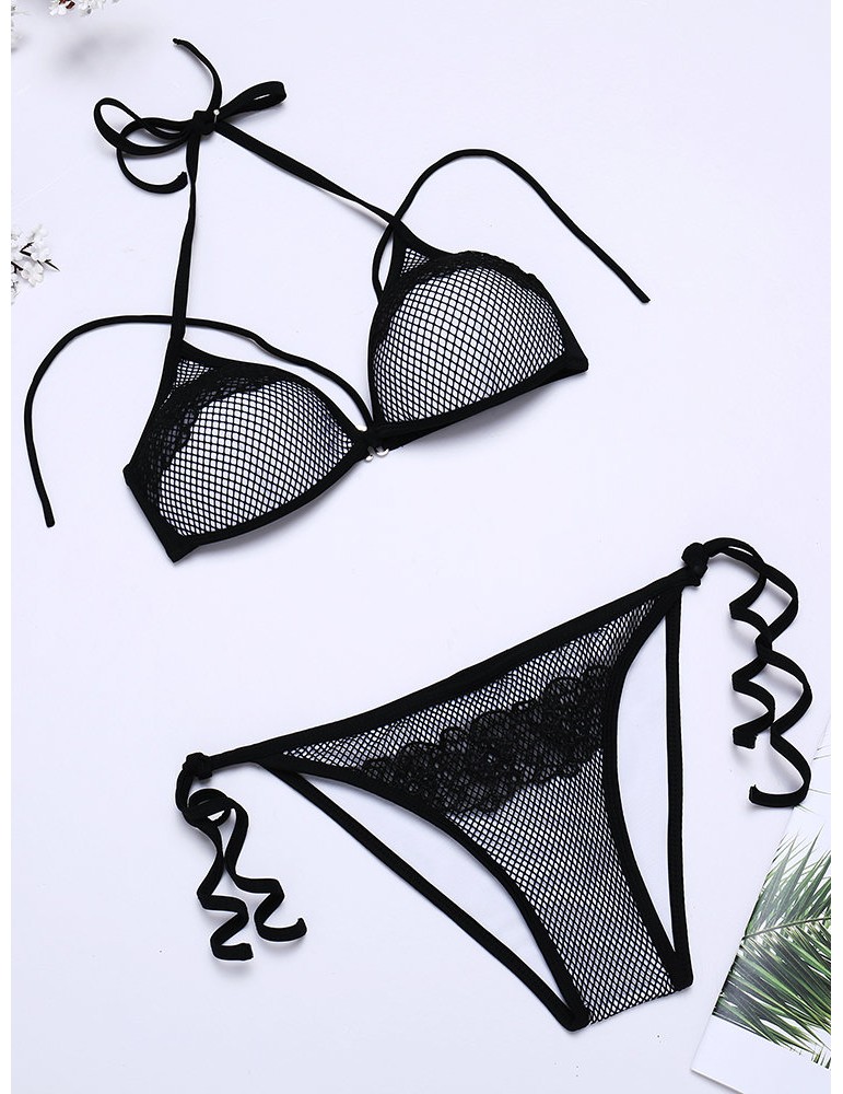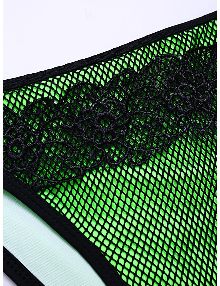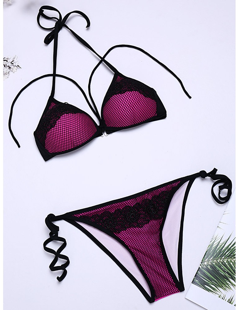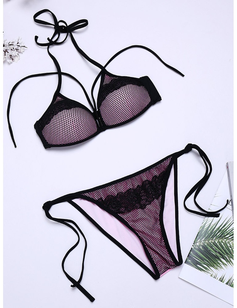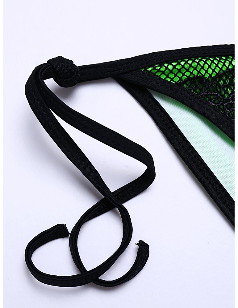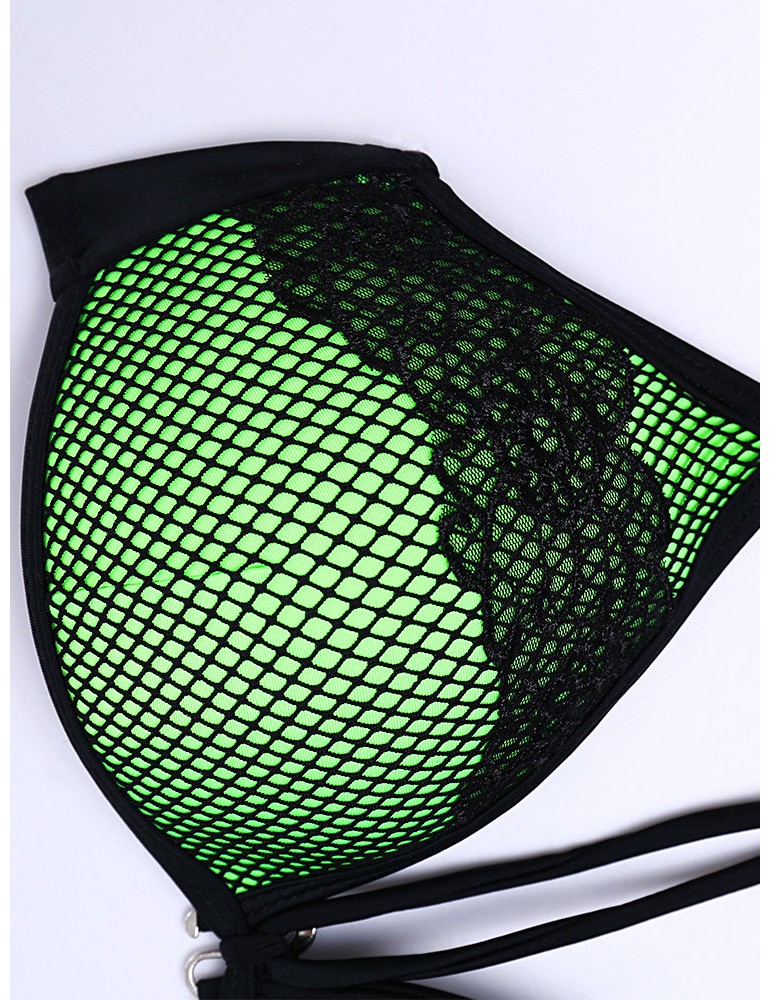 Sexy Fluorescent Mesh Halter String Embroidery Backless Solid Color Bikinis Swimsuits For Women
