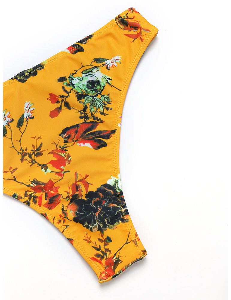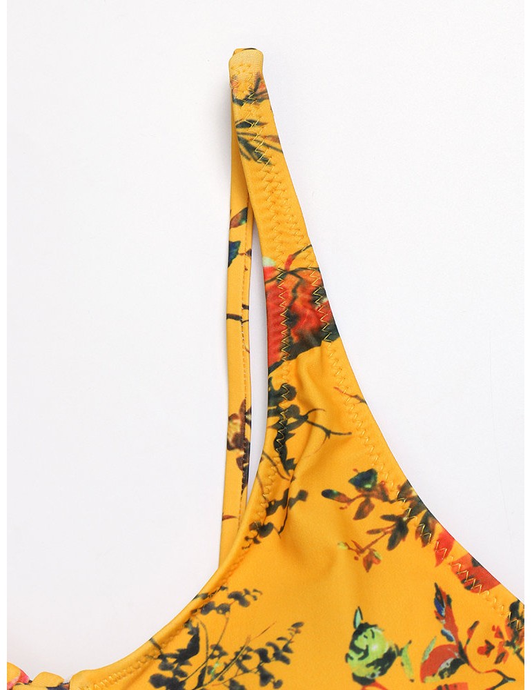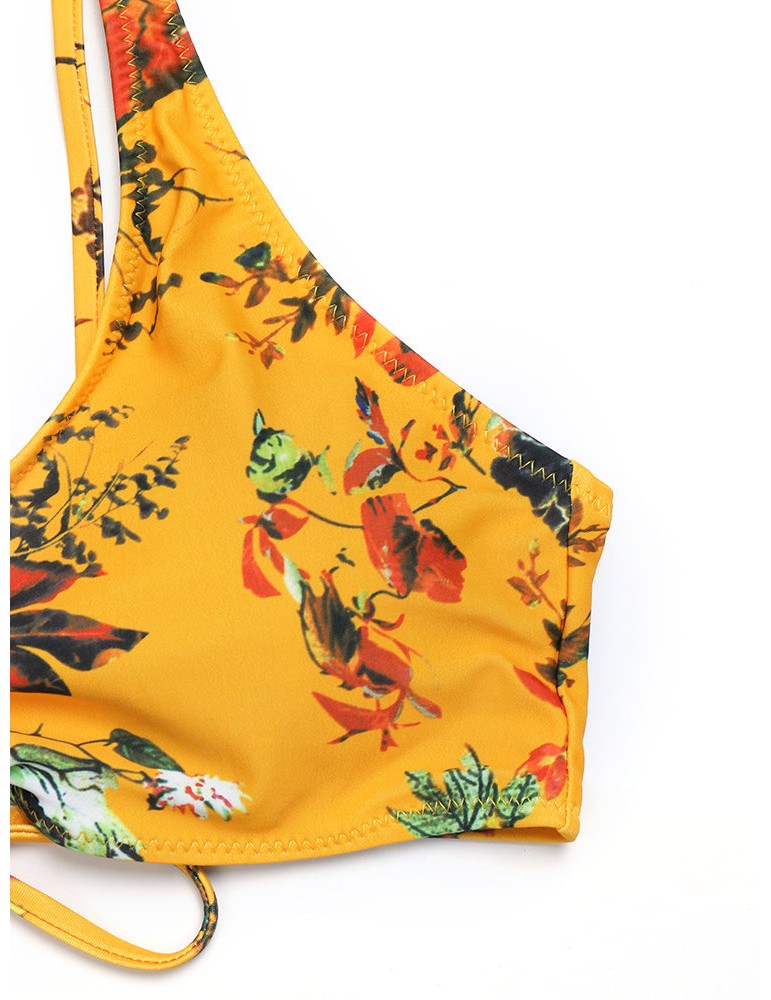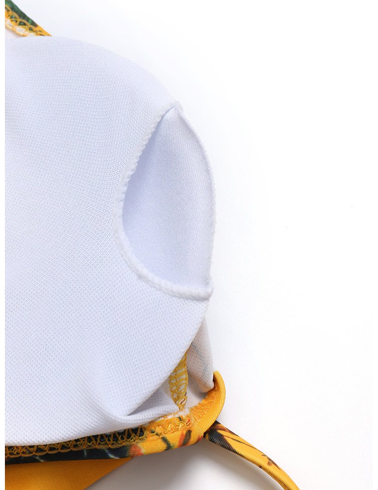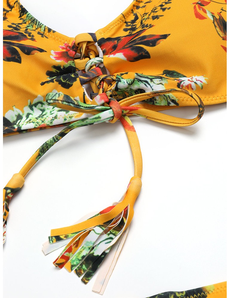 Tassel String Yellow Printed Flower Ribbed Texture Lace Up Bra Thong Bikini