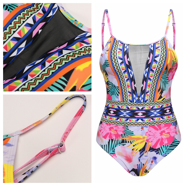 Geometric Printed Mesh Vintage Backless Breathable One Piece Swimsuits For Women