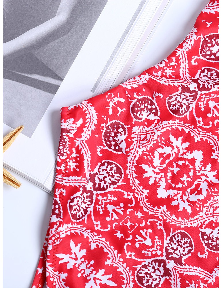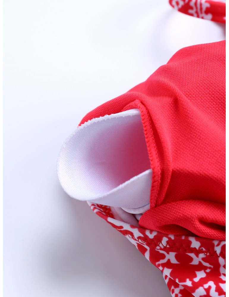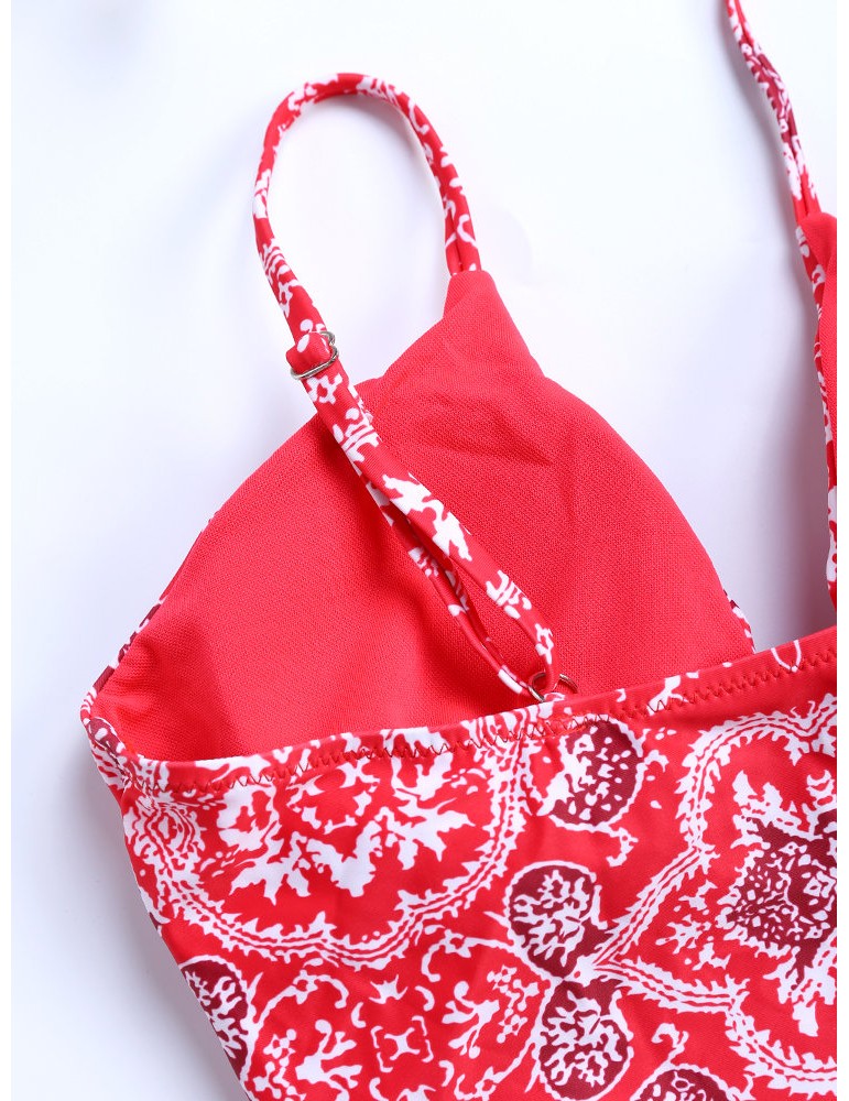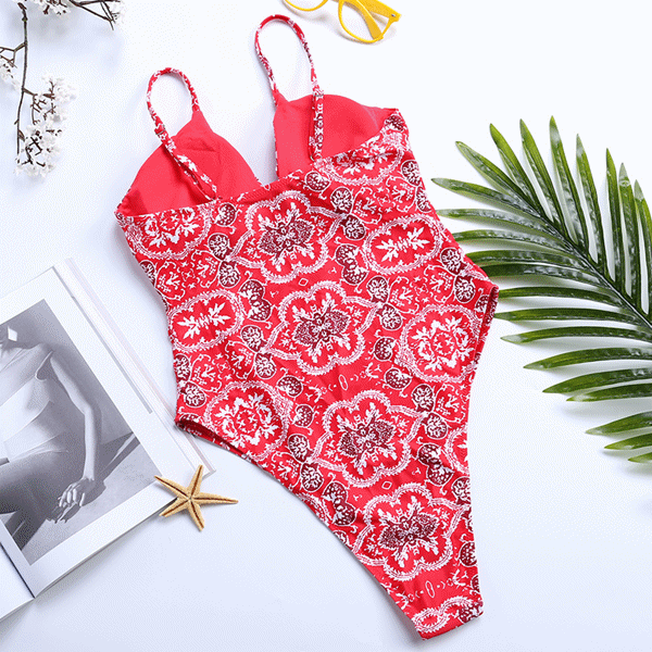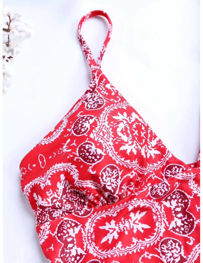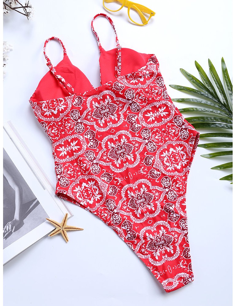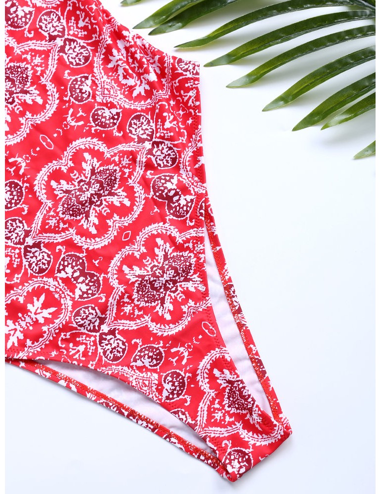 High Fork Printed Retro Bustier Scoop Back Deep V One Piece Swimsuits For Women