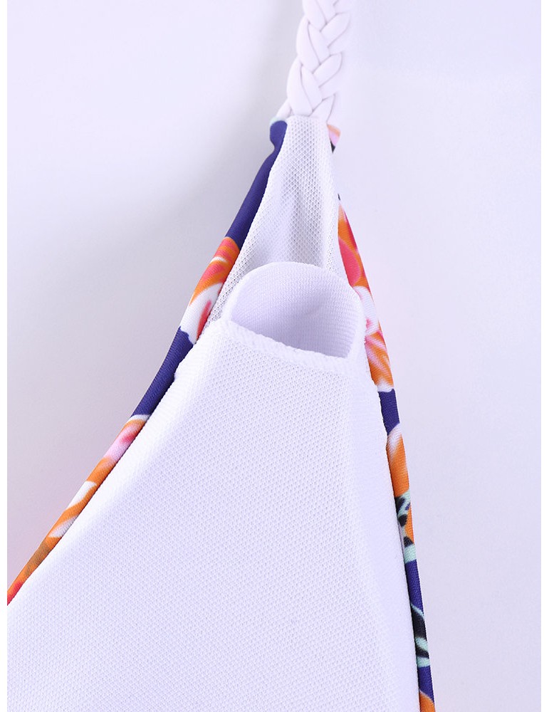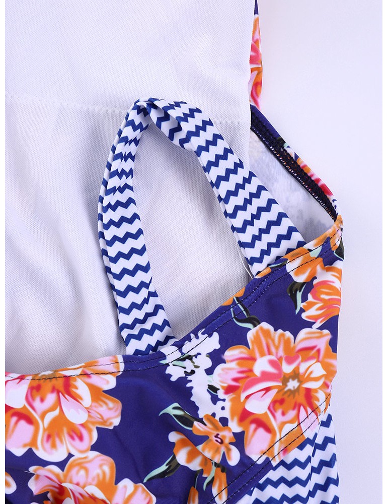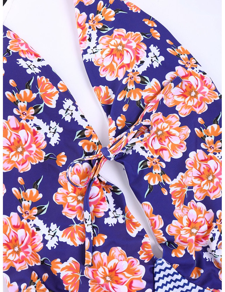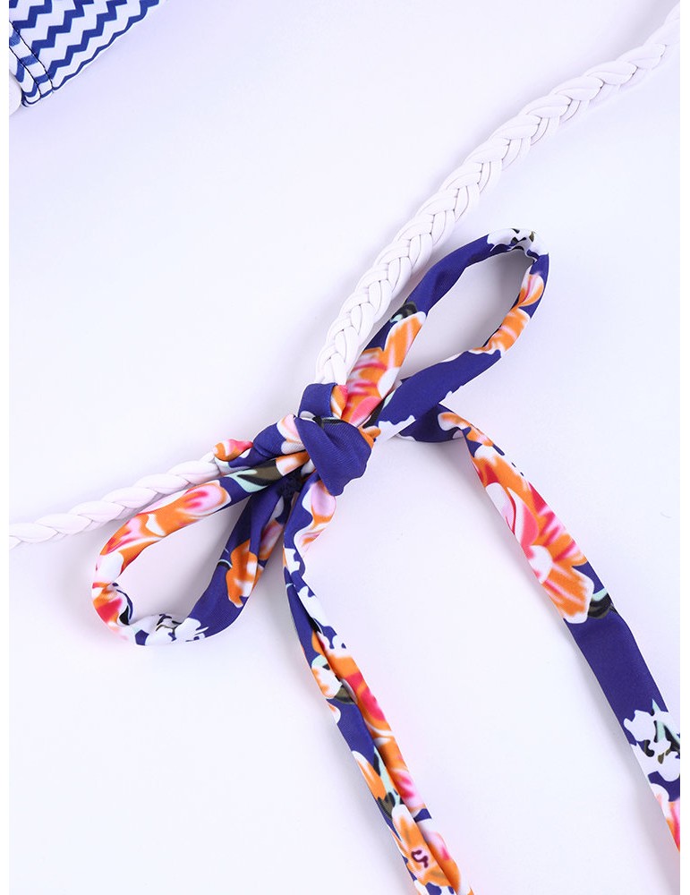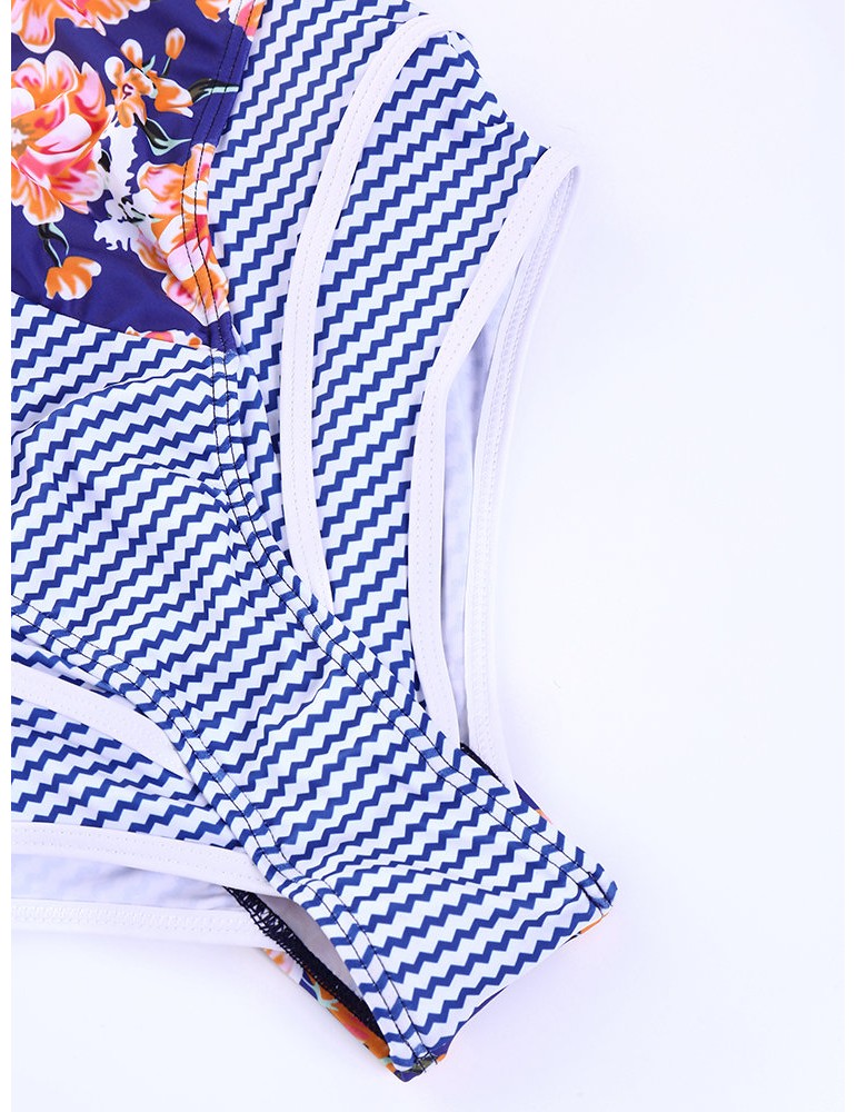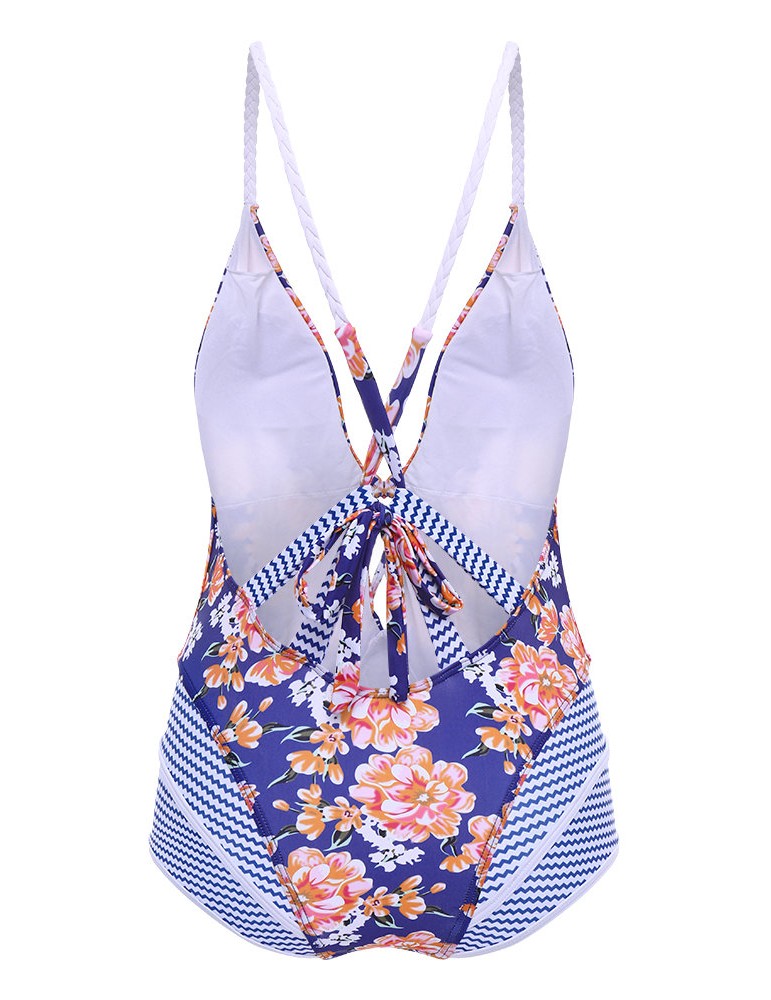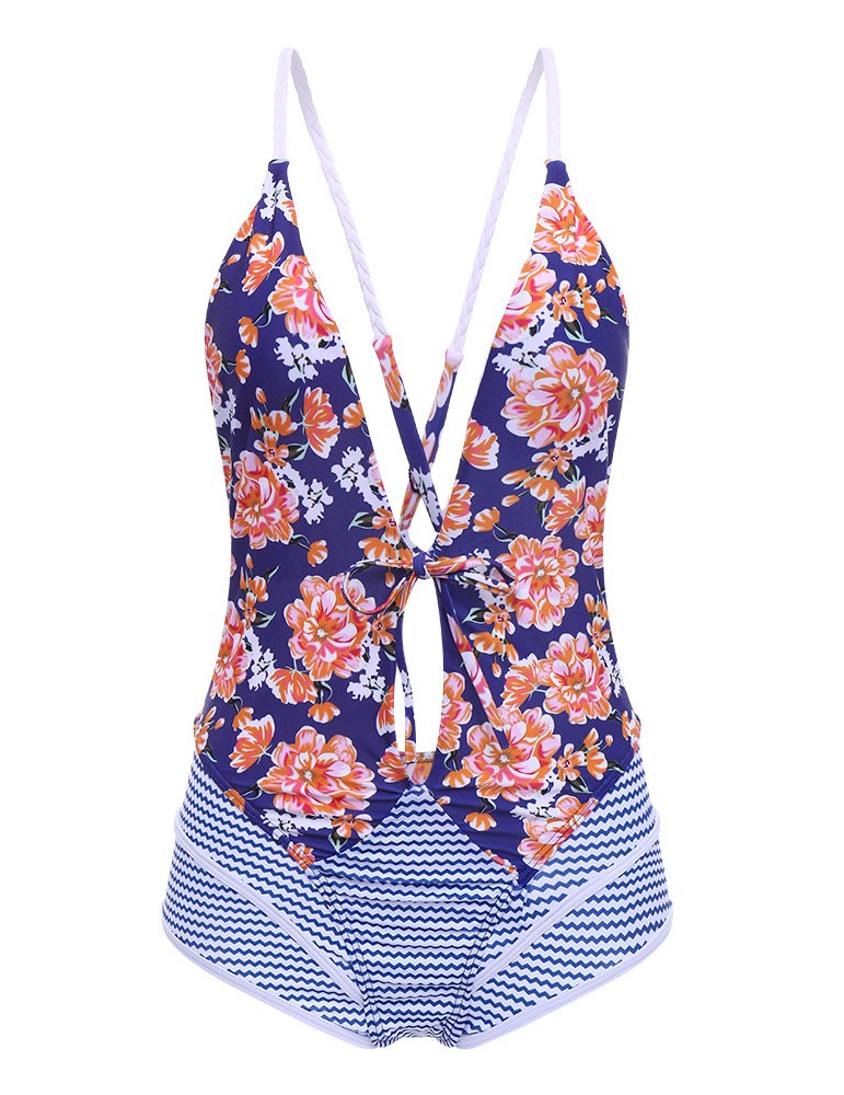 Sexy Printed Stripe Patchwork Tie Front Bowknot Solid Color Monokini Swimsuits For Women