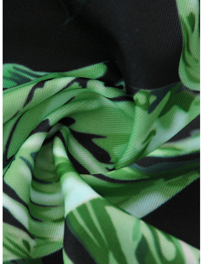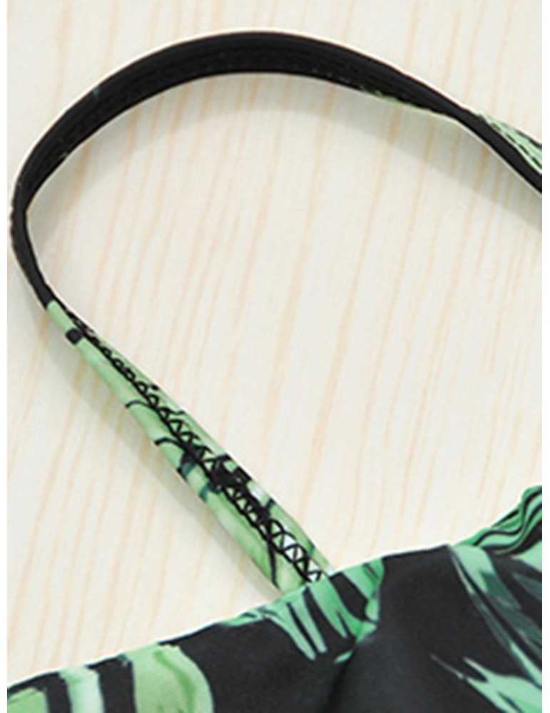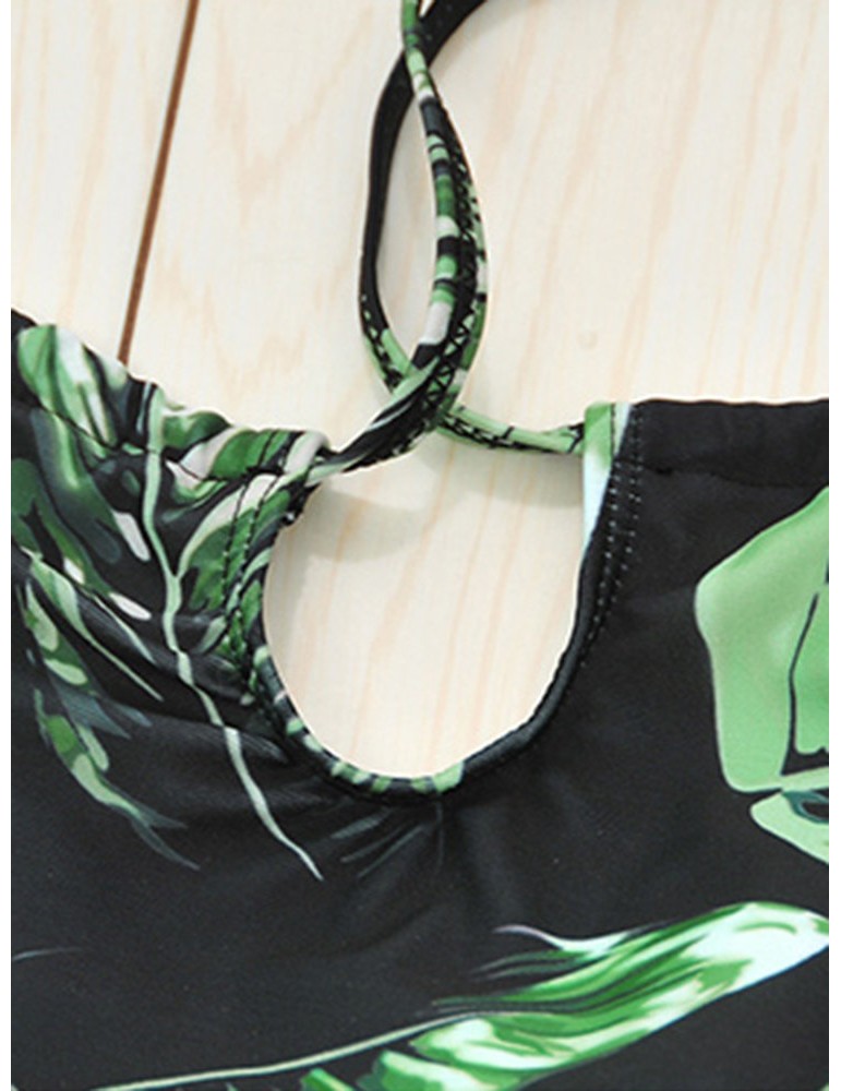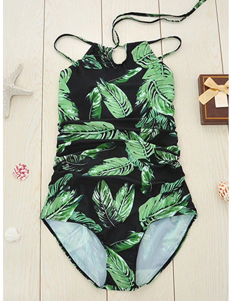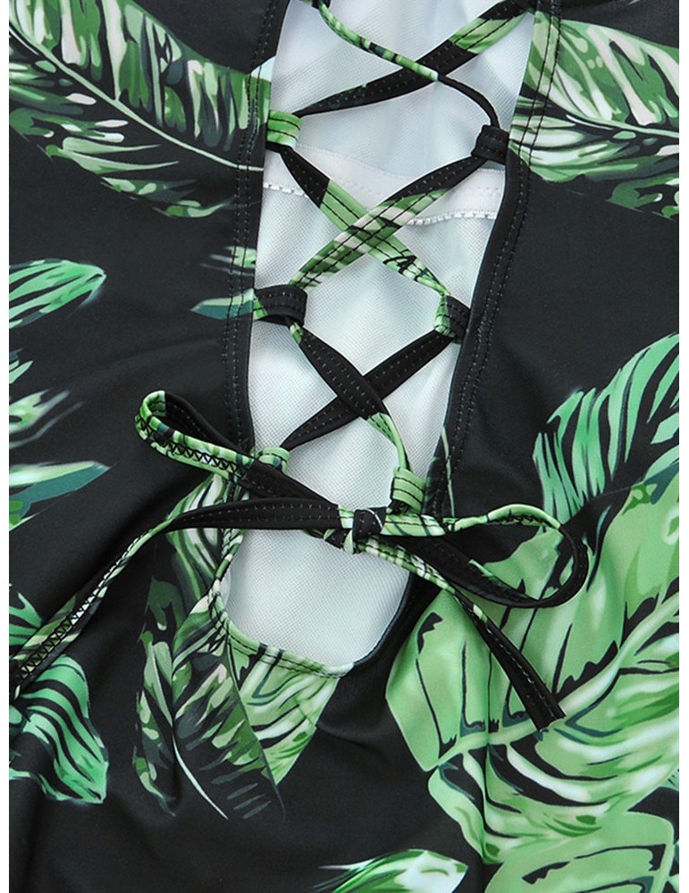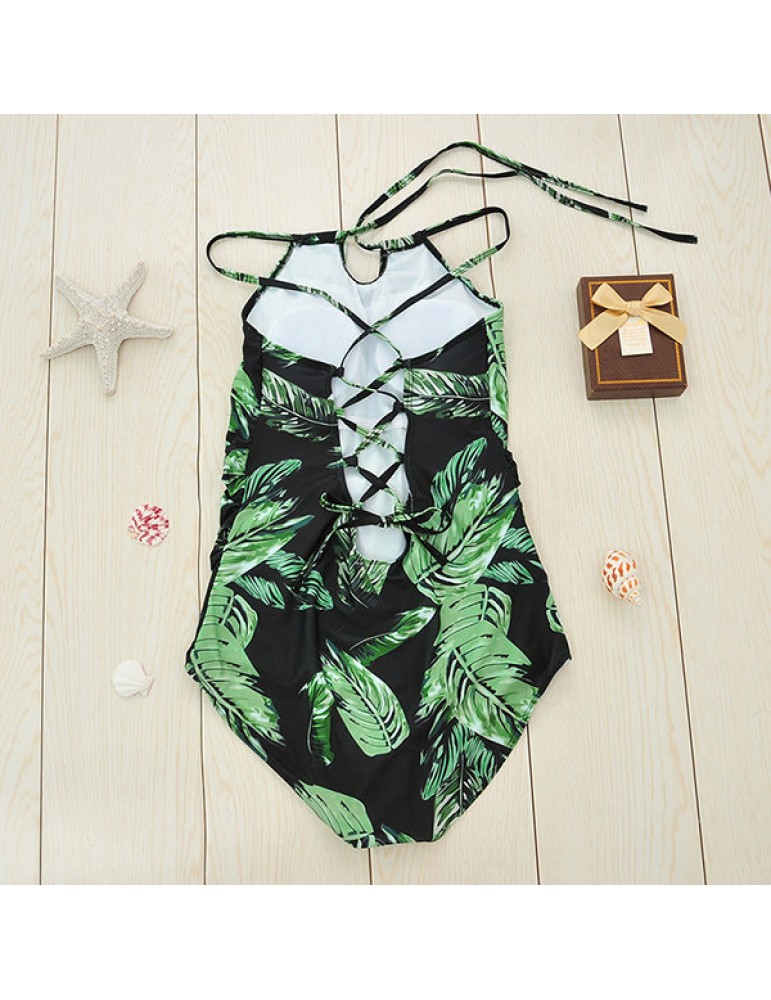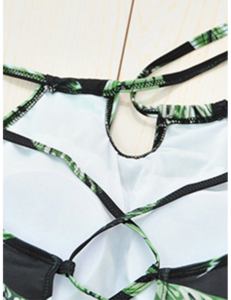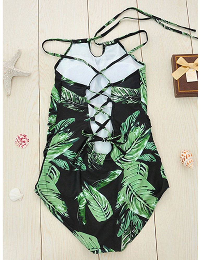 Halter Backless Criss-cross Back Leaf Print One-pieces