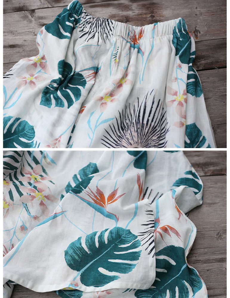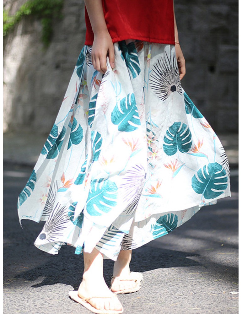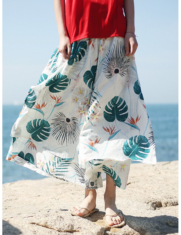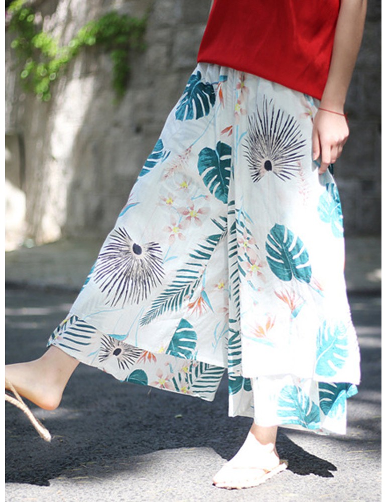 Leaves Print Layered Irregular Loose Elastic Waist Vintage Pants
