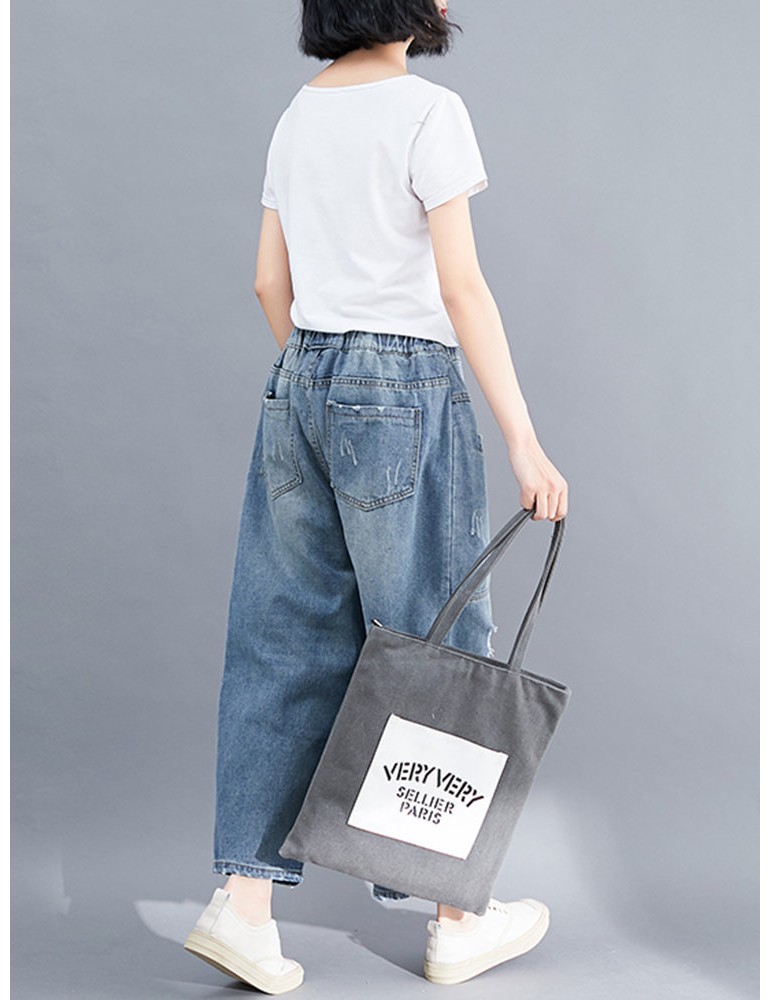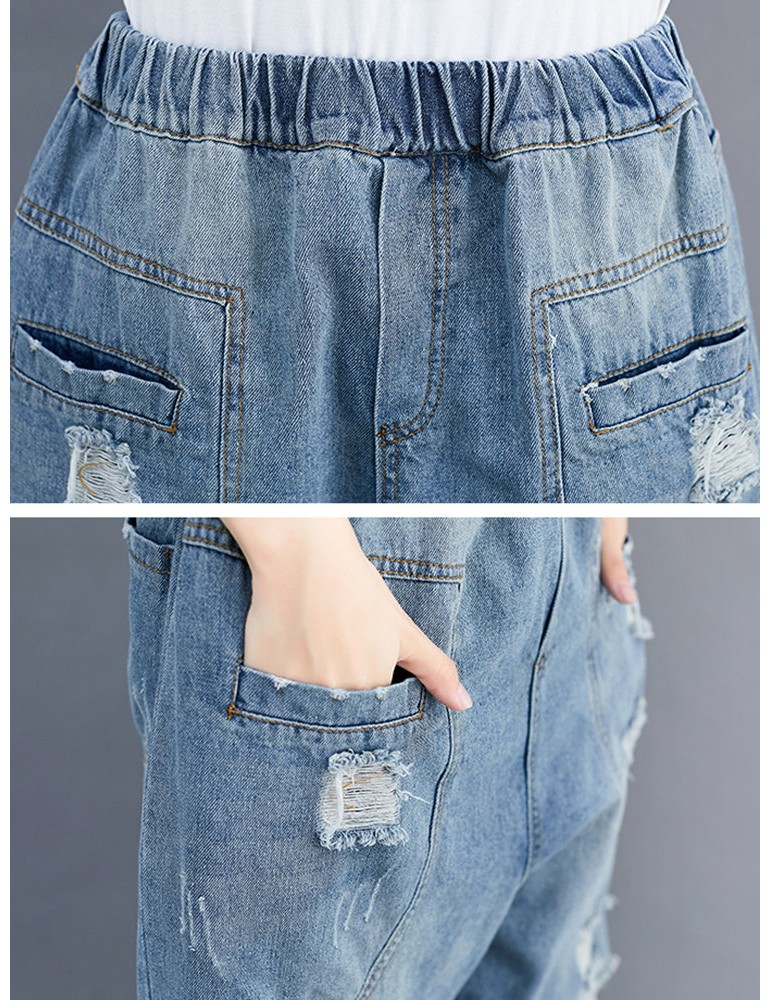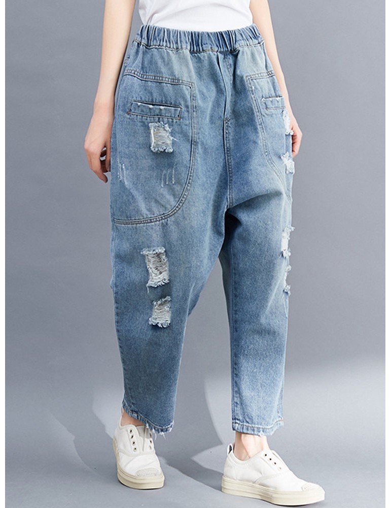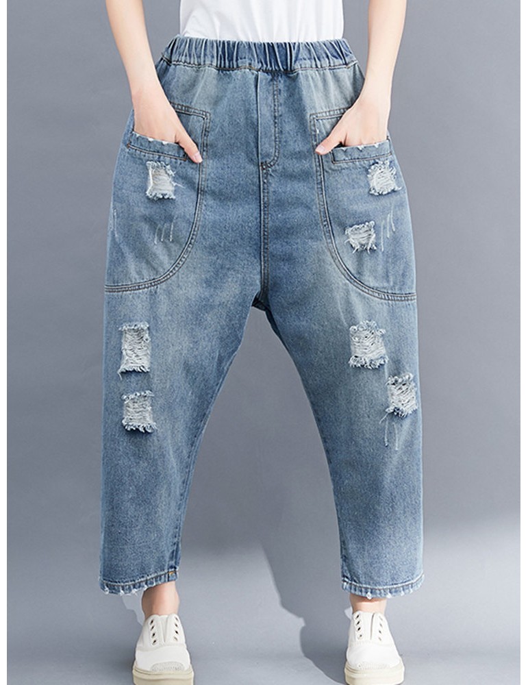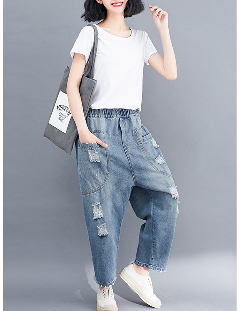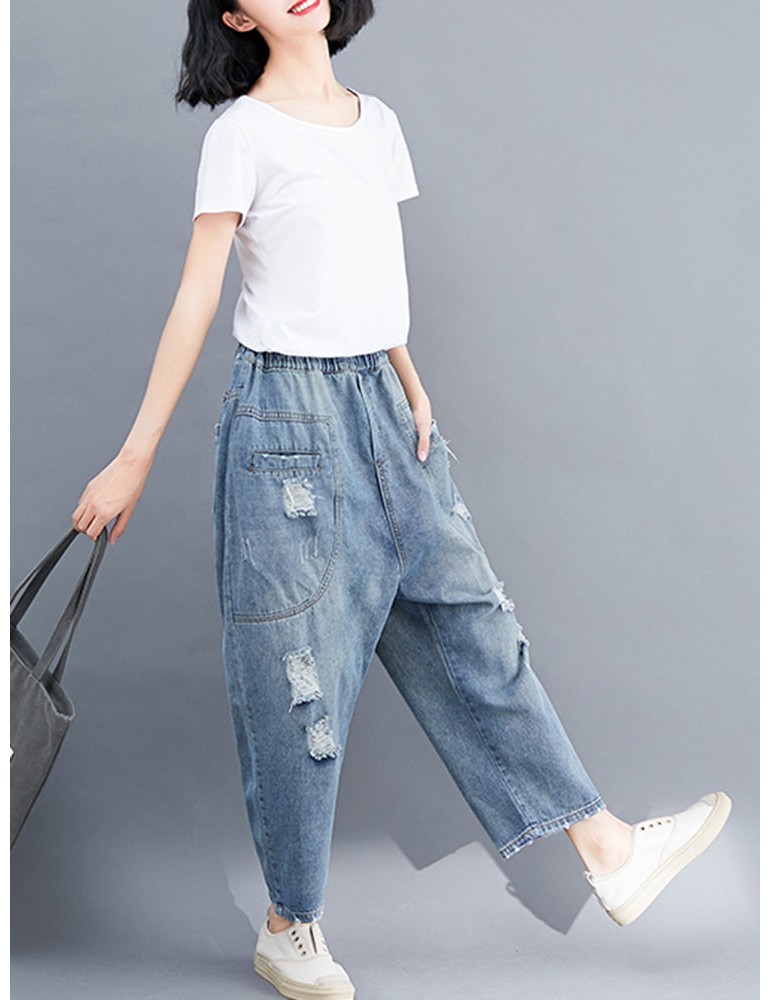 Solid Color Elastic Waist Casual Ripped Jeans For Women