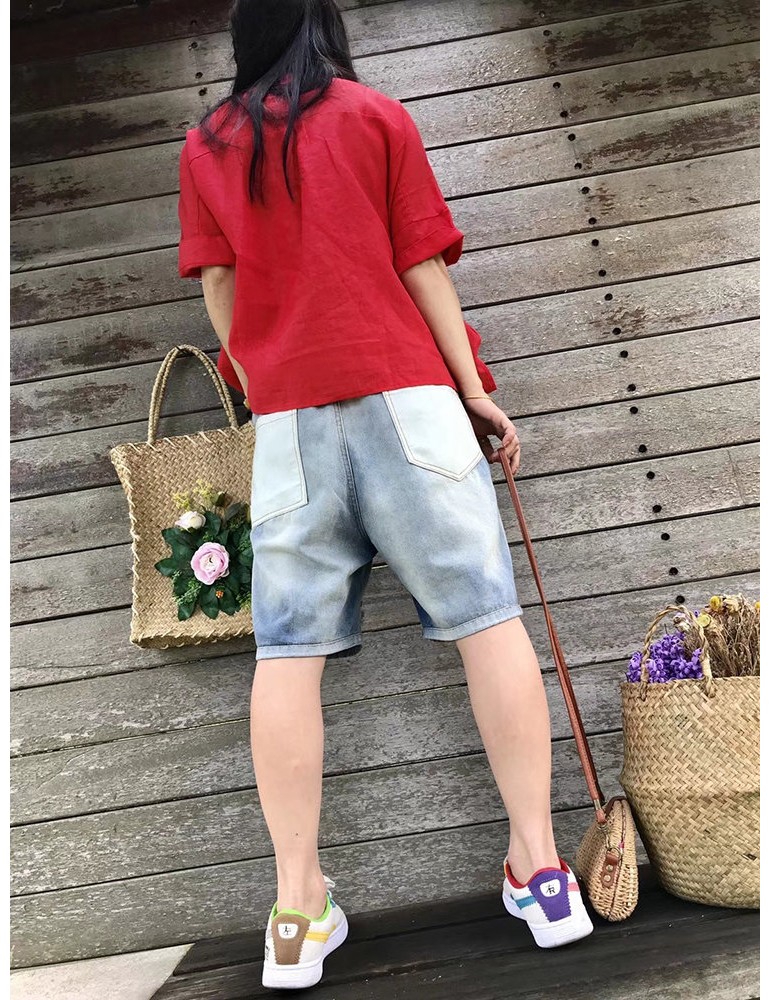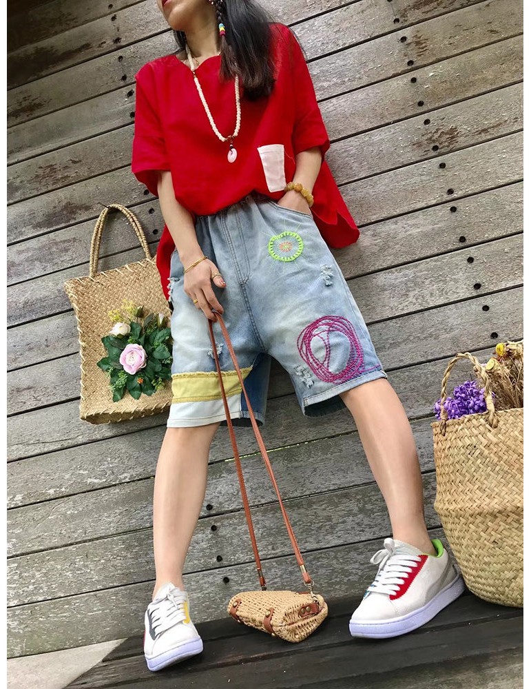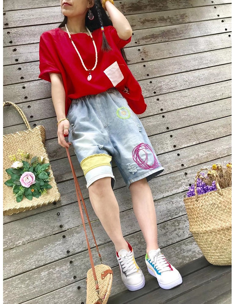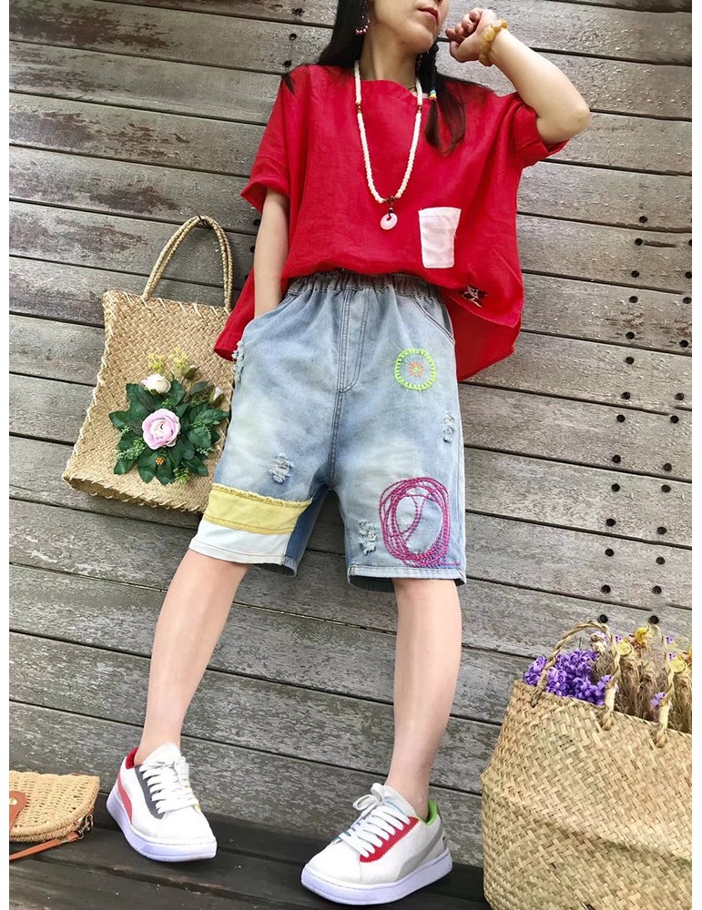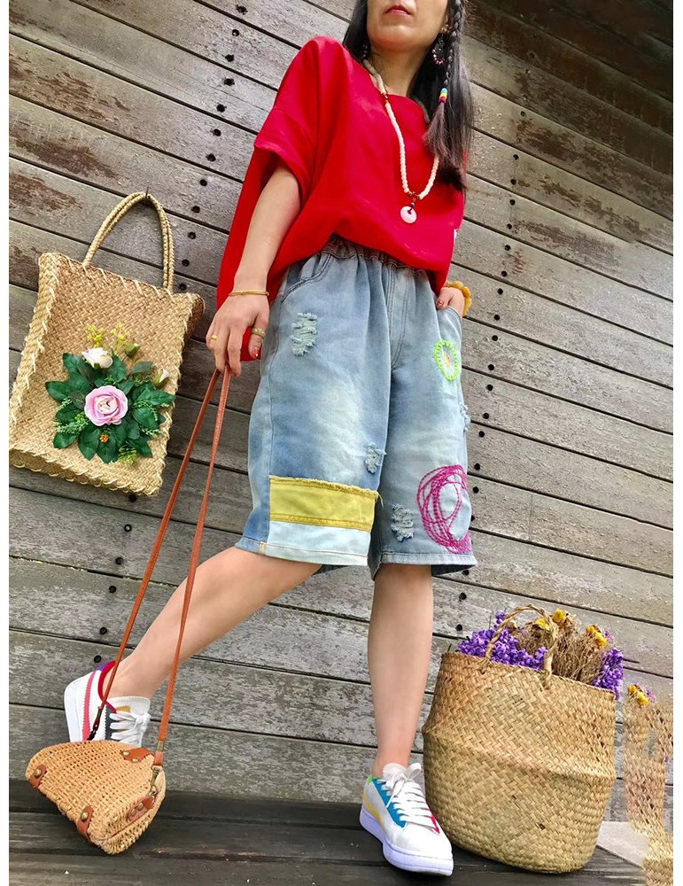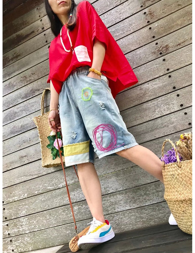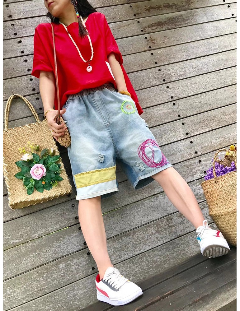 Embroidery Elastic Waist Wide Leg Shorts Denim