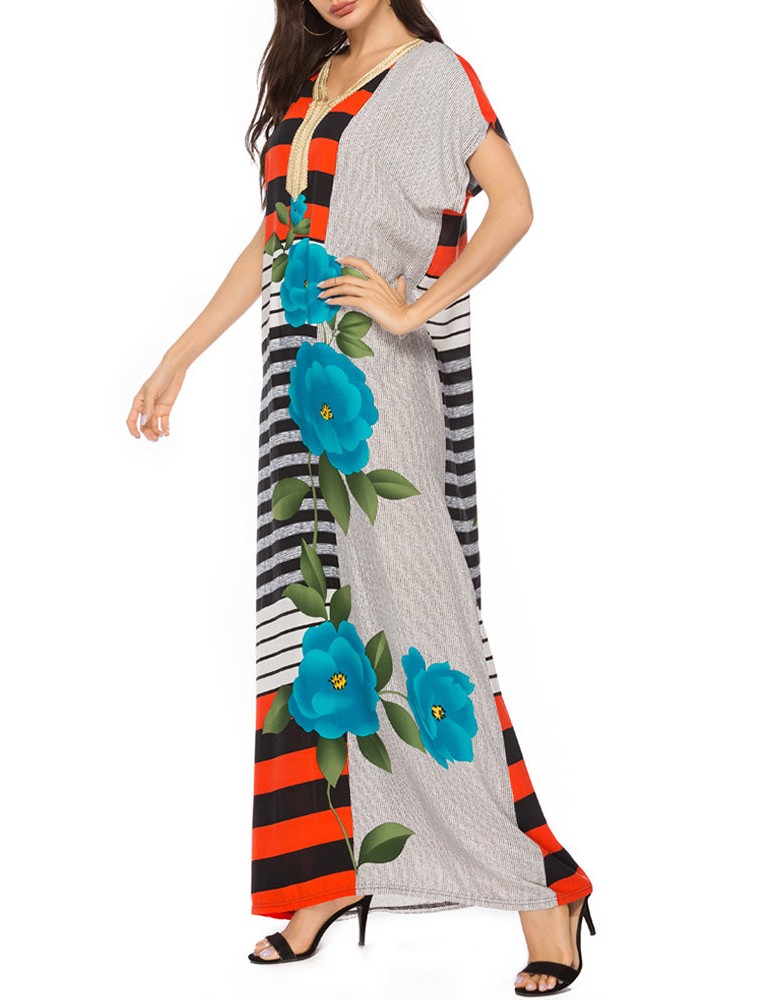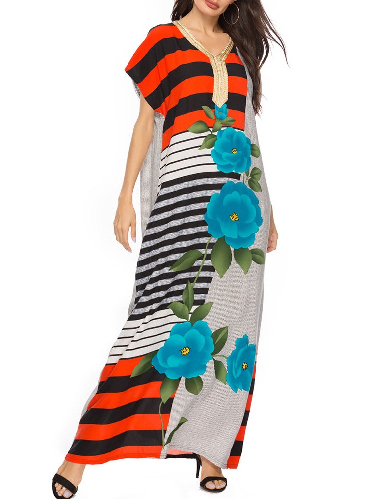 Vintage Bohemian Print Short Sleeve V-neck Maxi Dress