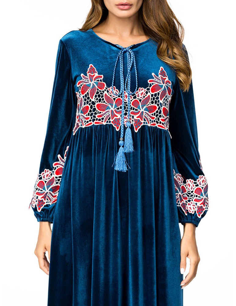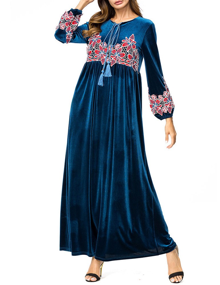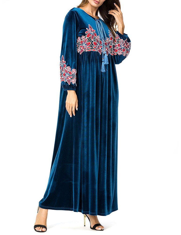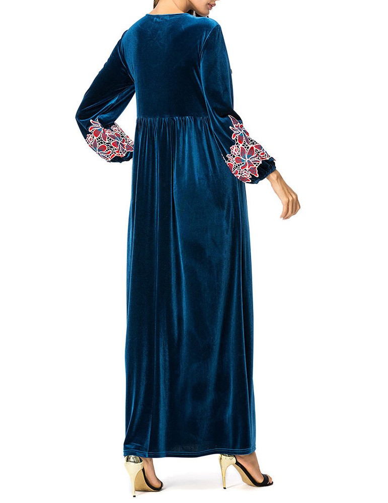 Velvet Flower Print Slim Long Sleeve Muslim Long Dress