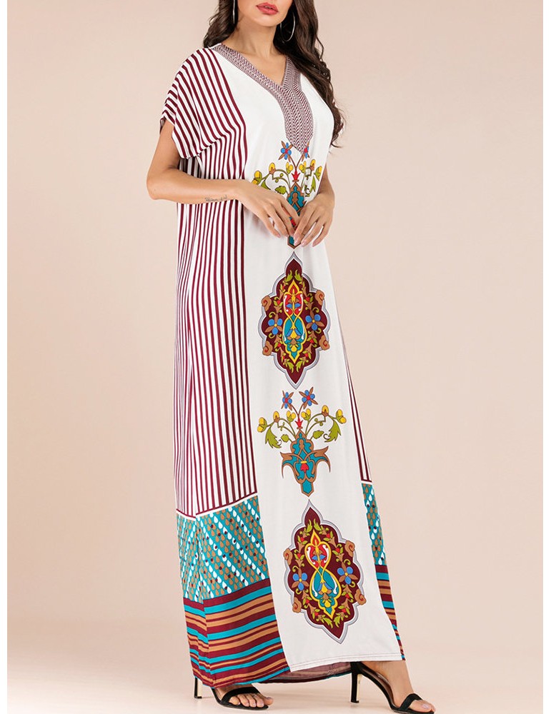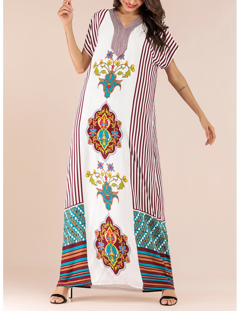 Bohemian Print V-neck Patch Short Sleeve Maxi Dress