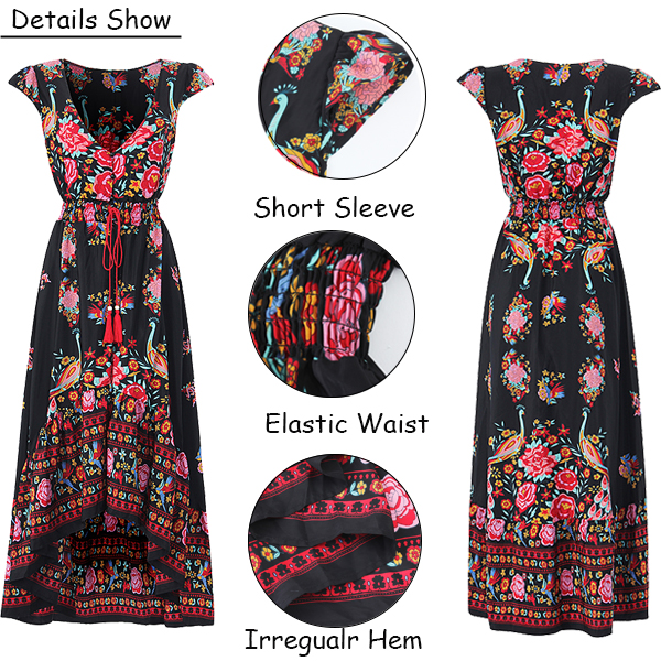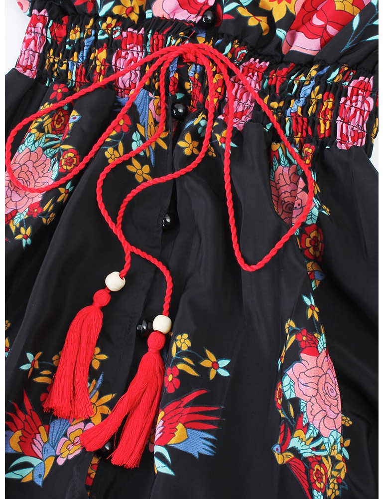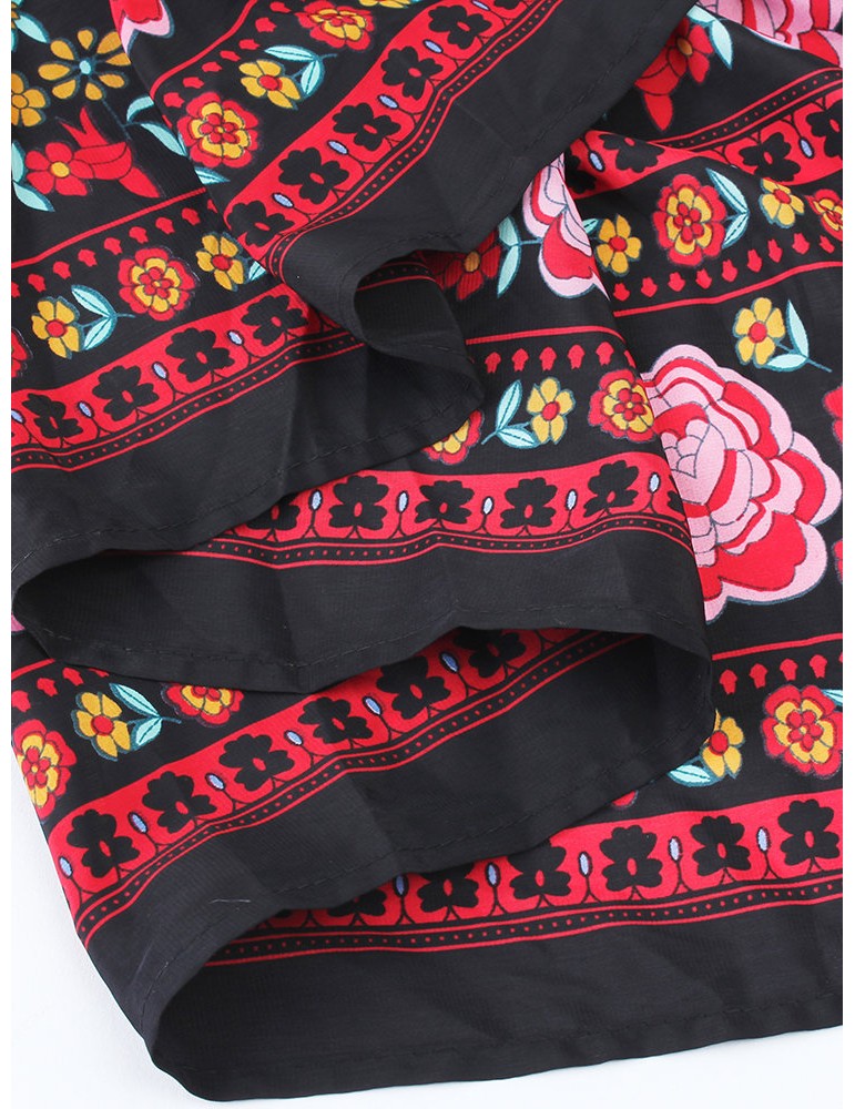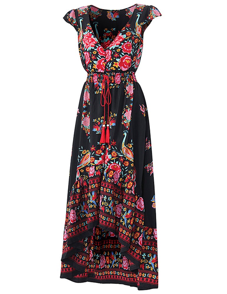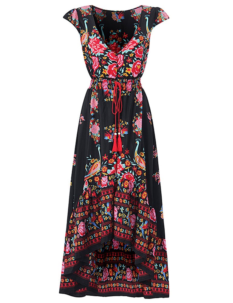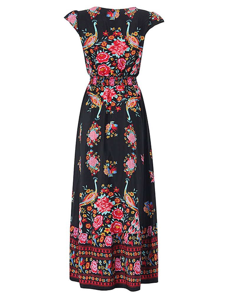 Folk Style Floral Print Bandage V-neck Women Maxi Dress