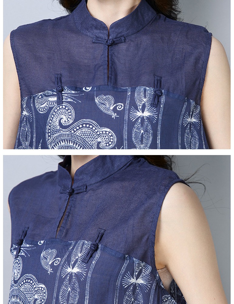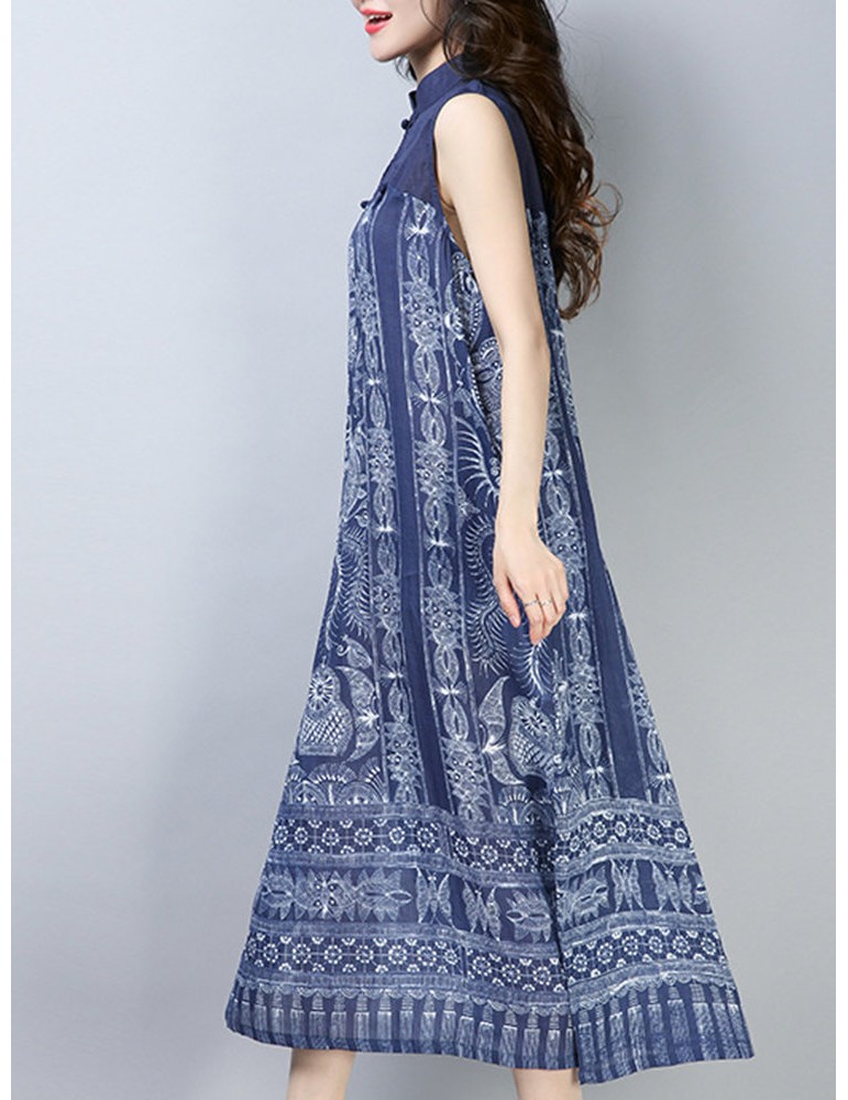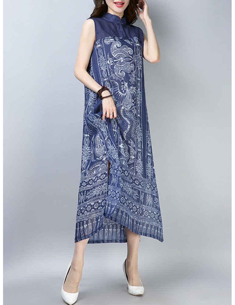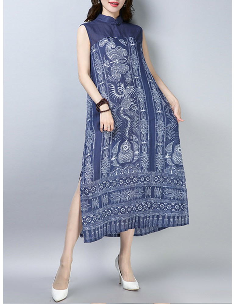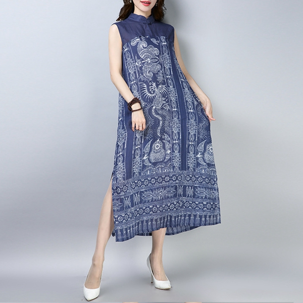 Ethnic Print Side Splited Sleeveless Vintage Dresses