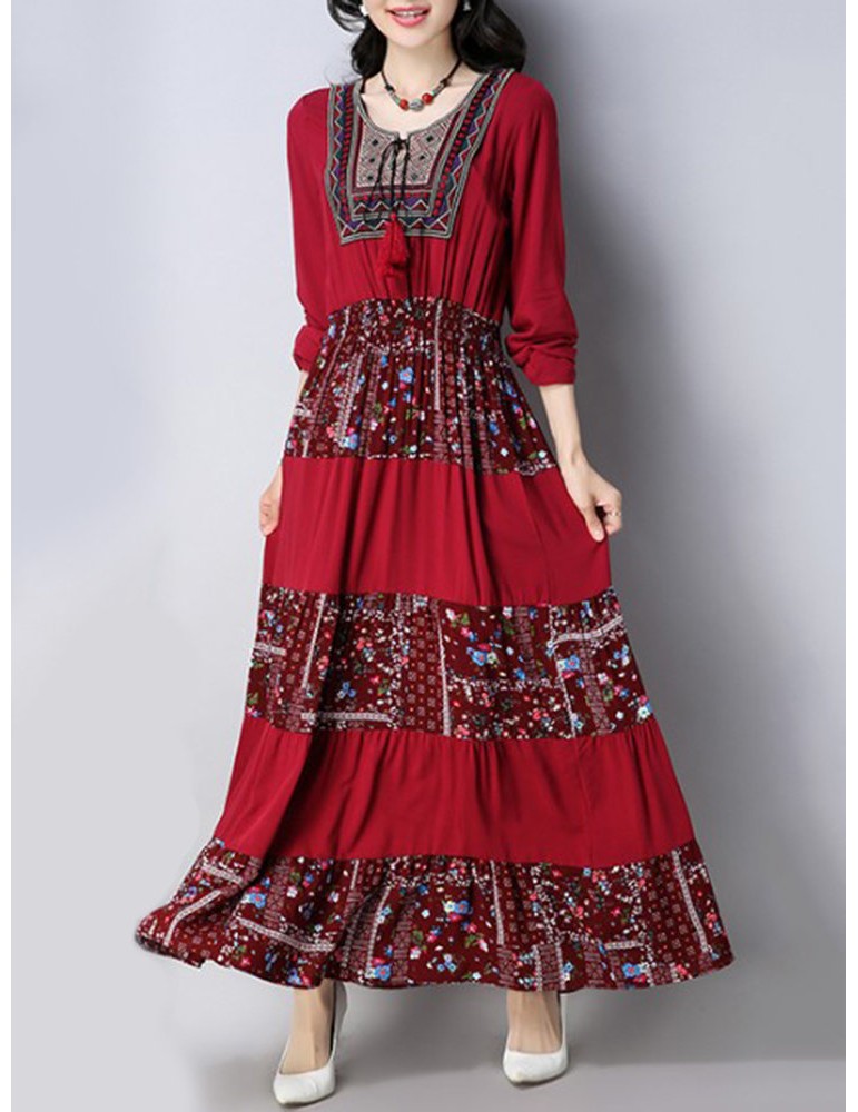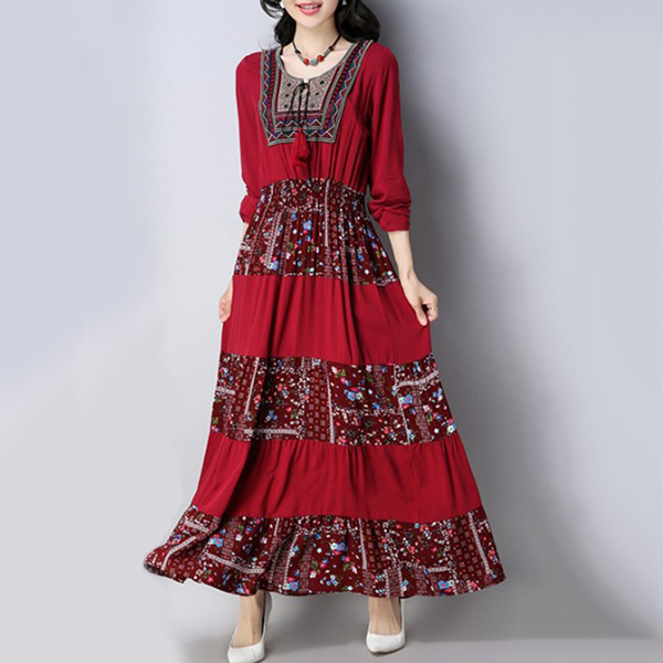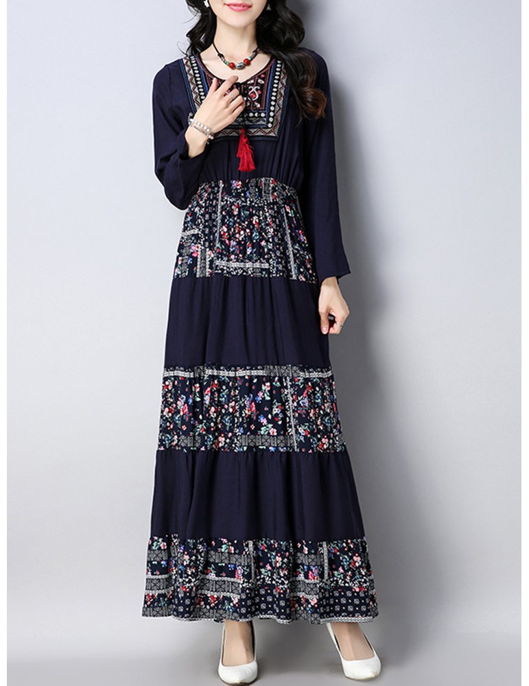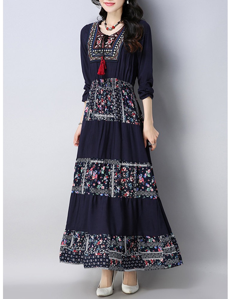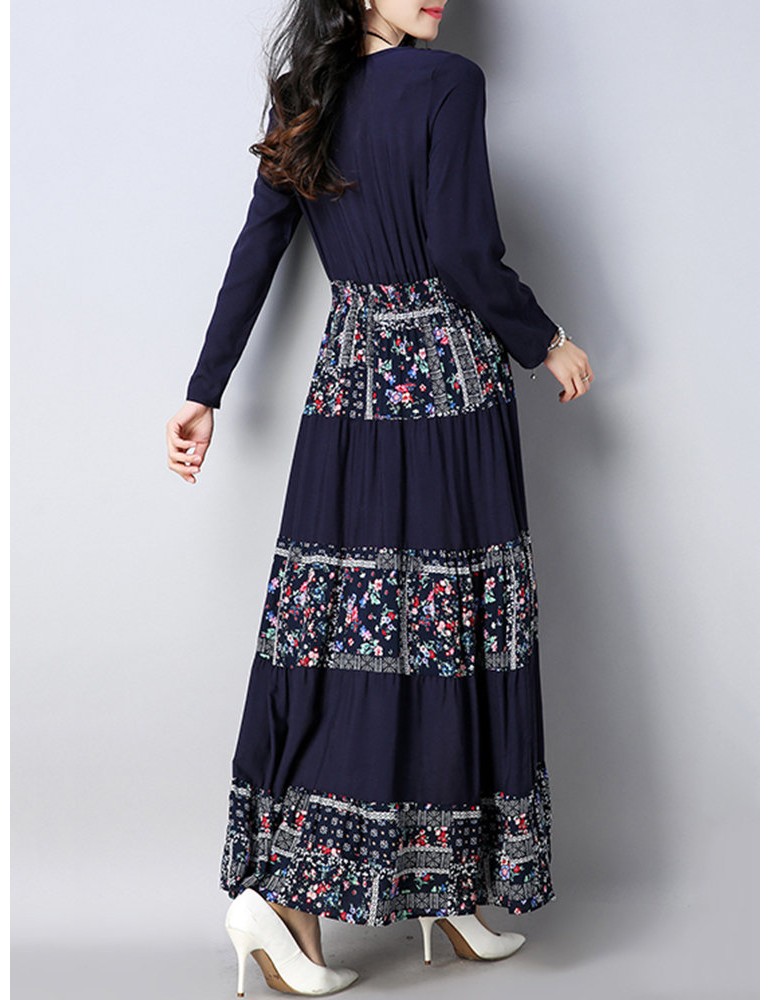 Vintage Floral Print Patchwork O-neck Long Sleeve Women Dresses
