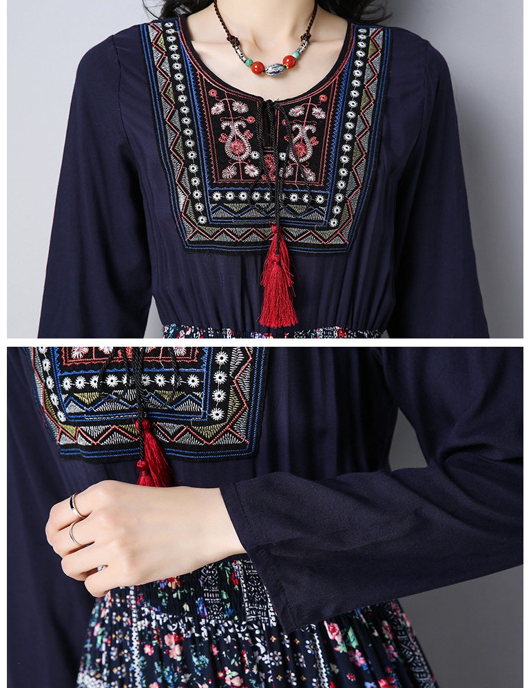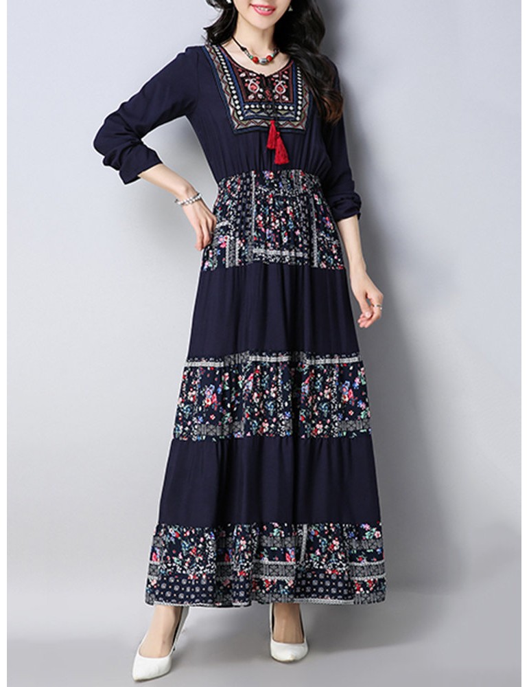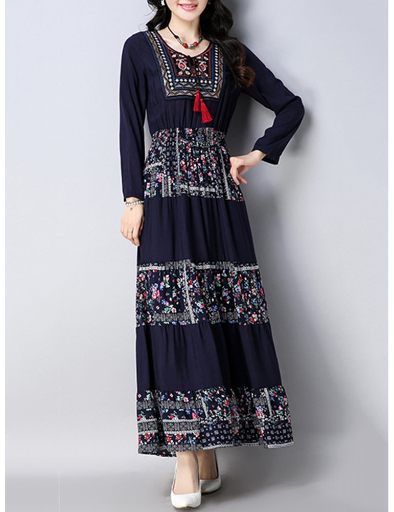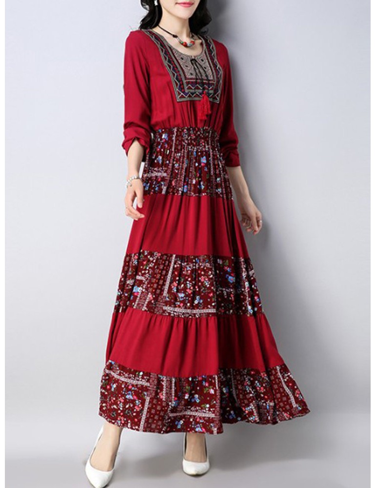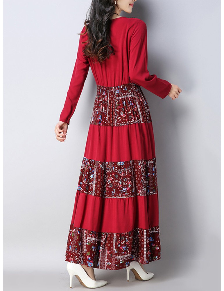Vintage Floral Print Patchwork O-neck Long Sleeve Women Dresses