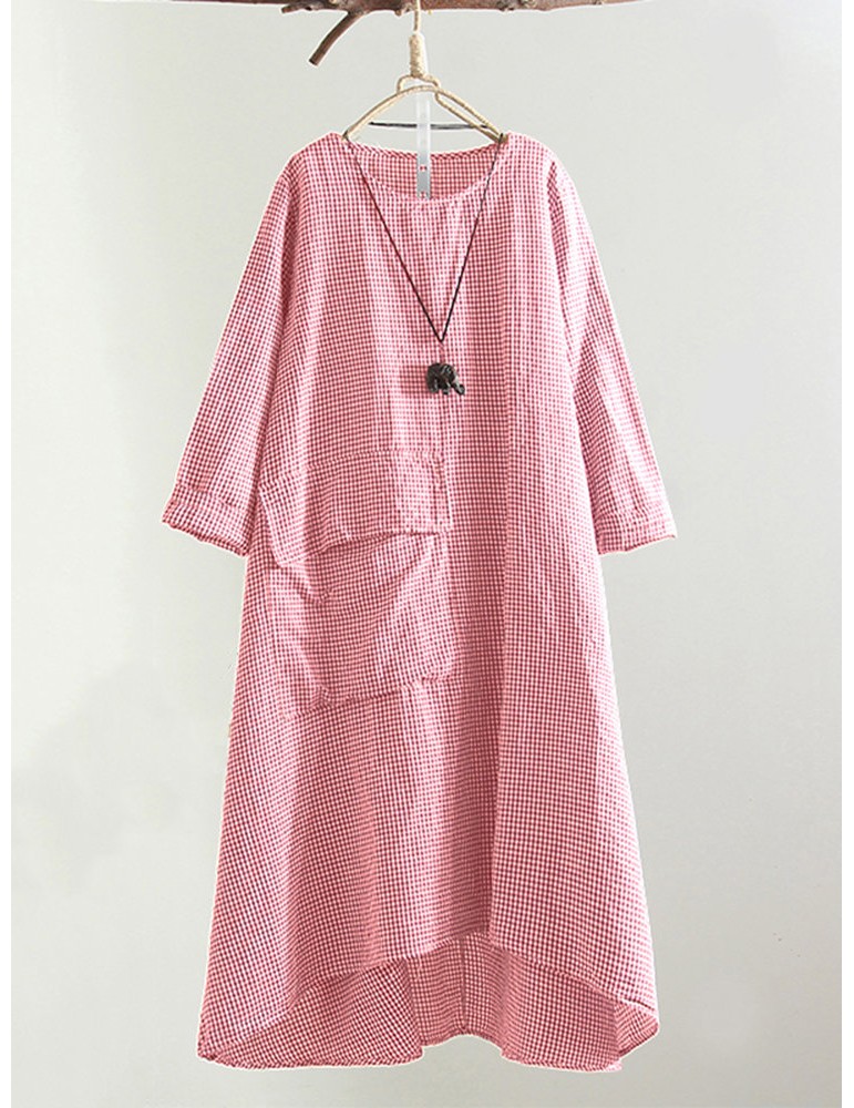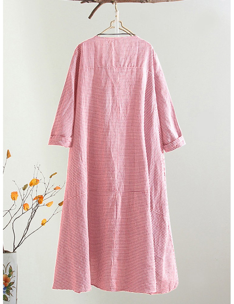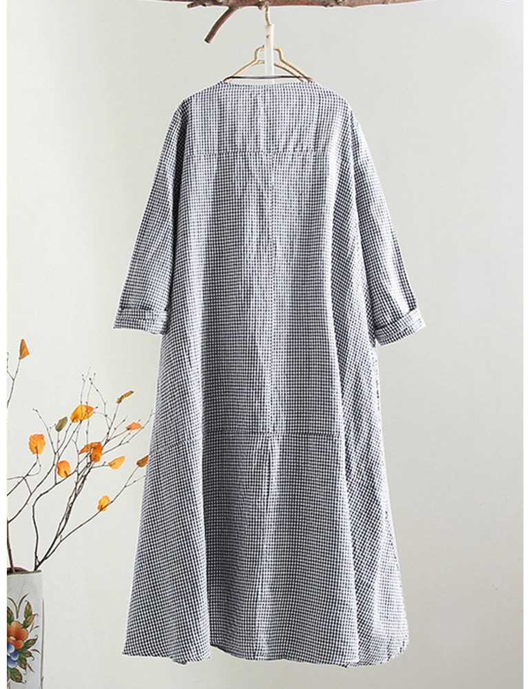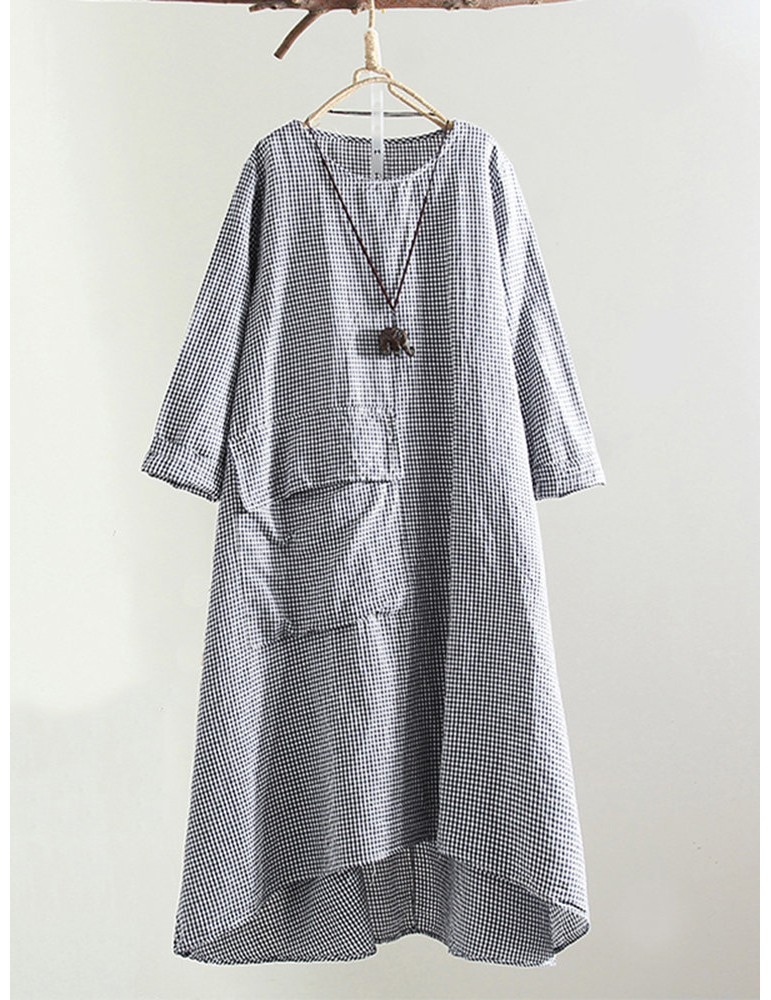 Vintage Print Plaid Long Sleeve Crew Neck Dress