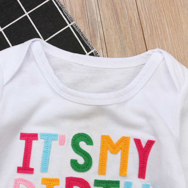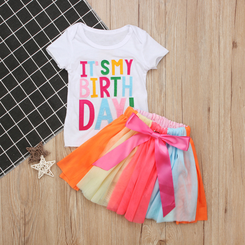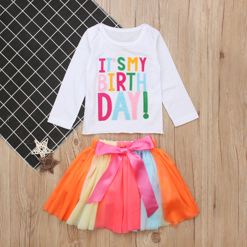 2Pcs Toddlers Girls Colorful Letter Tops Shirt+Lace Skirt Kids Birthday Outfits Set For 1Y-9Y